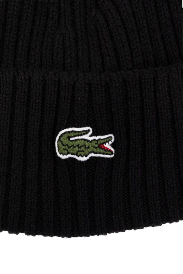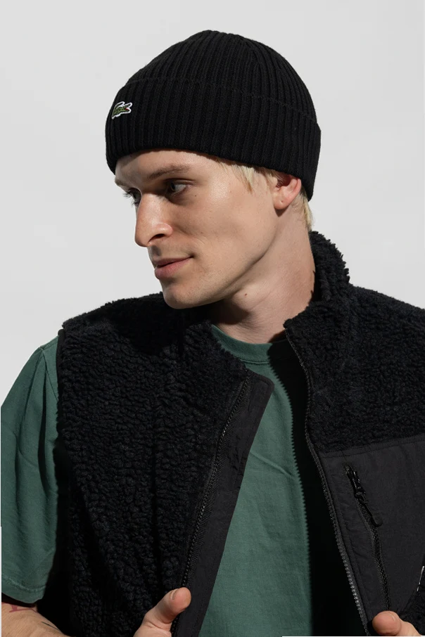 Navy ribbed beanie from Lacoste. Made of wool, this item showcases the brand’s signature logo patch.