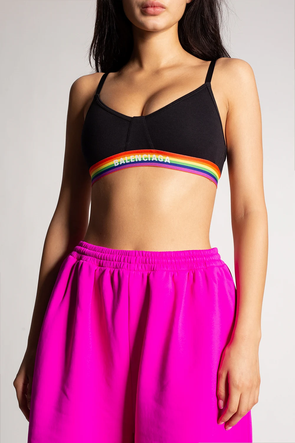 Black bra from Balenciaga. Made of cotton, this design features adjustable straps, elastic rainbow tape and a white logo.