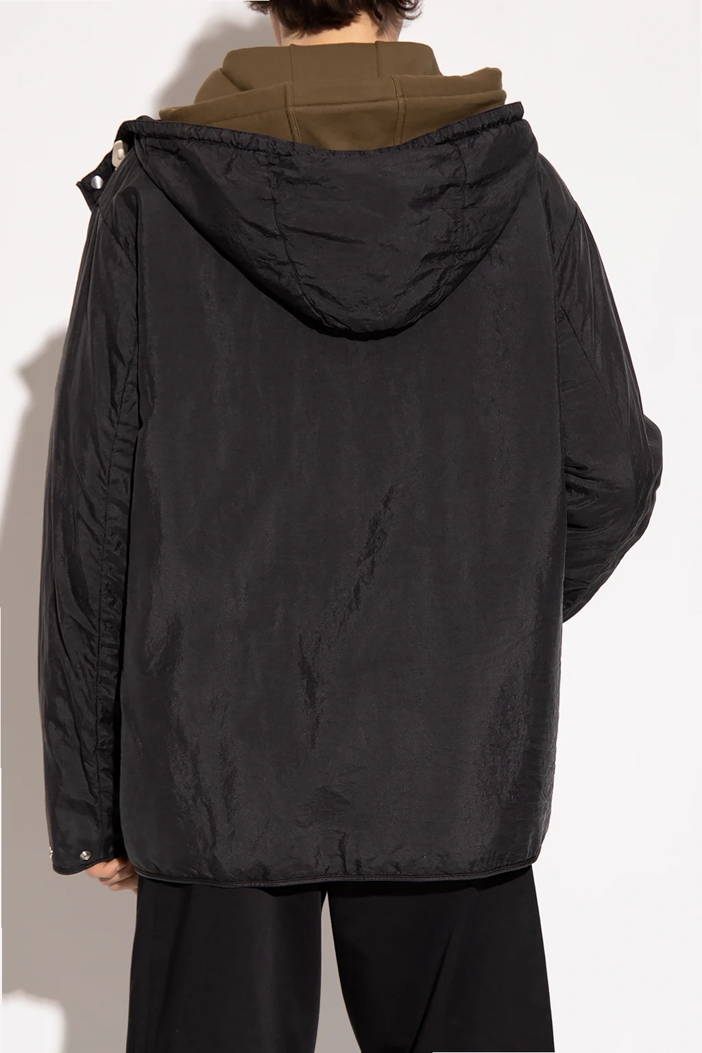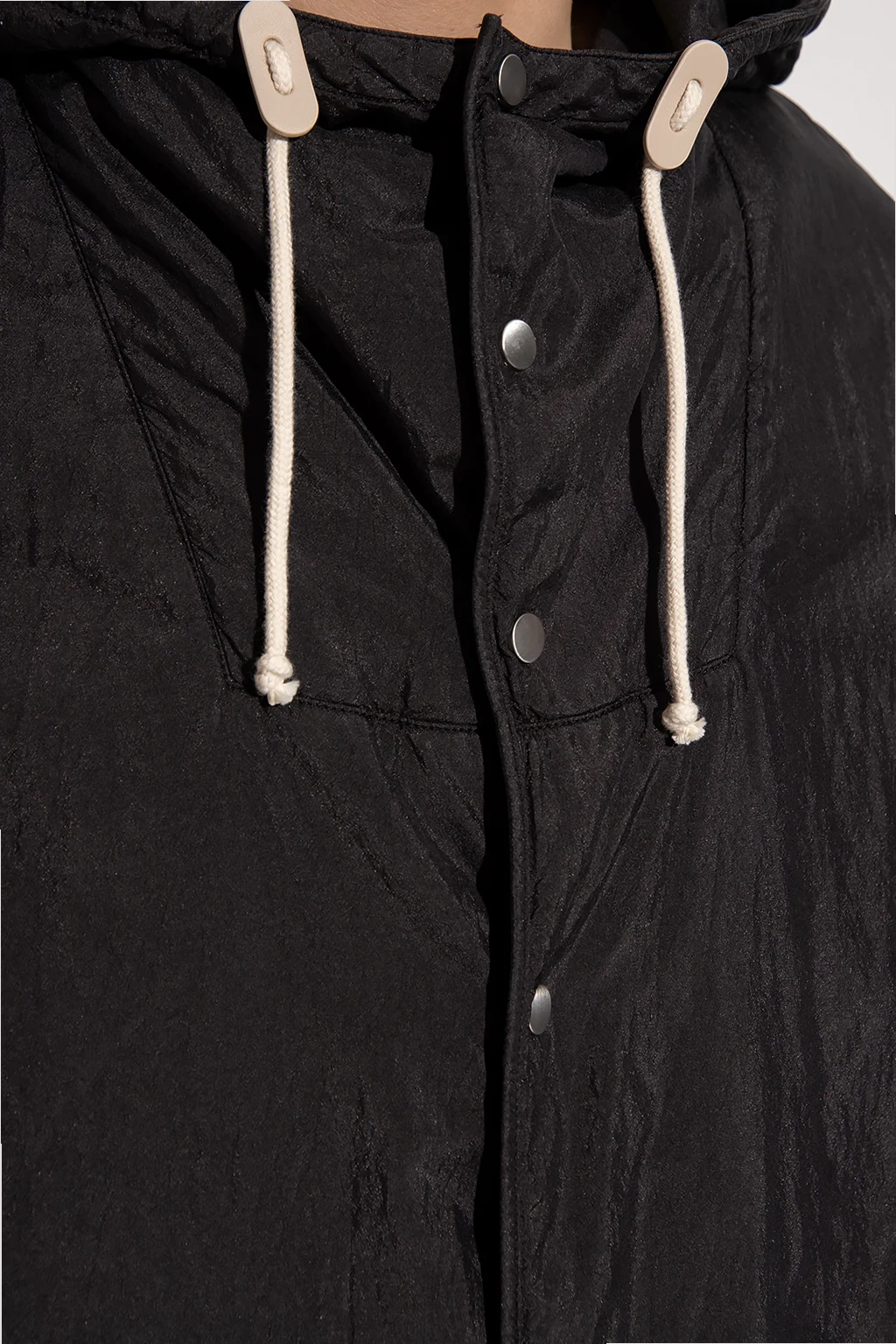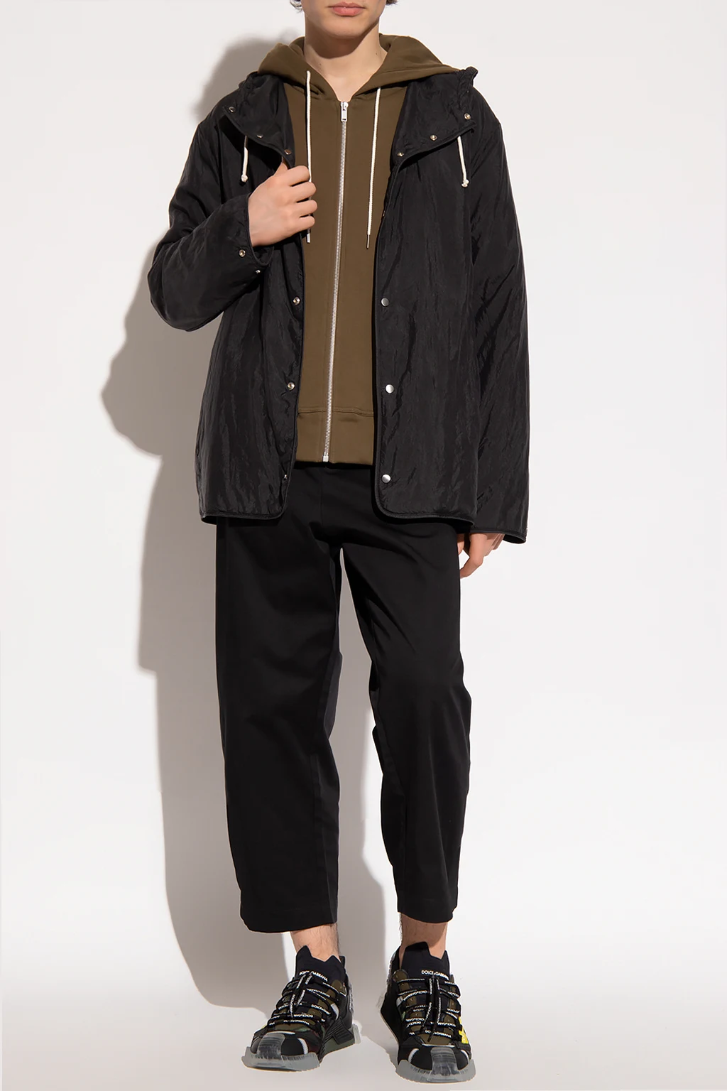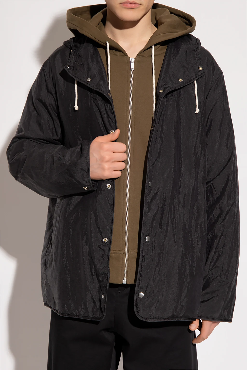 Black insulated jacket from Jil Sander +. Fastened with snaps, this garment features a drawstring hood and snap-fastened cuffs.