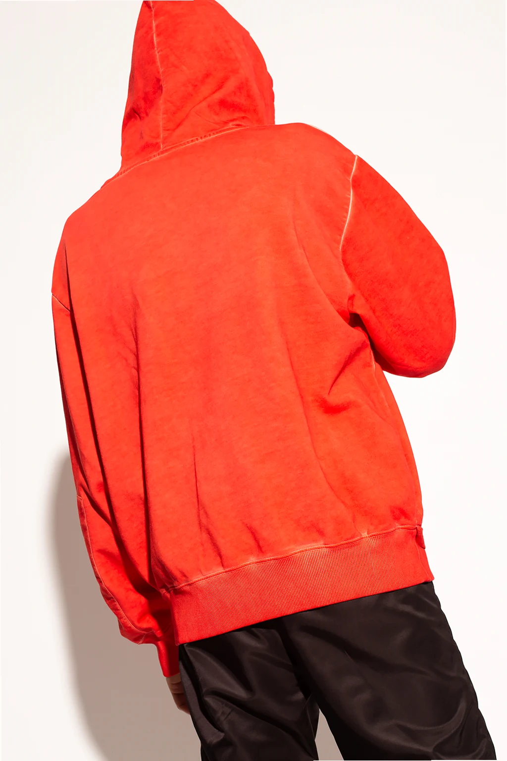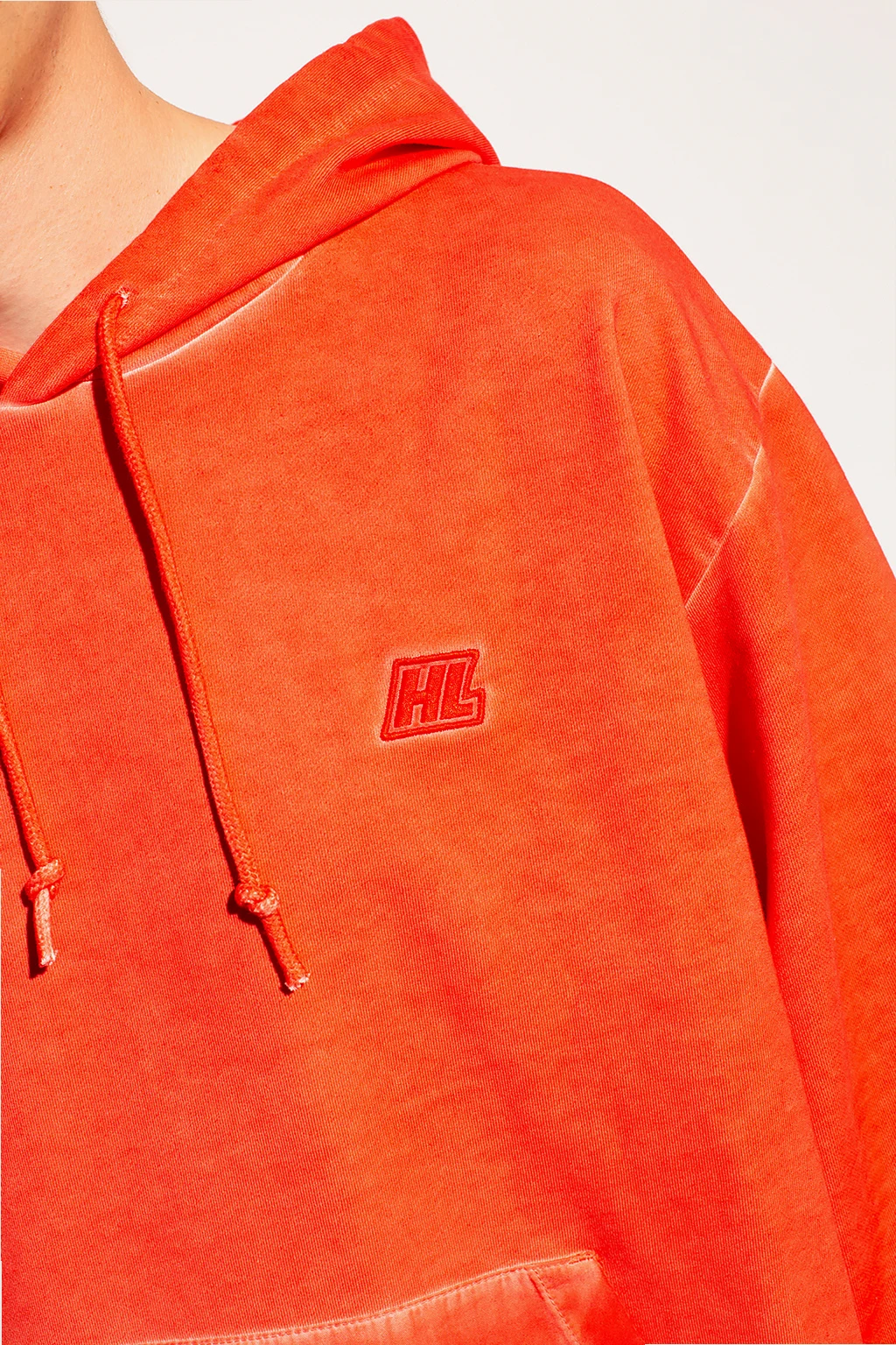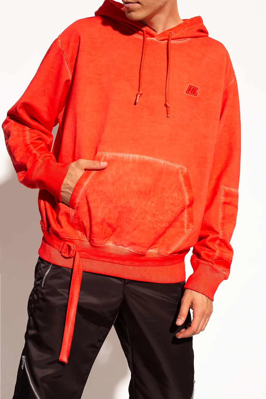 Red sweatshirt with a drawcord-adjustable hood from Helmut Lang. Crafted from cotton jersey, this hoodie showcases a kangaroo pocket and an embroidered logo on the front and rib detailing on the bottom hem and cuffs.
