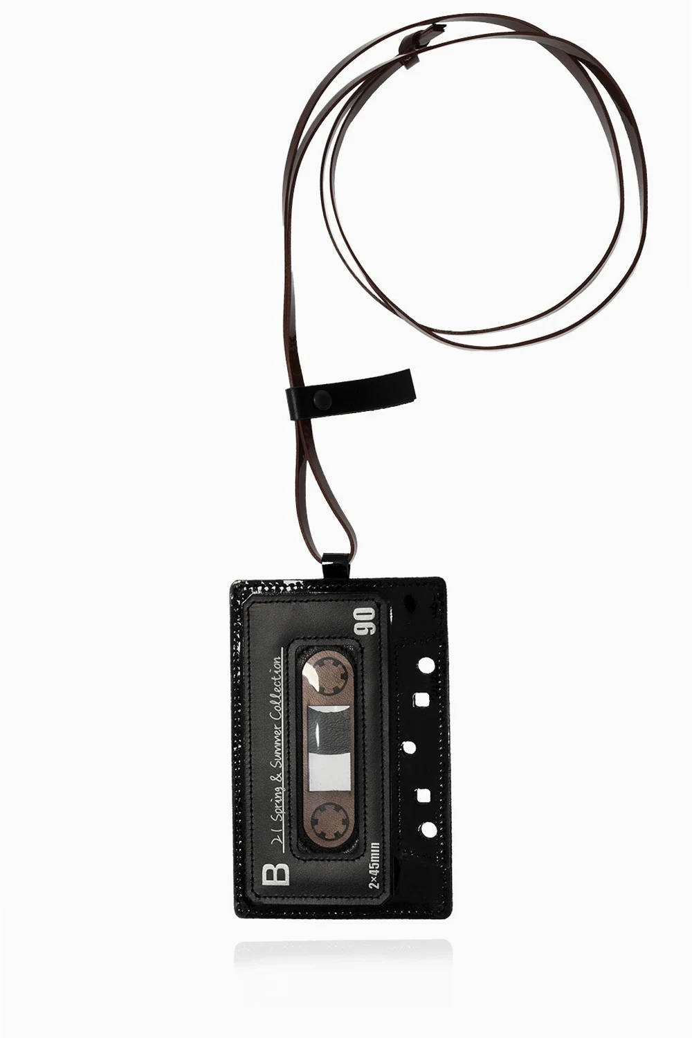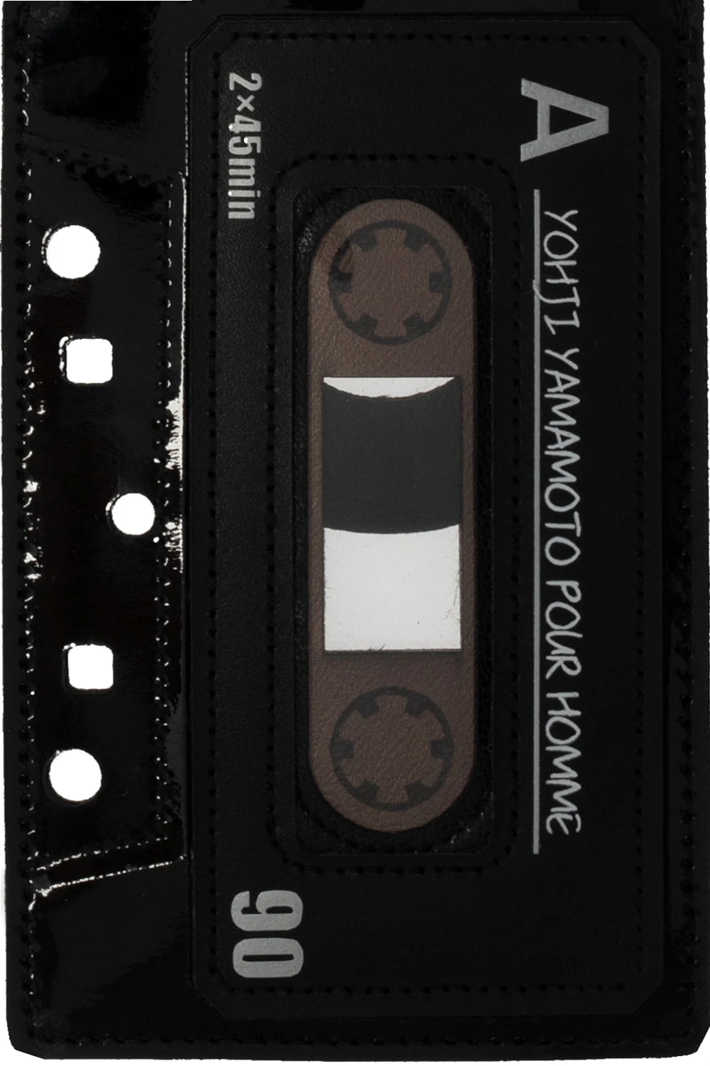 Black card case from Yohji Yamamoto. Crafted from calf leather, this item showcases white logo prints and cut-out details. It is complete with one card slot and an attached brown strap.
