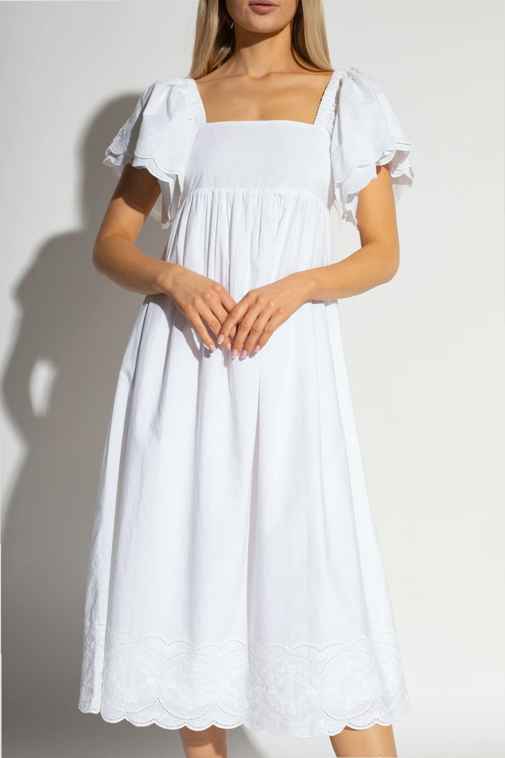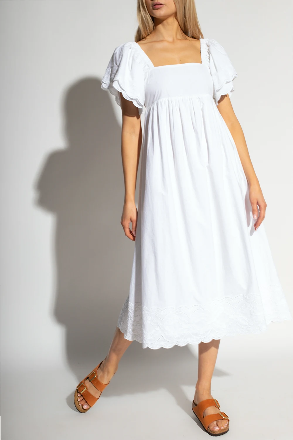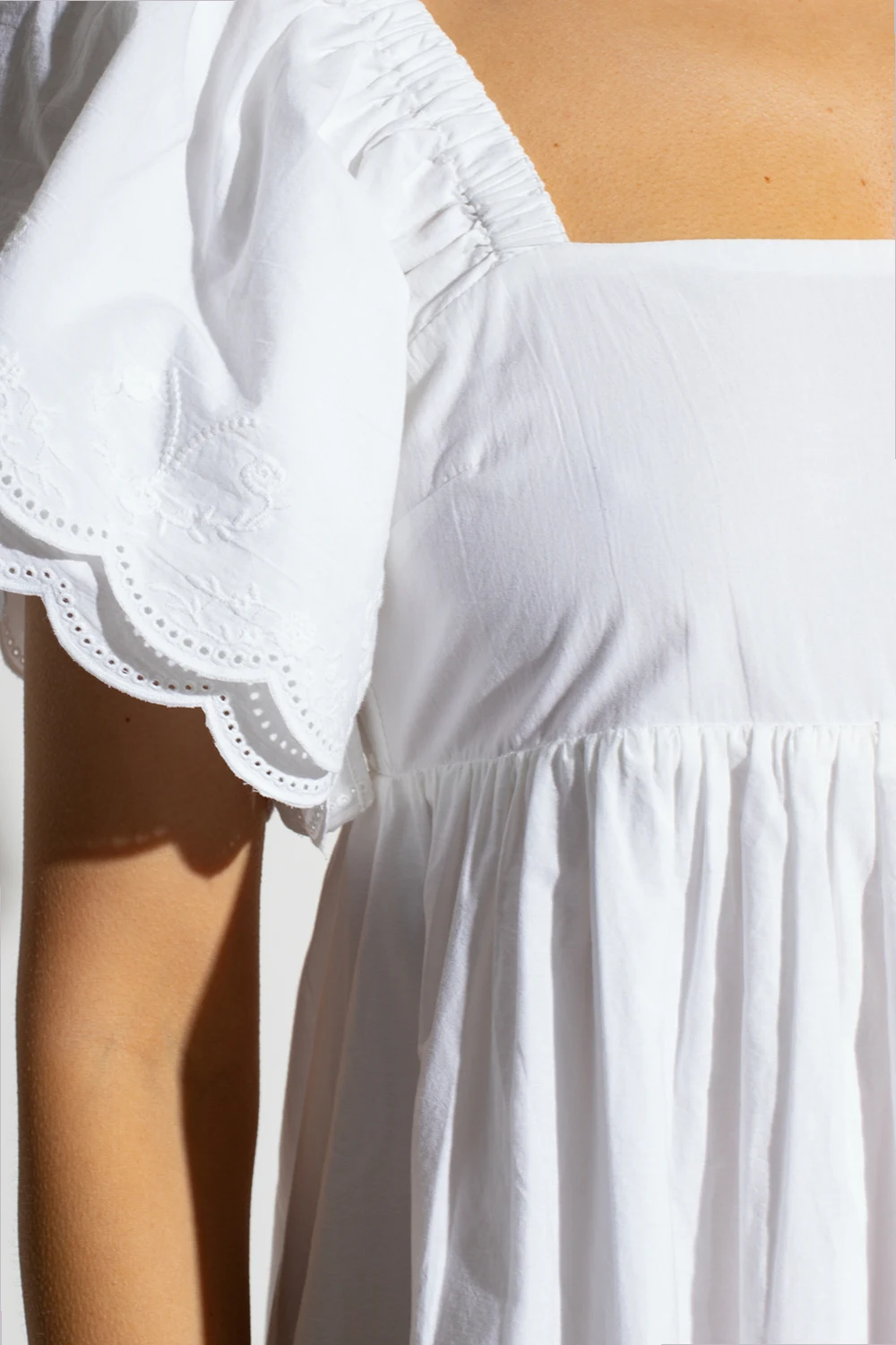 White ‘Doris’ dress from Notes Du Nord. Made of cotton, this design is complete with an empire waist, gathers at the back, ribbed square neck, flared skirt and loose sleeves with an embroidery and openwork pattern.
