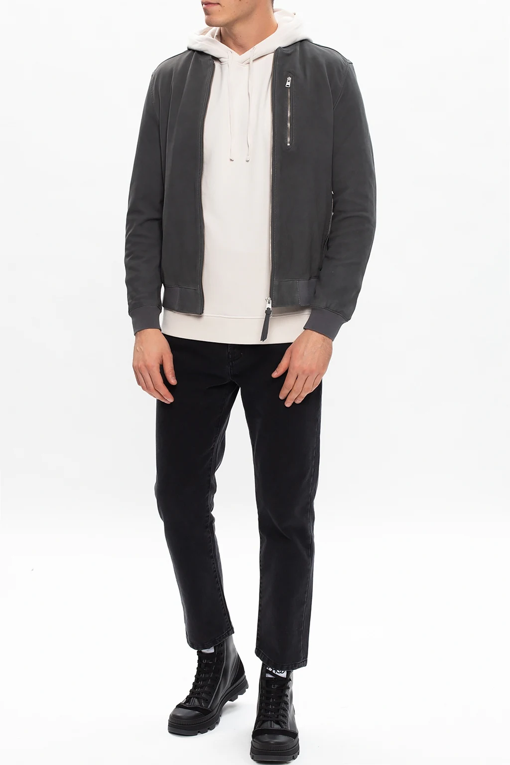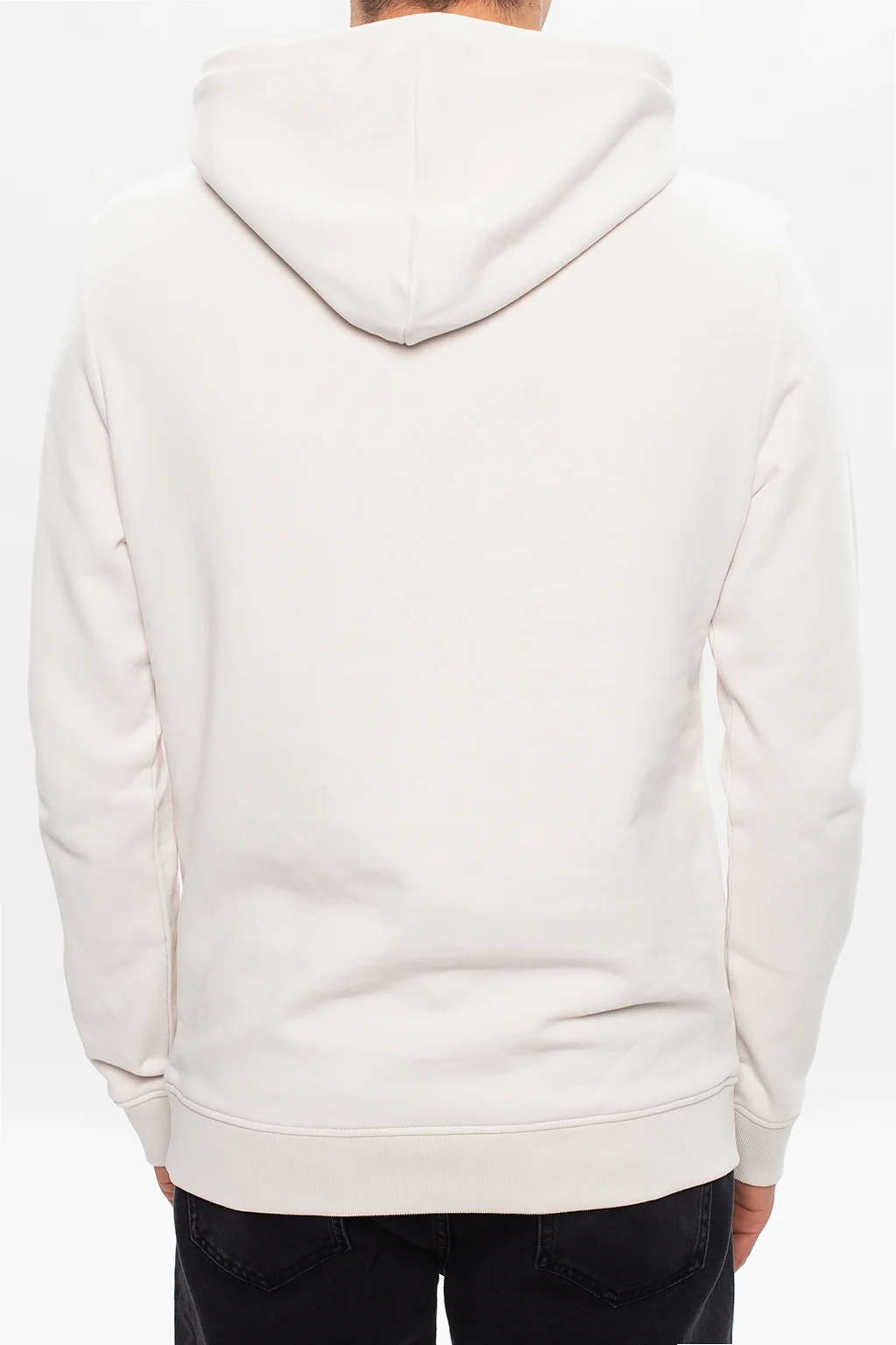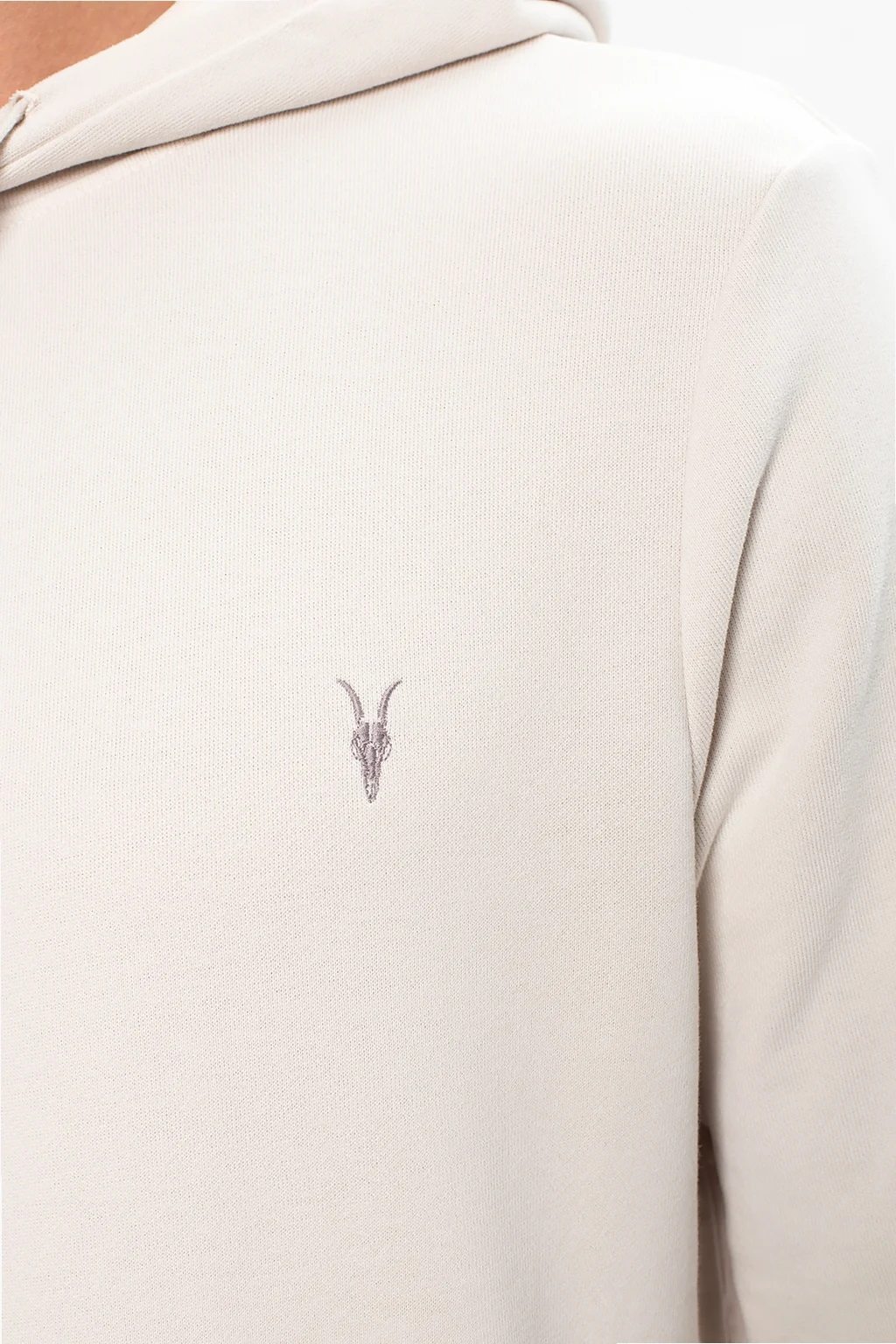 Cream \'Raven\' sweatshirt with a drawcord-adjustable hood from AllSaints. Embroidered with the brand\'s iconic Ramskull logo in grey, this cotton-crafted hoodie is complete with a kangaroo pocket and ribbed finishes at the bottom hem and cuffs.