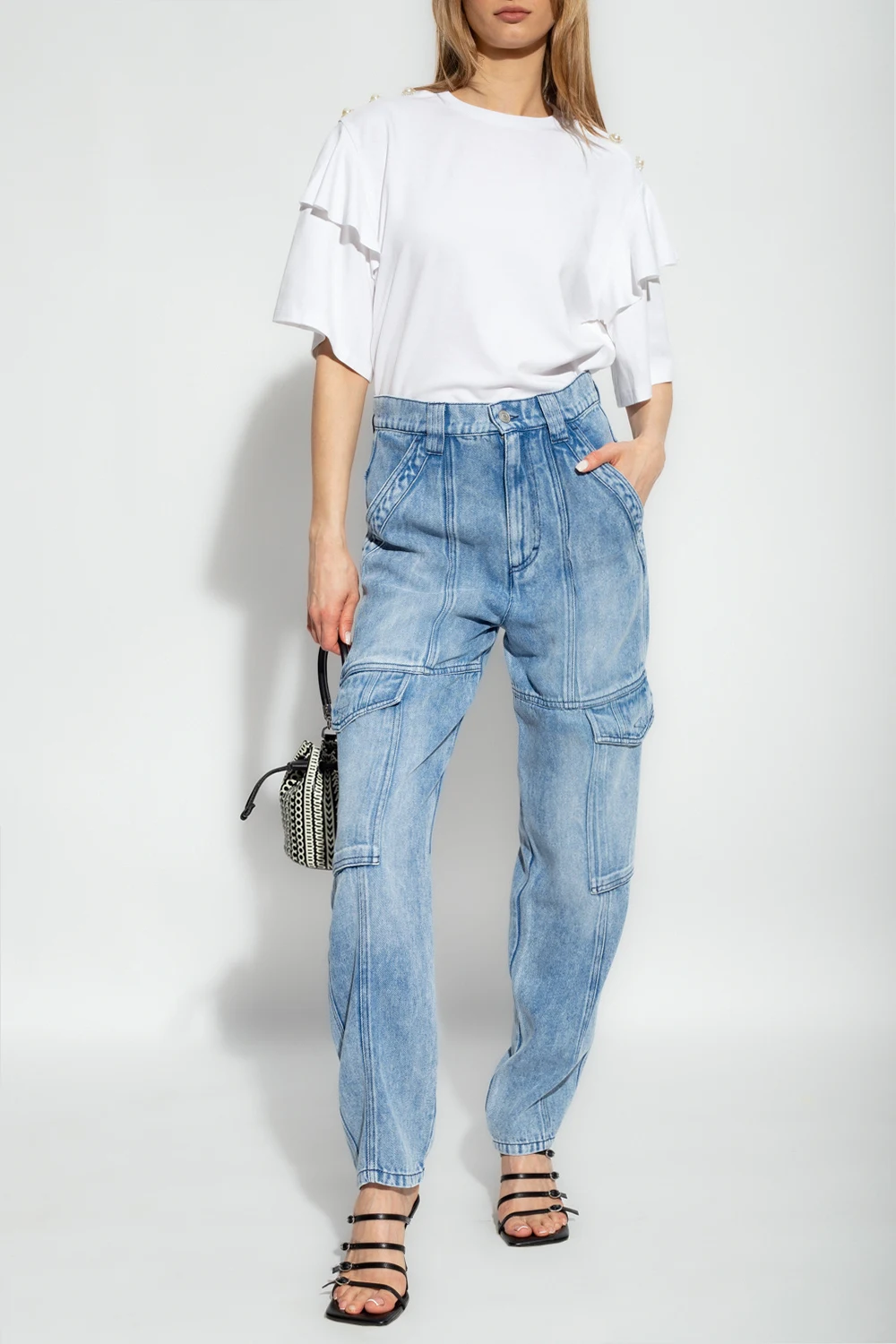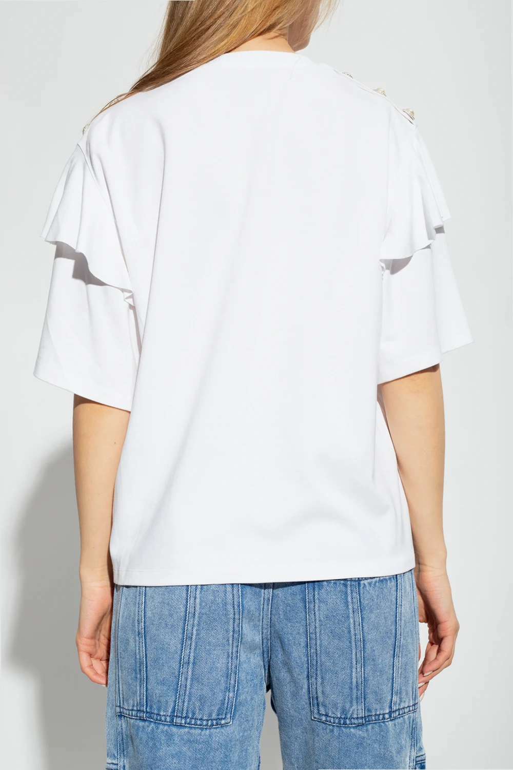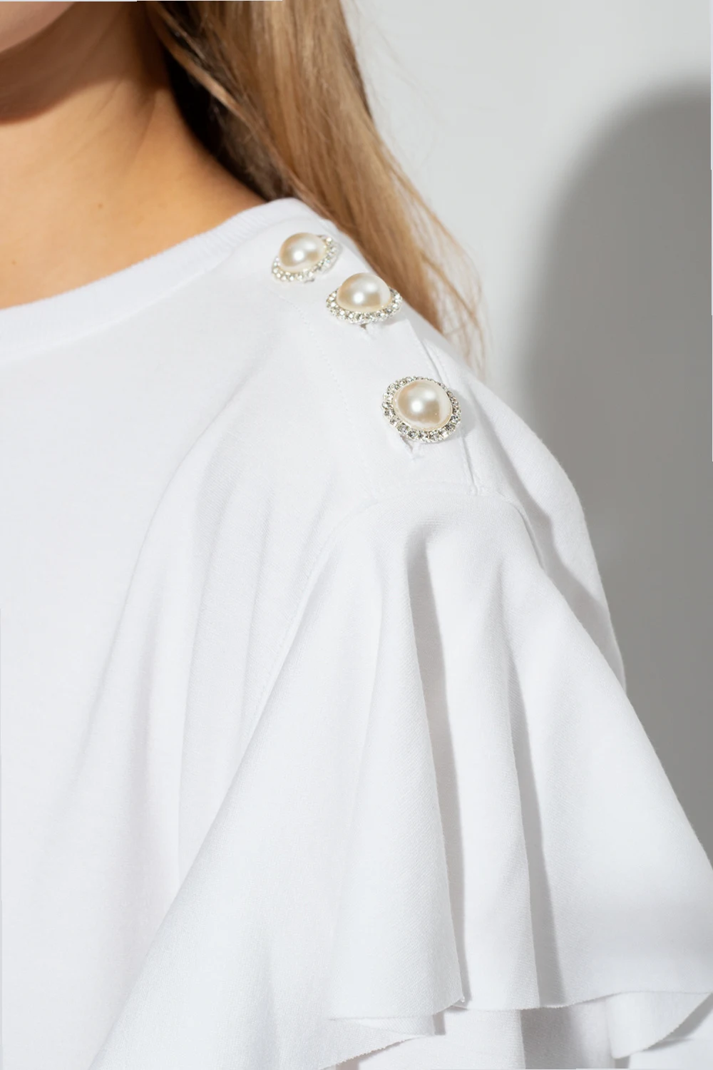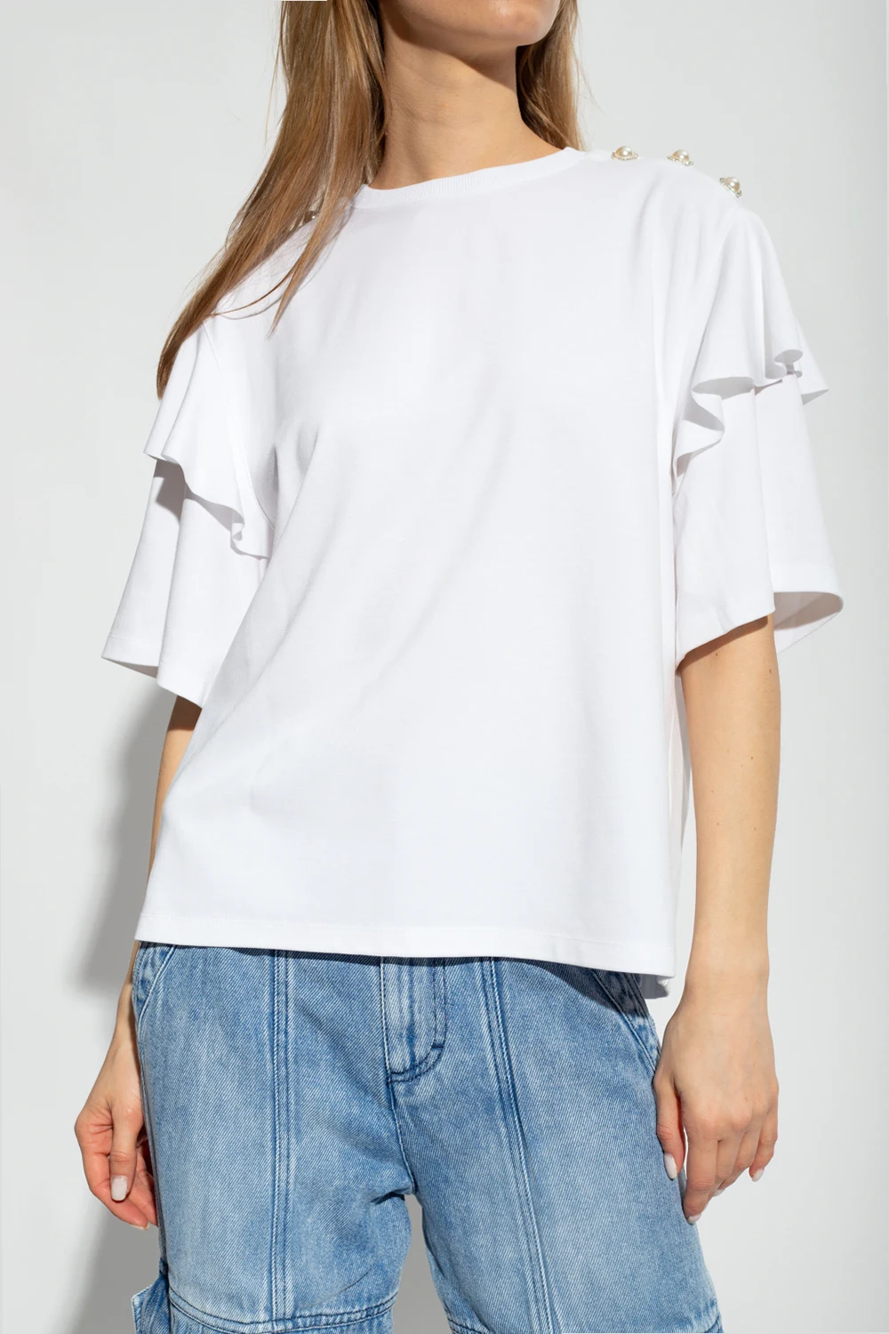 White top ‘Martina’ top form Custommade. This short sleeve design features appliqués and ruffle at the shoulders as well as a ribbed crew neck.