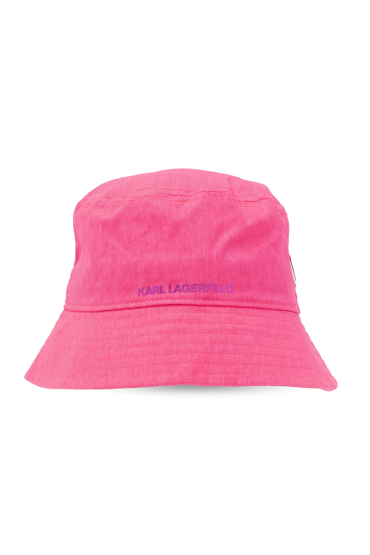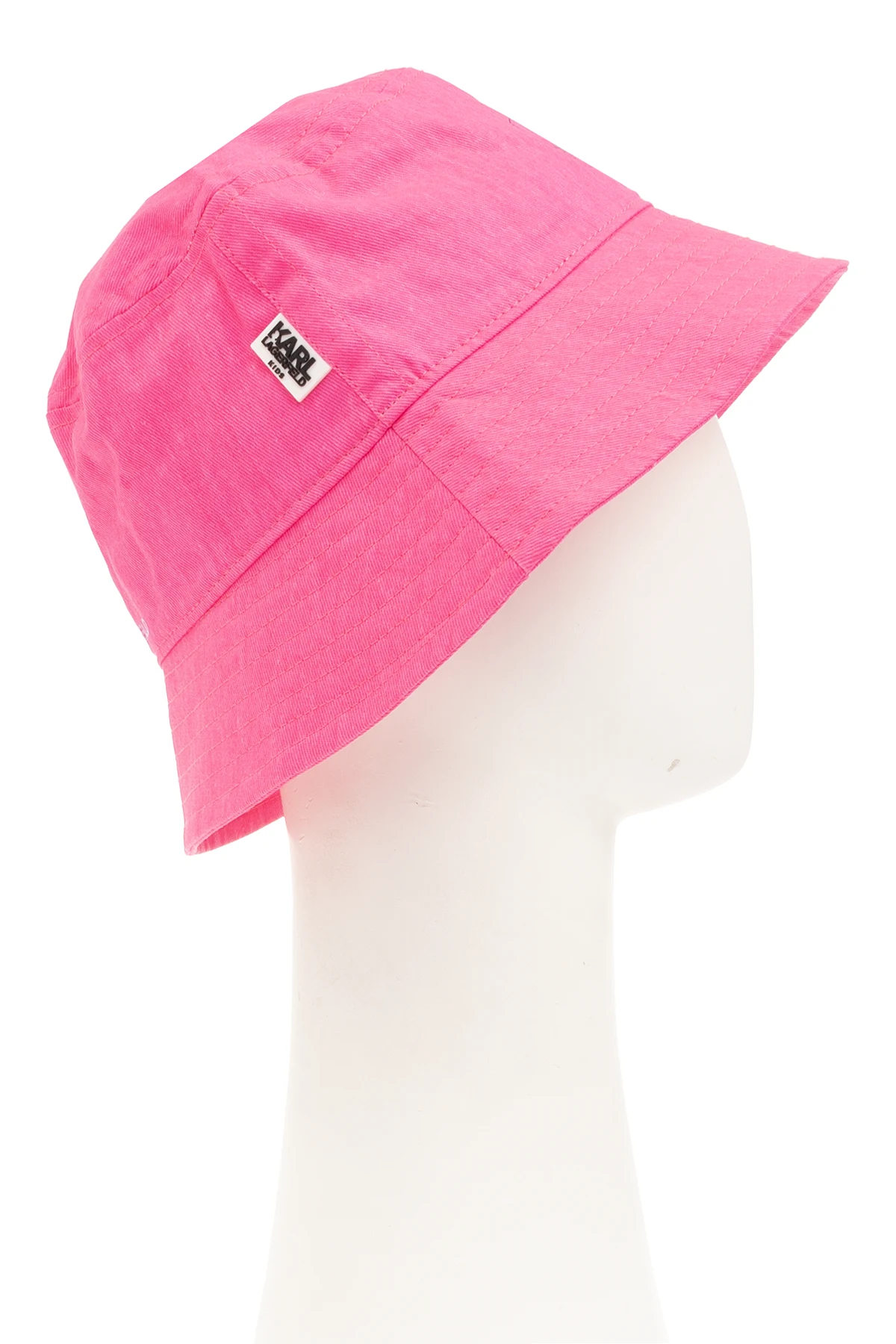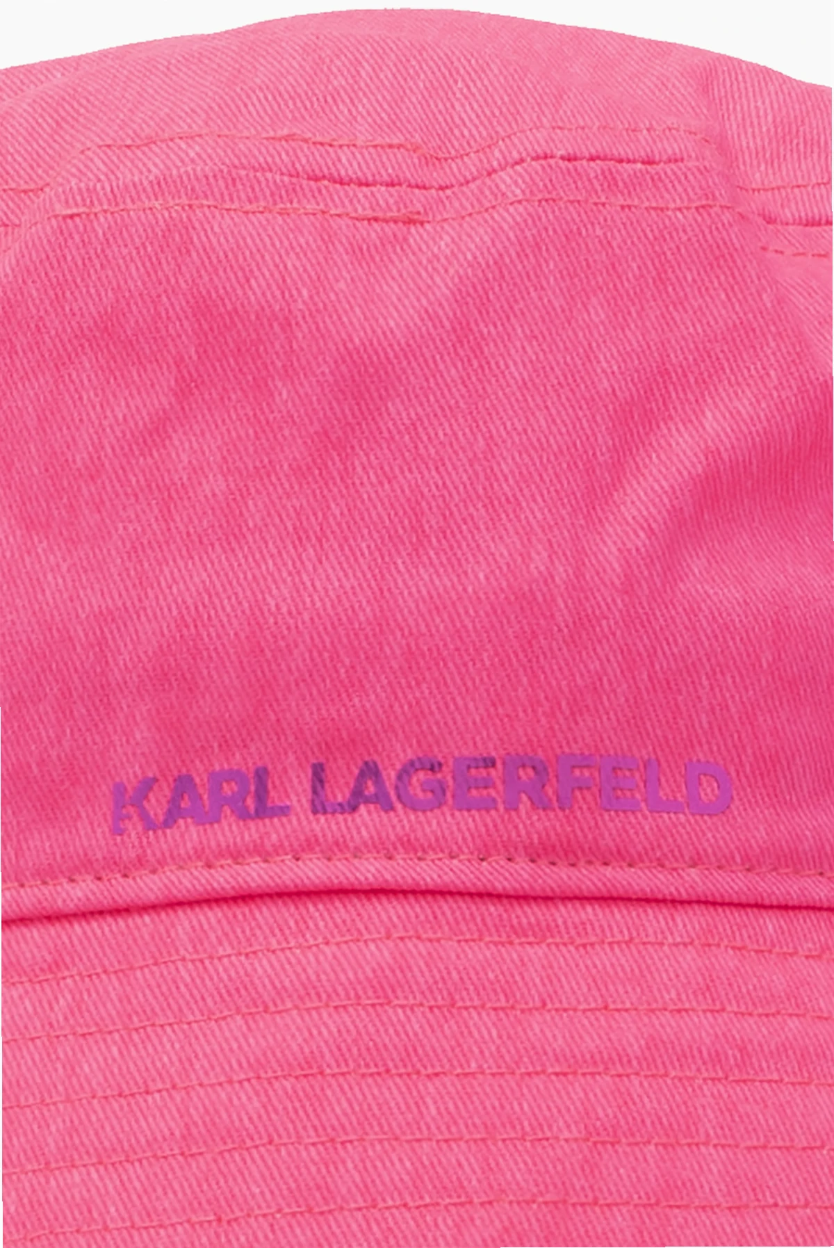 Neon pink bucket hat with a metallic logo print from Karl Lagerfeld Kids. Made of cotton.