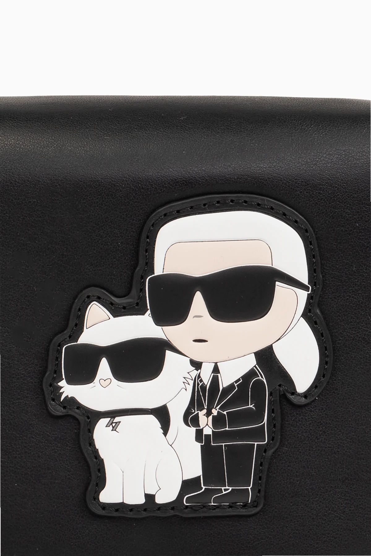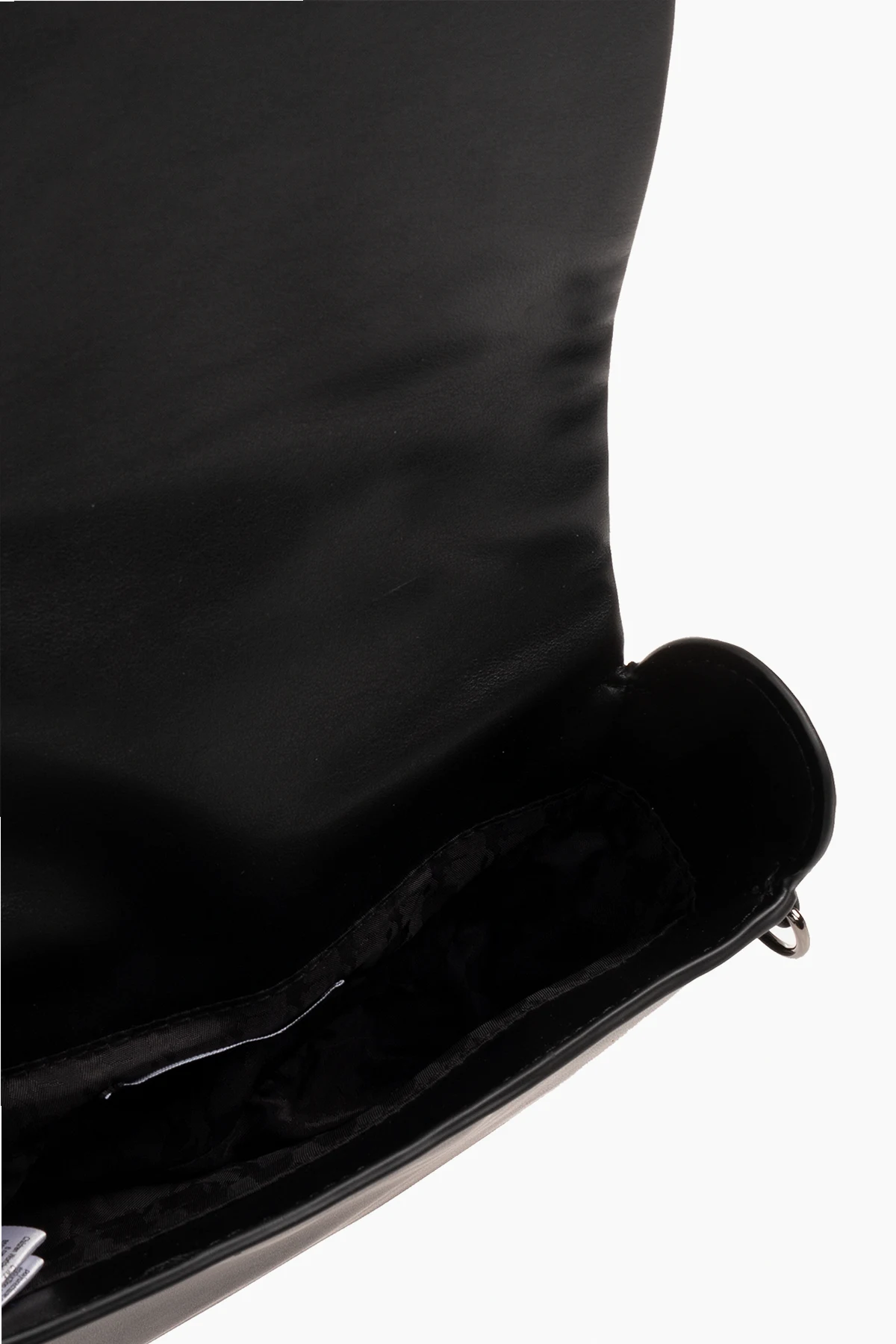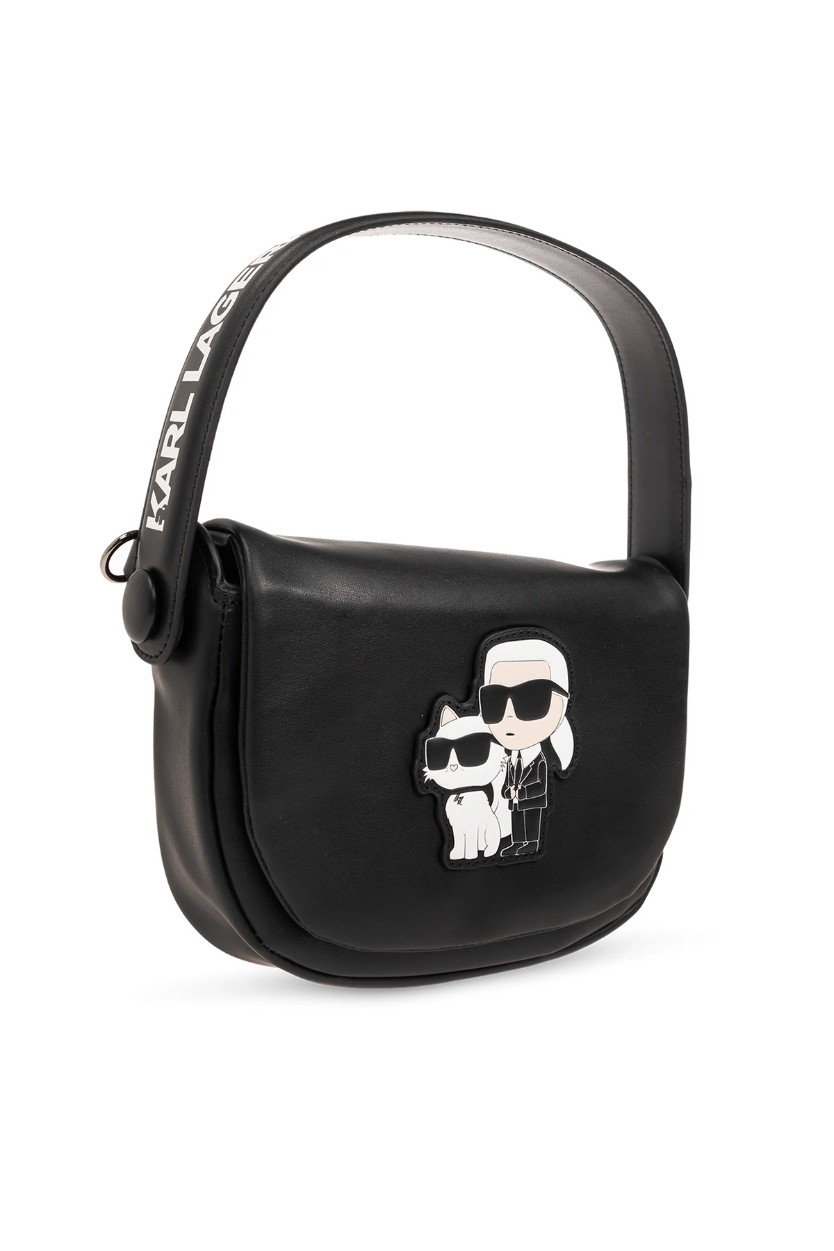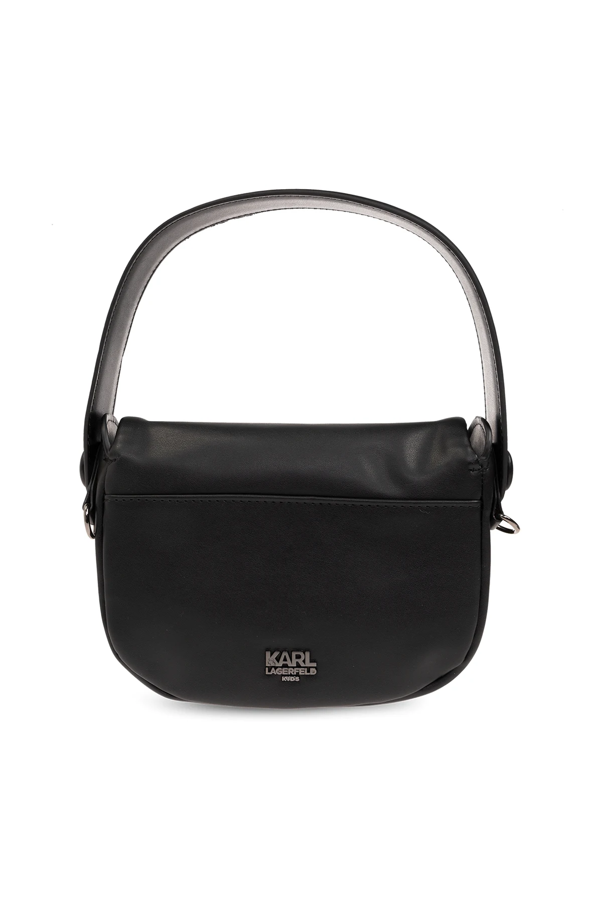Black shoulder bag from Karl Lagerfeld Kids. Made of faux leather, this model features a magnetic snap closure, logo patch on the front, metal logo detail at the back, half-round handle, detachable and adjustable shoulder strap, one internal compartment and dark silver-tone metal hardware.