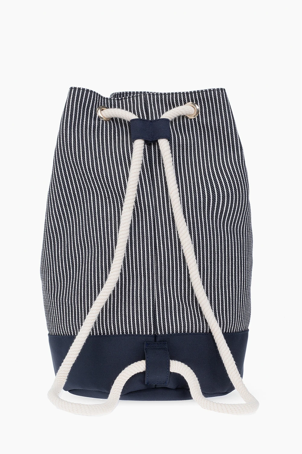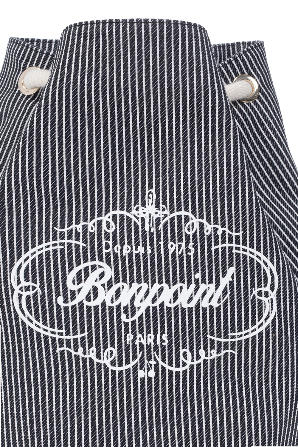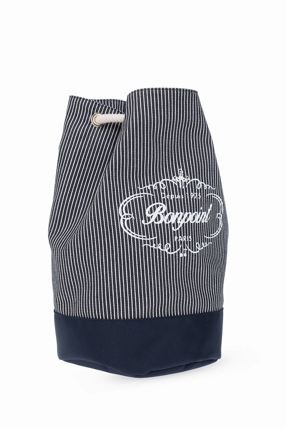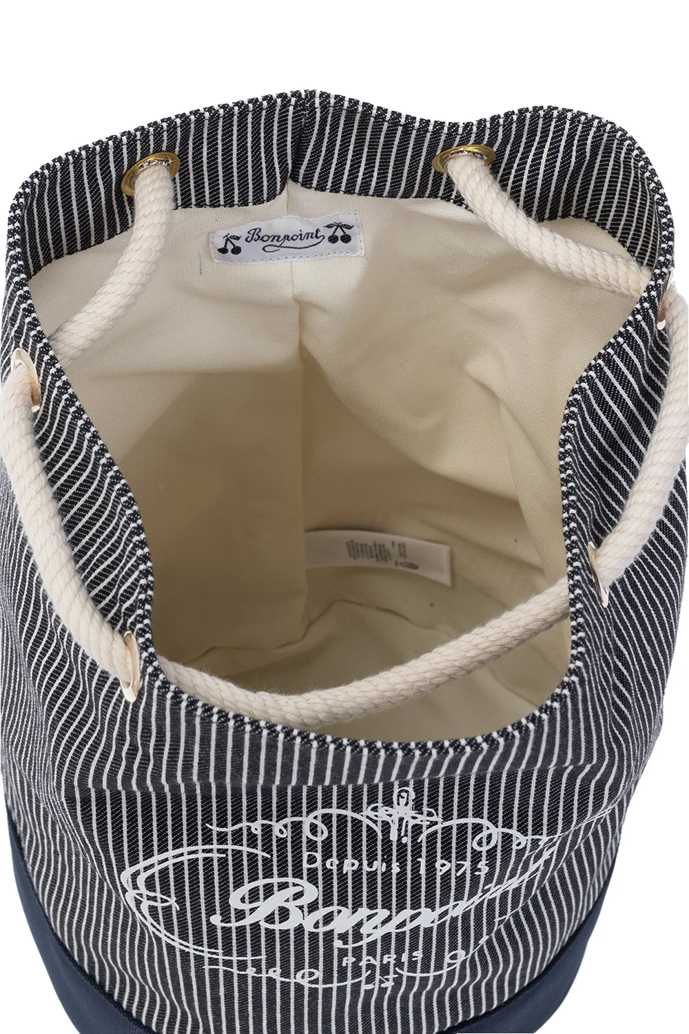 Navy and white backpack from Bonpoint. Made of cotton, this garment features drawstrings, ribbed pattern, white logo print and one internal compartment.