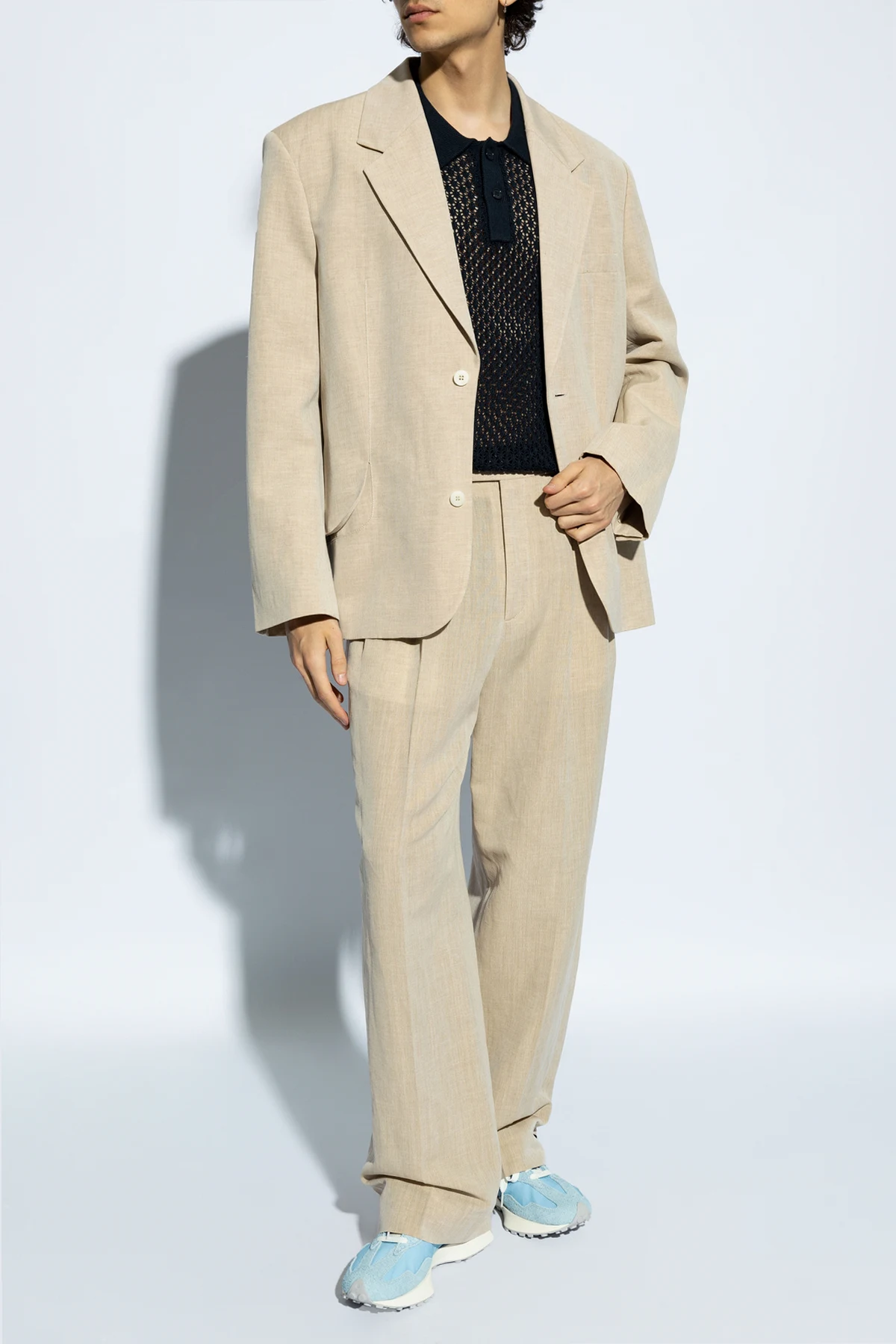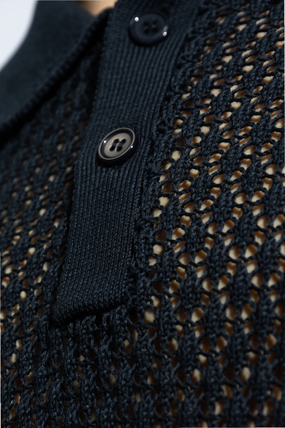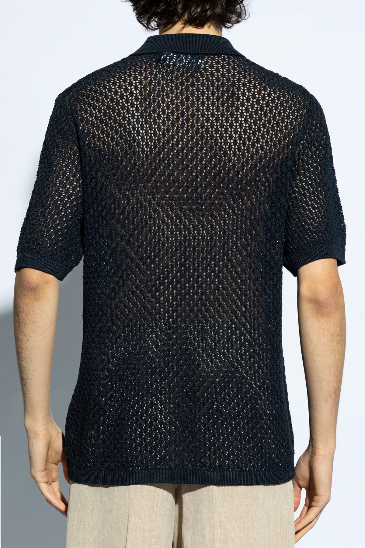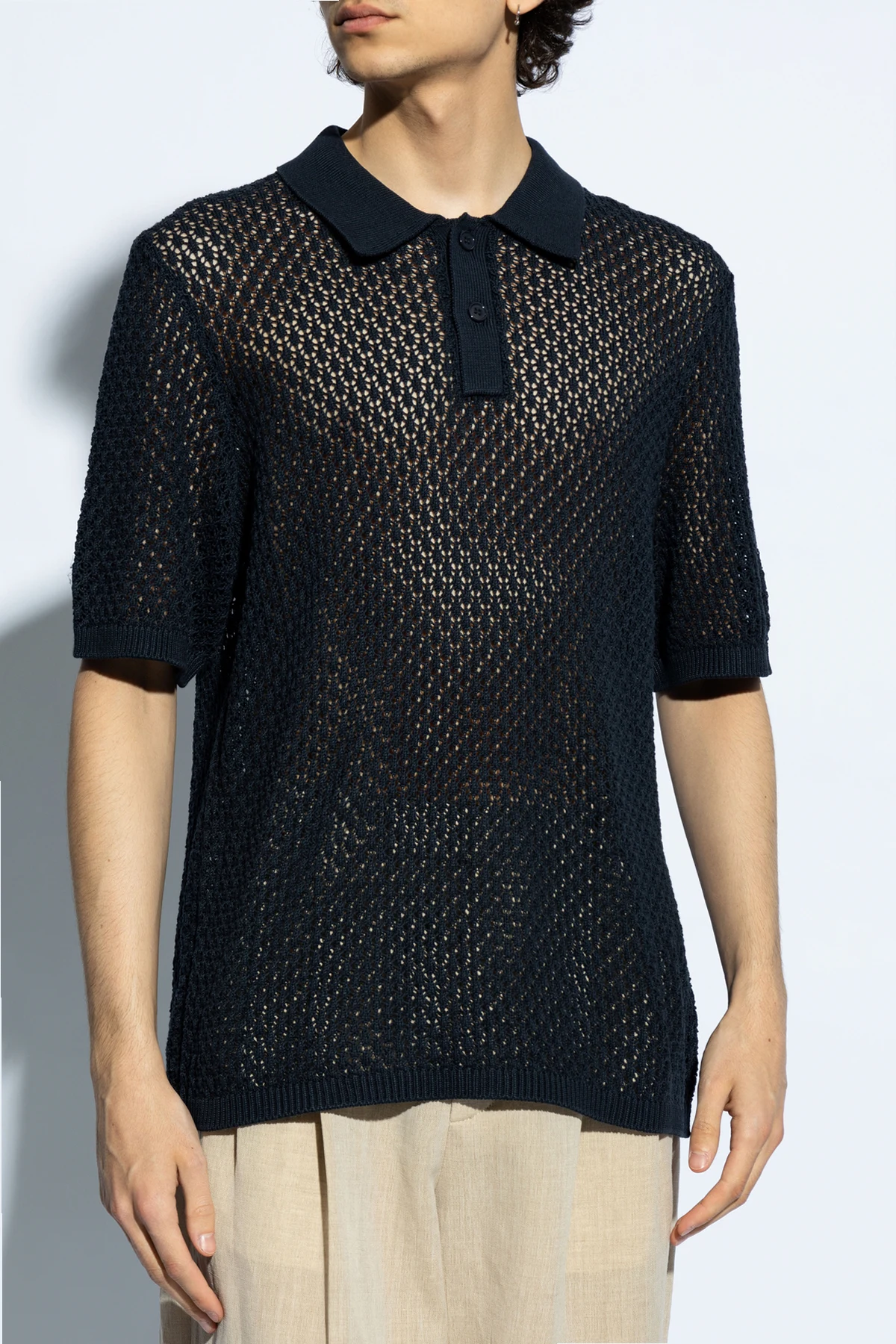 Introducing the \'Saterry\' Polo Shirt by Samsøe Samsøe, a sartorial masterpiece that redefines the boundaries of traditional polo shirts. Crafted from a premium, structured fabric, this navy piece showcases an exquisite interlaced, openwork pattern that imparts a unique, breathable aesthetic. Unlike conventional polos, the \'Saterry\' boasts a distinctive mesh effect, enhancing its visual and tactile appeal. The shirt\'s uniform navy hue is elegantly contrasted by a smooth fabric collar and placket, adorned with two sleek black buttons, harmonizing seamlessly with the shirt’s overall color scheme. Its round neckline and short sleeves contribute to its sophisticated yet comfortable silhouette, making it an ideal choice for discerning gentlemen. Whether layered under a light suit for a refined ensemble, as depicted on our model, or worn standalone to accentuate its intricate texture and craftsmanship, the \'Saterry\' Polo promises to elevate any wardrobe with its unparalleled design and quality. Why Purchase This Product? Exclusive Design: Offers a distinctive openwork pattern, setting it apart from traditional polos. High-Quality Material: Made from 100% cotton, ensuring comfort and durability. Versatile Styling: Perfect for both formal and casual occasions. Attention to Detail: Features contrasting collar and placket with meticulously chosen black buttons for a refined finish.