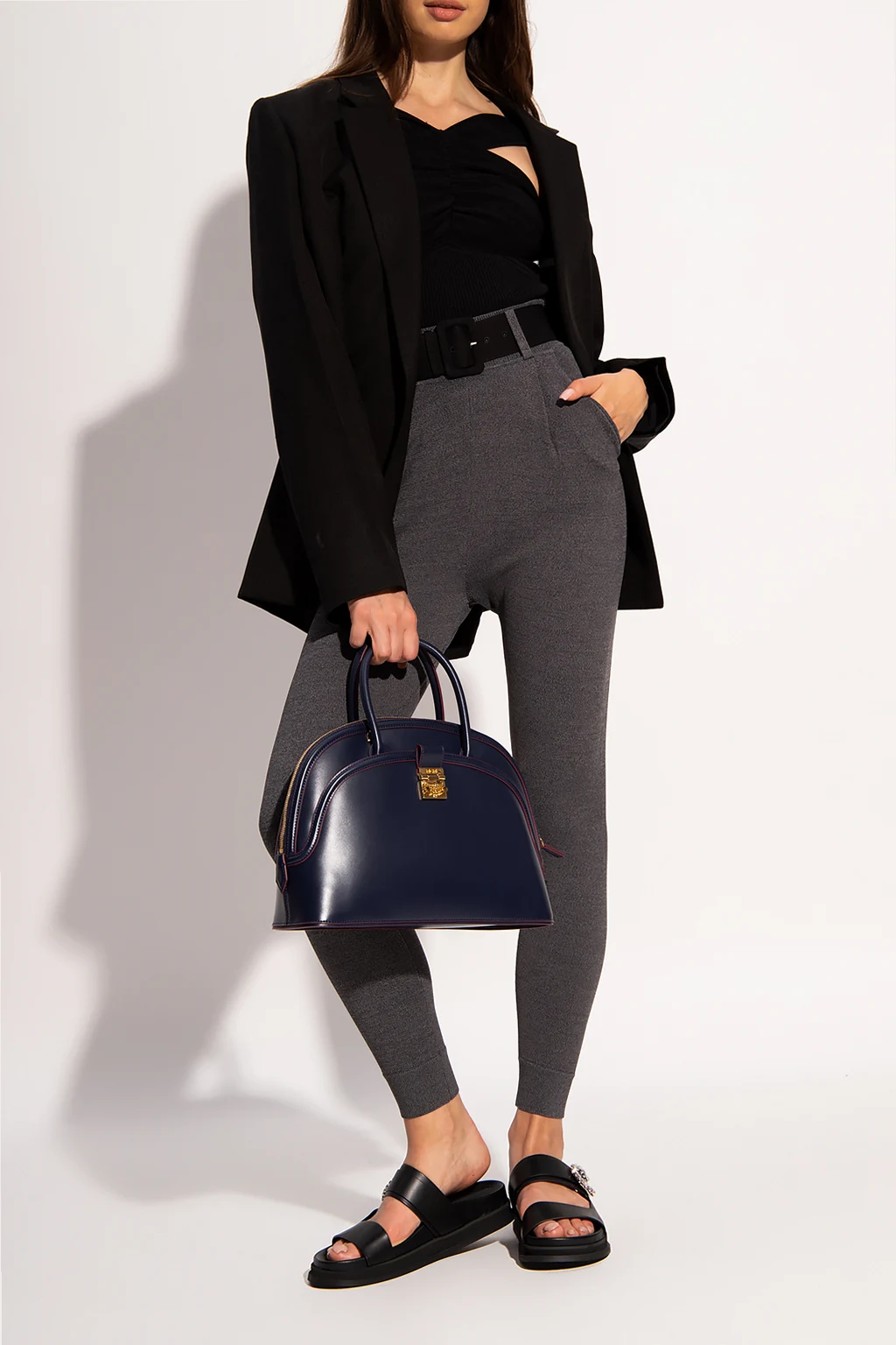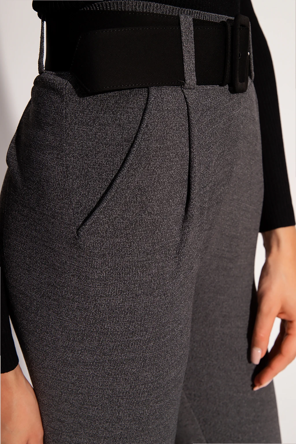 Grey trousers from Self-Portrait. Cut with a high-waisted silhouette, this pair features an elasticated waistband, two side seam pockets, elasticated cuffs and an included wide waist belt.