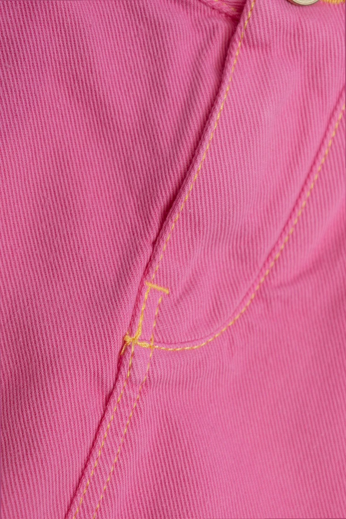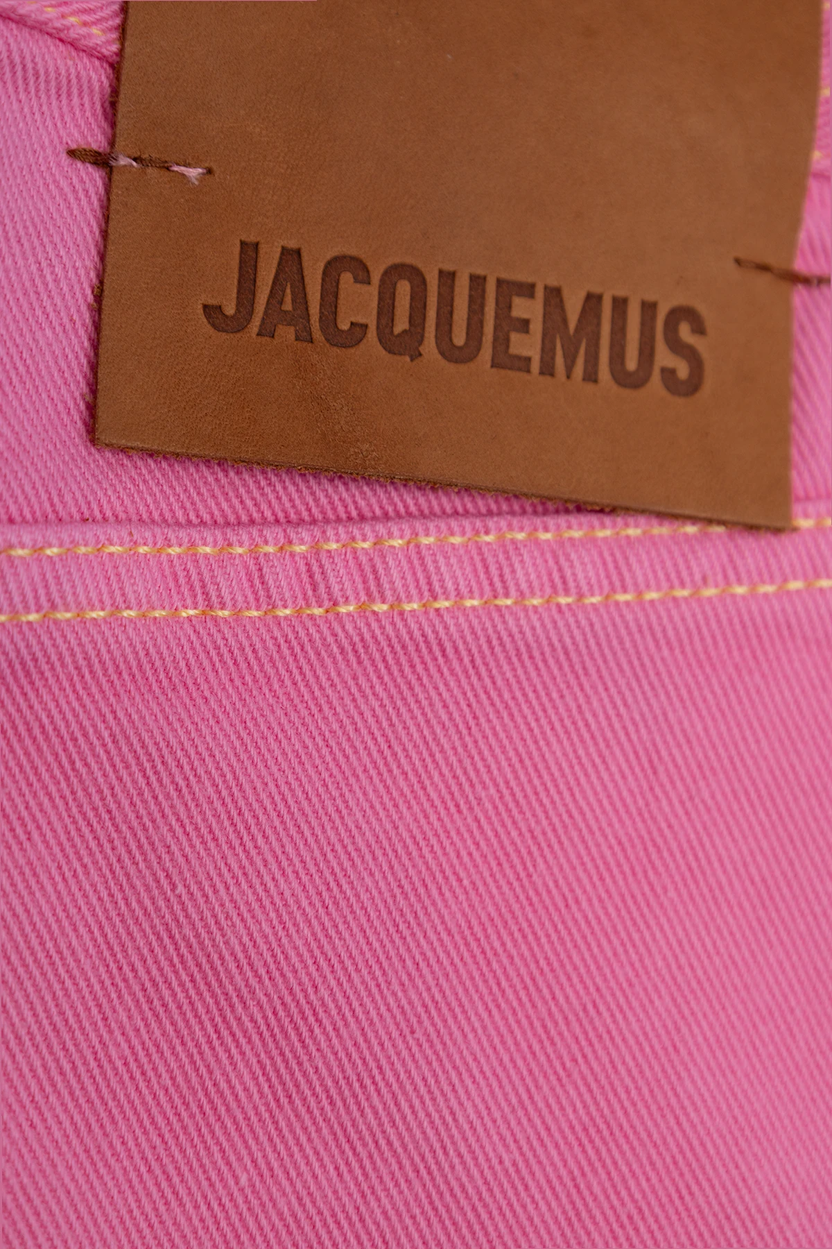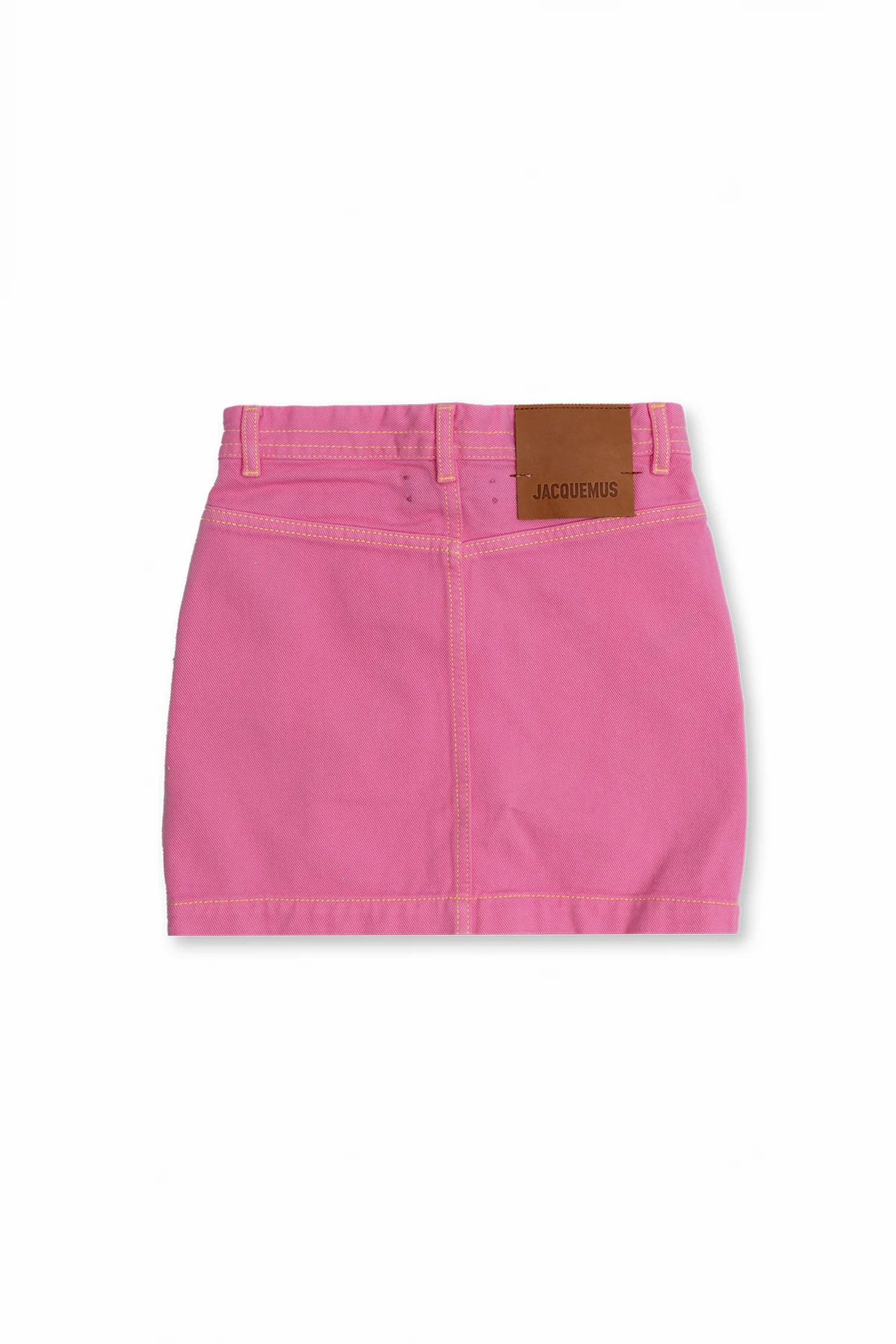 Pink denim skirt from Jacquemus Kids. This style features a zip fly with a button, yellow stitching details, two slip pockets on the front and a brown patch with an embossed logo on the back.