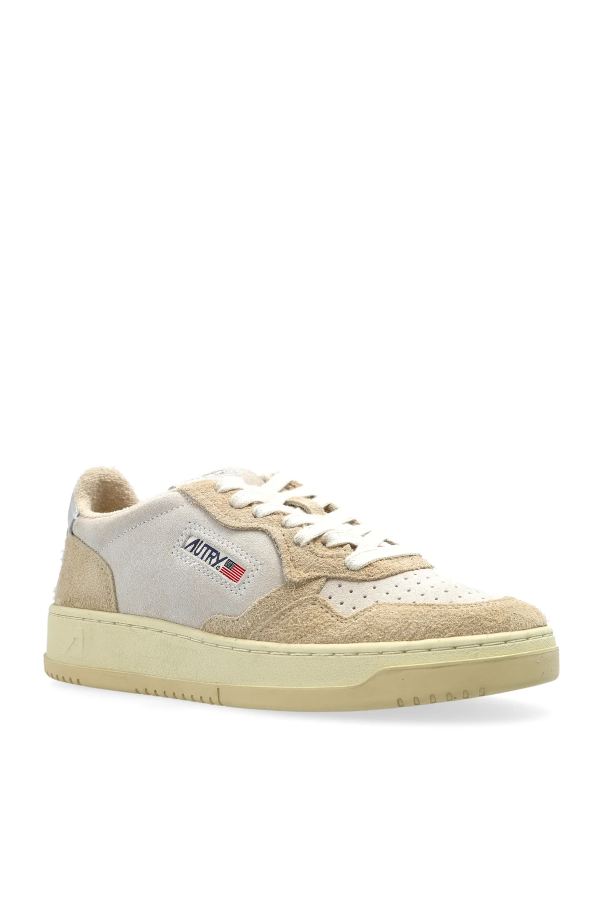 Introducing the Medalist Low sneakers from the exclusive Autry collection, a harmonious blend of classic sportiness and modern sophistication. These low-top sneakers, crafted from a luxurious combination of textile and suede leather, embody effortless elegance suitable for everyday wear. The exquisite design showcases perforated uppers for enhanced ventilation, while the dominant beige hue exudes a refined aesthetic that seamlessly integrates with any ensemble. Notable details include the distinctive Autry logo and a subtle American flag patch adorning the side, paired with a logo on the tongue, all underscored by a creamy sole that accentuates the sneaker\'s allure. Why Choose This Product? Timeless design with a modern twist. Premium materials: leather and textile upper, leather interior, and rubber sole. Enhanced comfort and breathability. Iconic branding and American heritage. Versatile beige colorway for all styles.