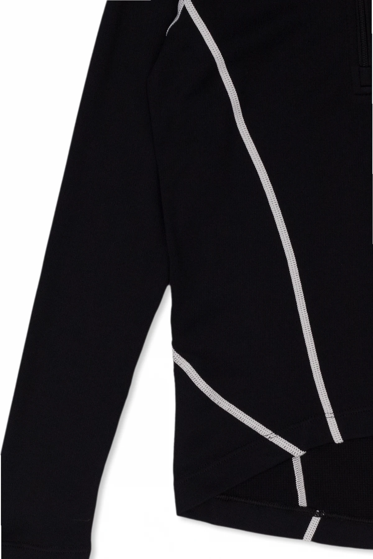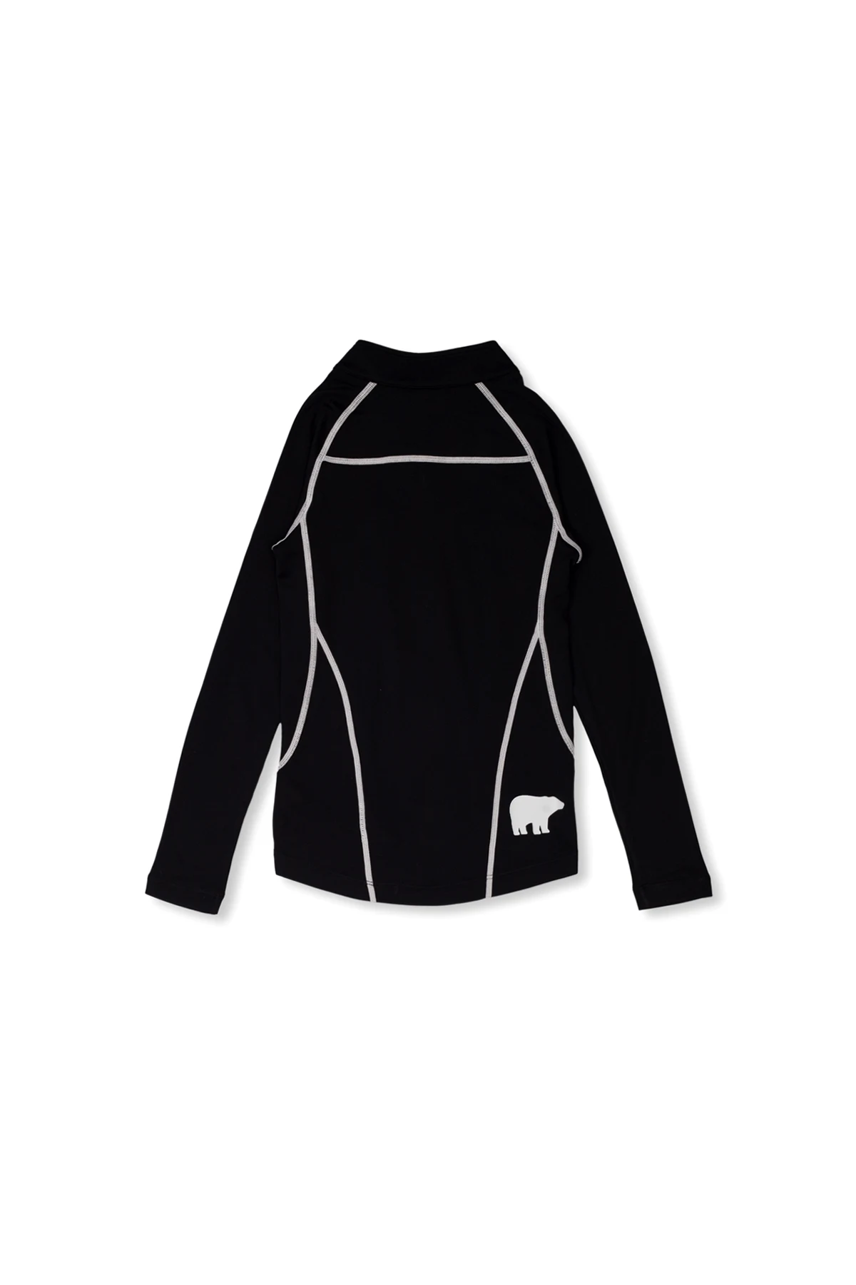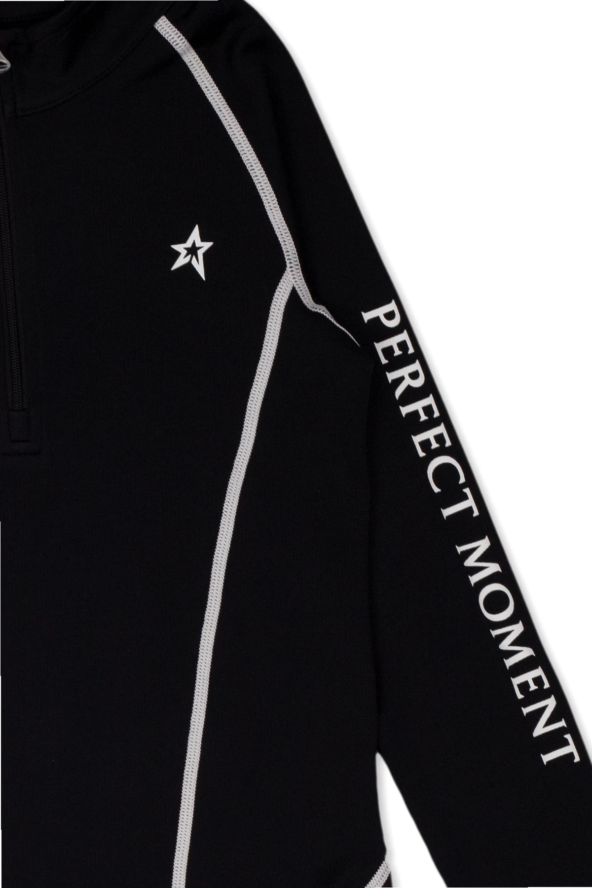 Black thermal top from Perfect Moment Kids. Made of moisture-wicking material, this style features a standing collar with a zip closure, long sleeves and a white graphic print with the brand\'s logo on the front and shoulder.