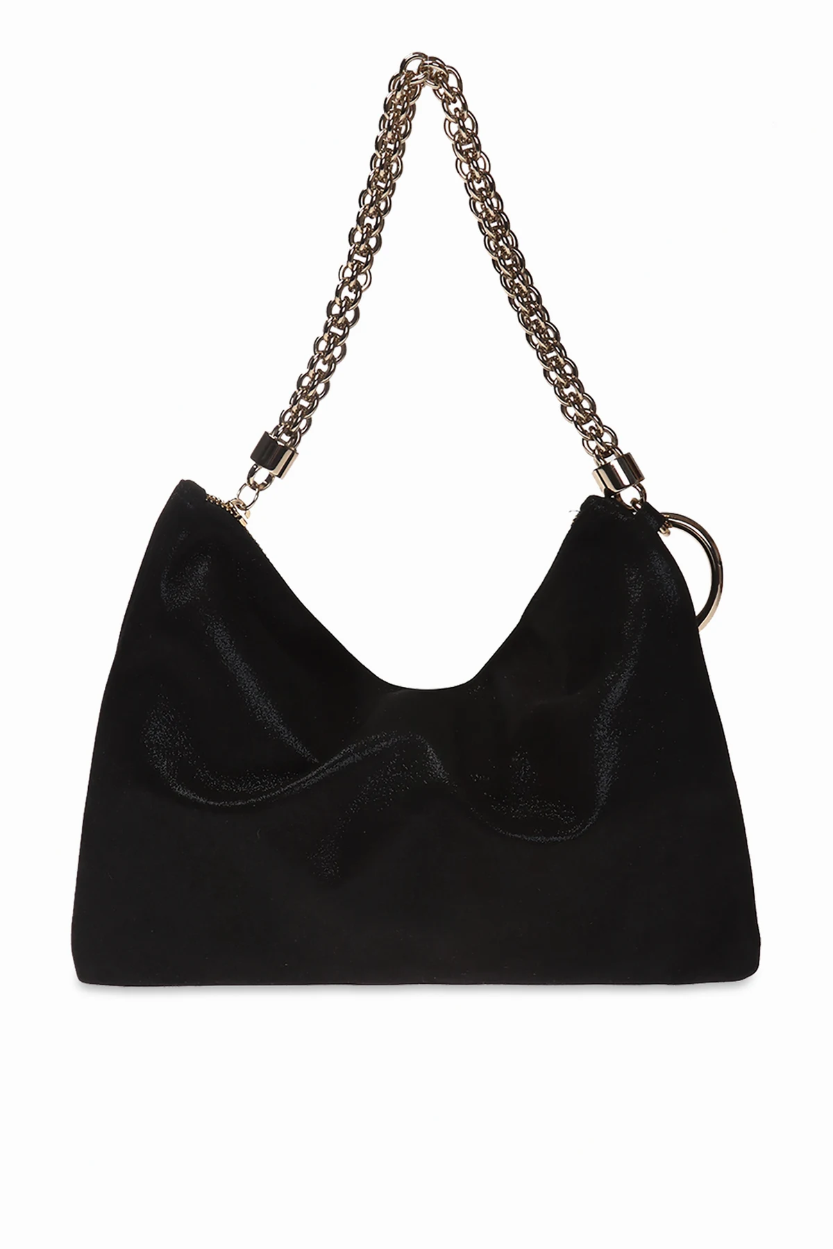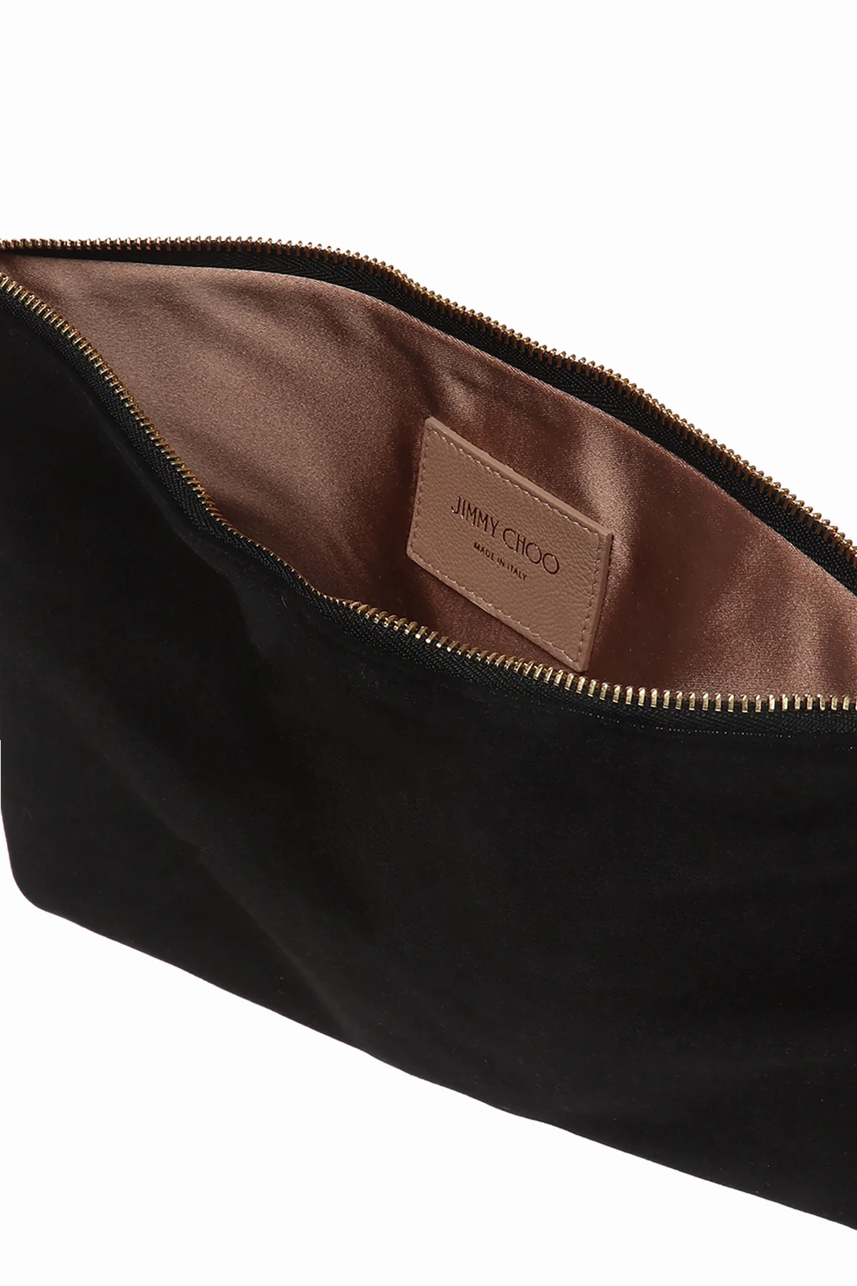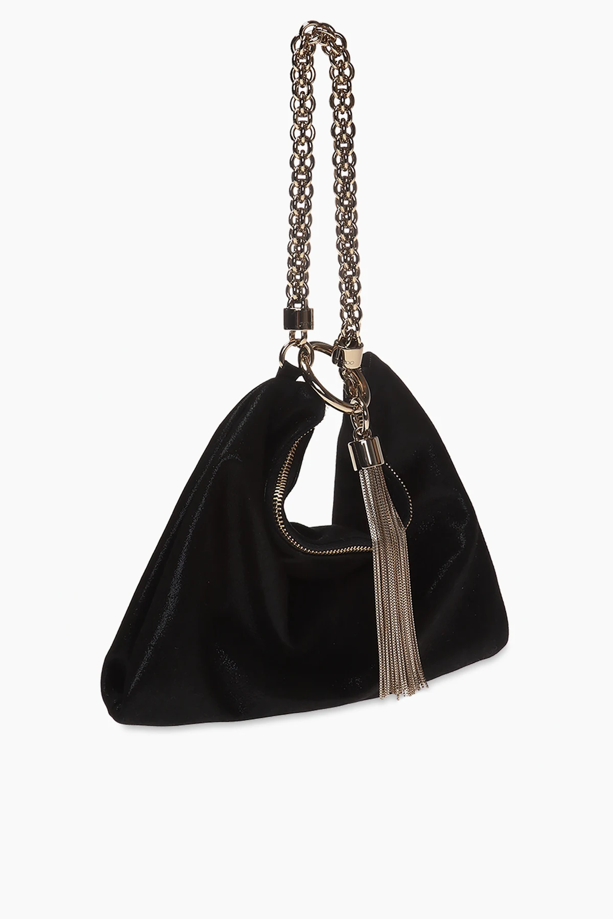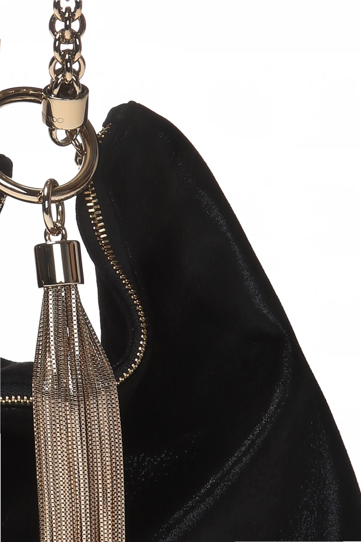 Black \'Callie\' encrusted hand bag from Jimmy Choo. Made of suede. Zip fastening with chain trimming. Blush pink, lined interior has 1 compartment. Gold-tone metal hardware.