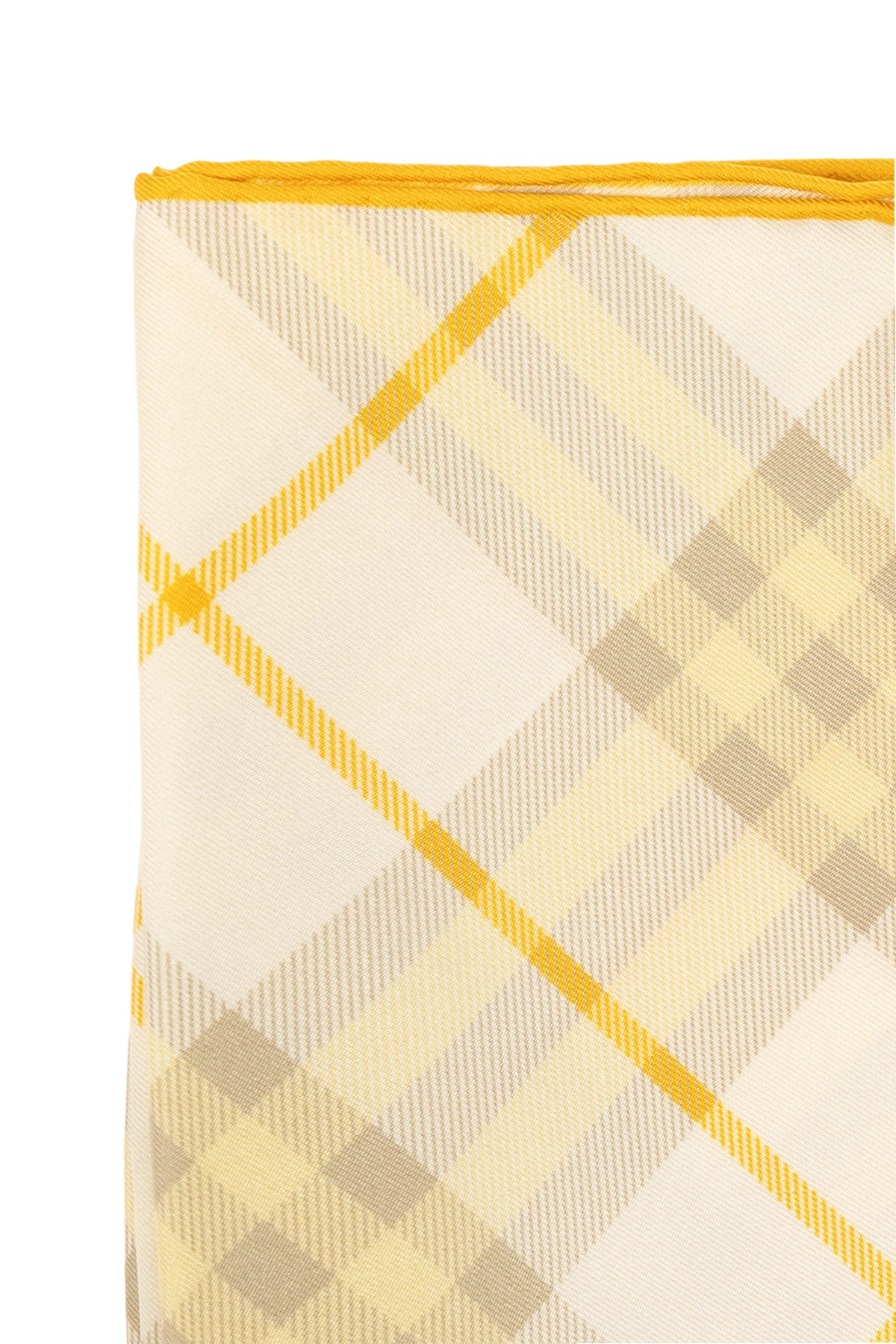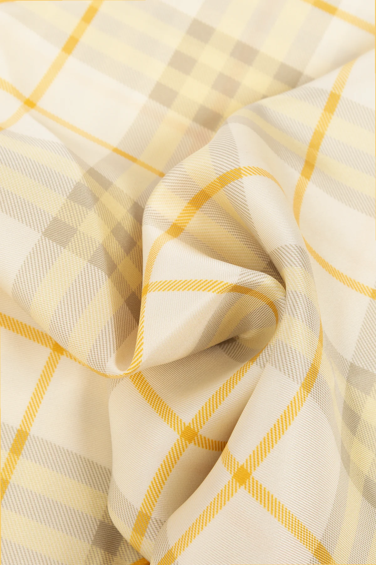 Introducing a quintessential accessory from the illustrious Burberry collection, this 100% silk scarf is a testament to timeless elegance and sartorial sophistication. Rendered in a vibrant yellow hue, the scarf is adorned with a classic plaid pattern, enriched by a palette of beige shades that imbue the piece with depth and subtlety. The interplay of light and dark tones creates an illusion of three-dimensionality, making it a statement piece. The fabric, likely silk or a high-quality synthetic blend that mimics silk, is light and airy, presenting a delicate shimmer that suggests luxury. Its soft, smooth texture is a hallmark of the fine materials used in its creation. The scarf\'s edges are meticulously finished in a darker shade of yellow, providing a striking contrast that accentuates its shape and adds a touch of refinement. Its substantial, square form allows for an array of styling options, from a chic neck accessory to an embellishment for handbags, or even as a headband. This versatility, paired with the absence of visible logos or designer inscriptions, ensures a seamless integration into any ensemble, highlighting its wearer\'s taste without overshadowing. Why Purchase This Scarf? Exquisite Material: Crafted from 100% silk, offering a touch of luxury and unparalleled softness. Iconic Design: The plaid pattern with nuanced shading offers a timeless Burberry look that is both classic and contemporary. Versatile Styling: Its generous size and shape offer endless possibilities for creative expression, making it a versatile addition to any wardrobe. Refined Details: The contrasting edges not only define the scarf\'s form but also add an element of sophistication to its overall appearance.