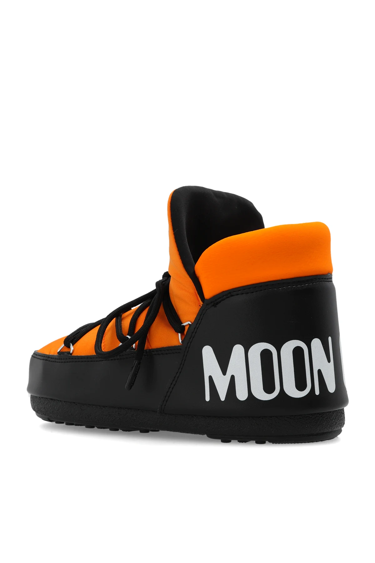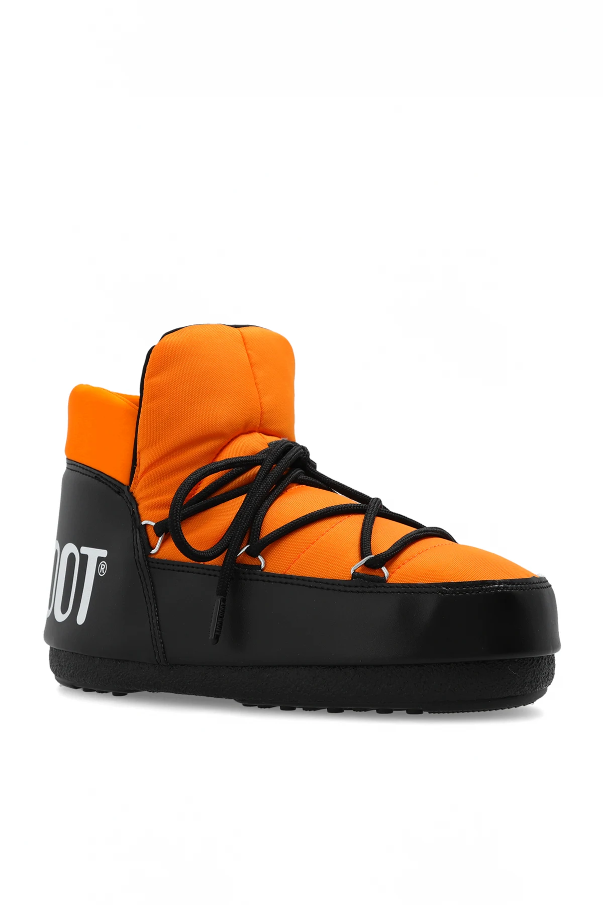 Black and orange ‘Pumps’ waterproof snow boots from Moon Boot. Printed with a black logo, this model sits on a black tread rubber sole with suction cups to ensure superb grip on any surface and showcases a lace-up front and silver-tone metal hardware. Inspired by the peculiar shape and technology of the astronauts’ boots, the iconic style was designed in 1969 after the first Moon landing.