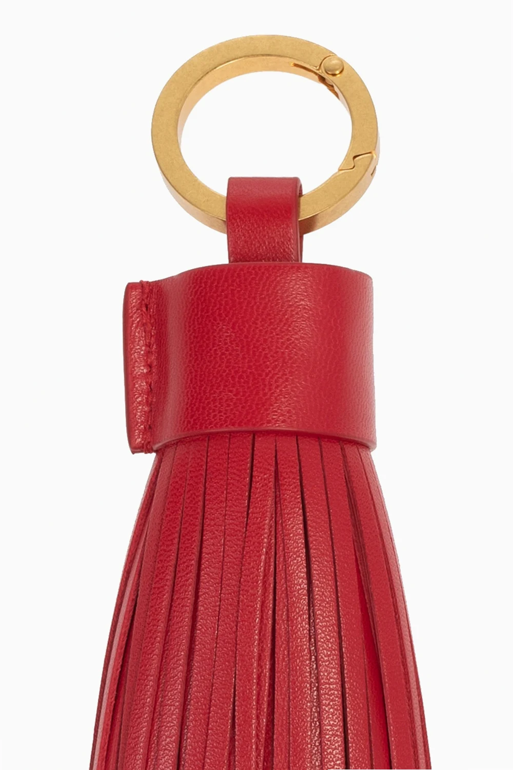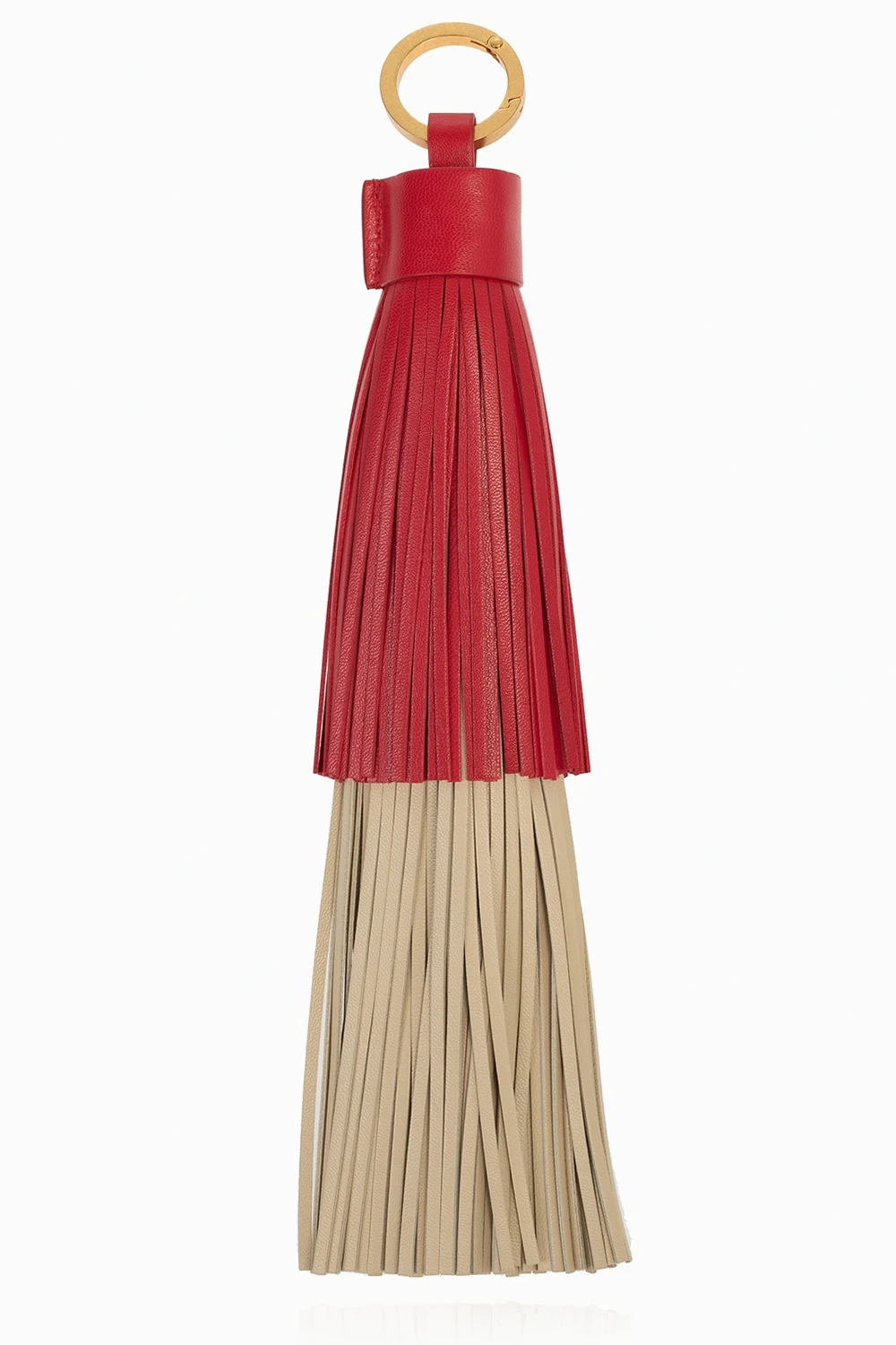 Red and beige keyring from Bottega Veneta. Crafted from lamb leather, this item features decorative tassels and a metal logo-embossed split ring in gold-tone.
