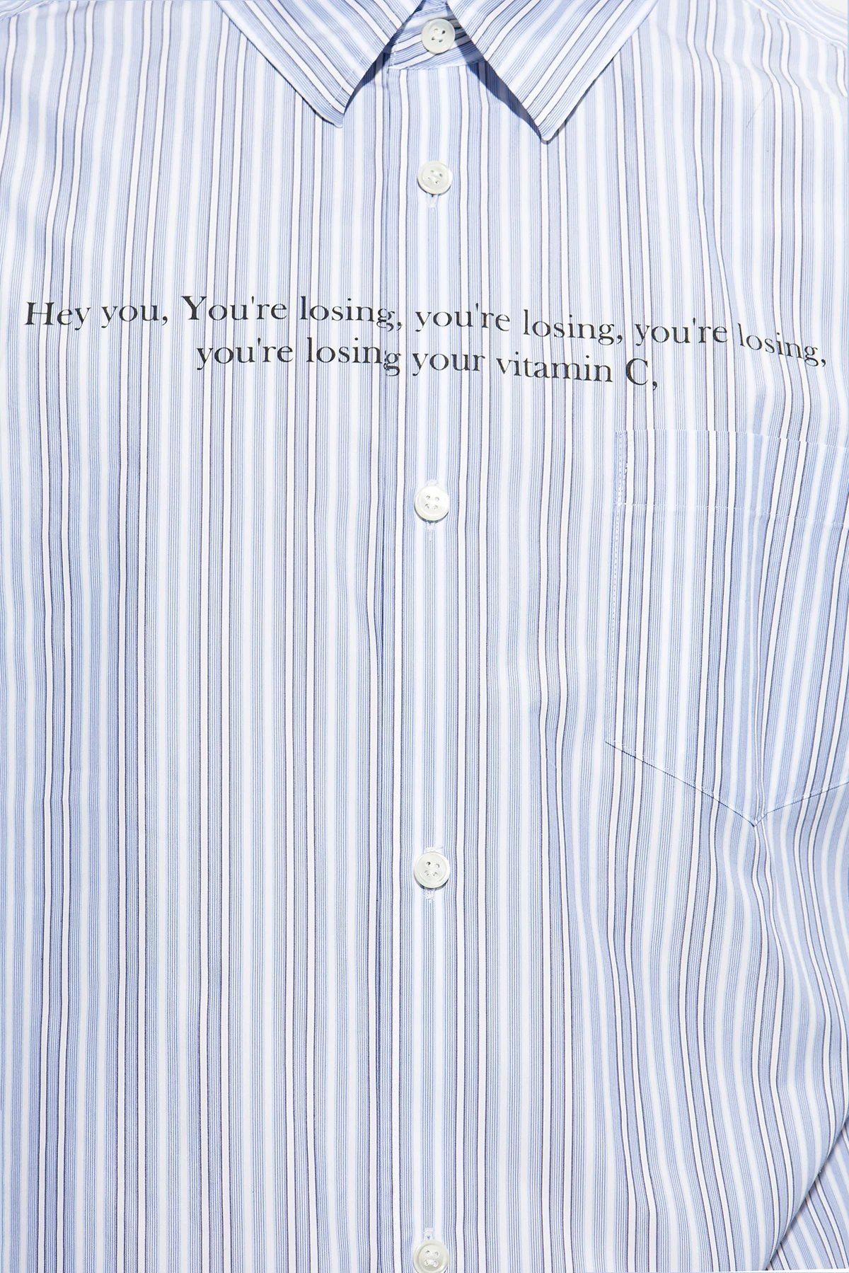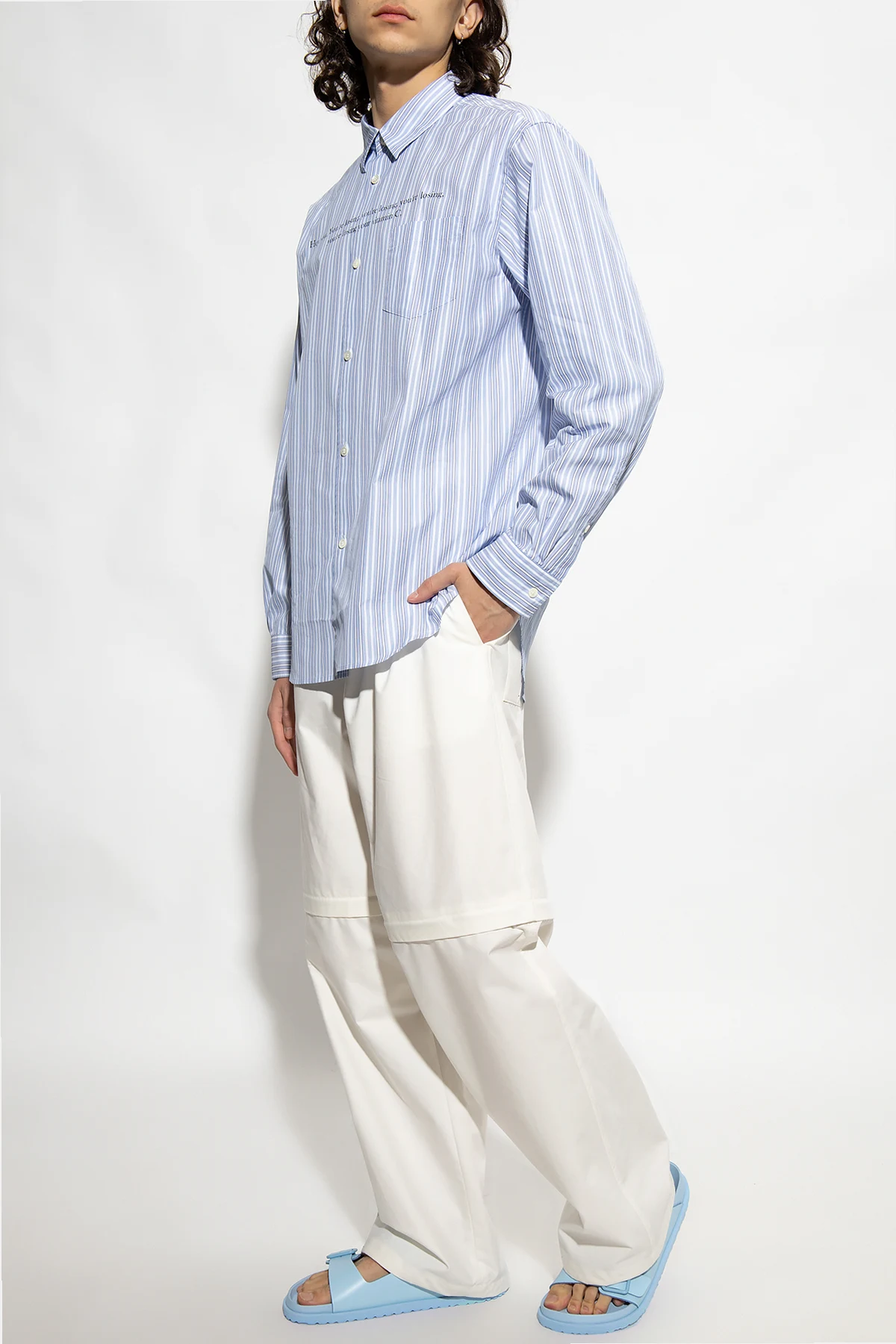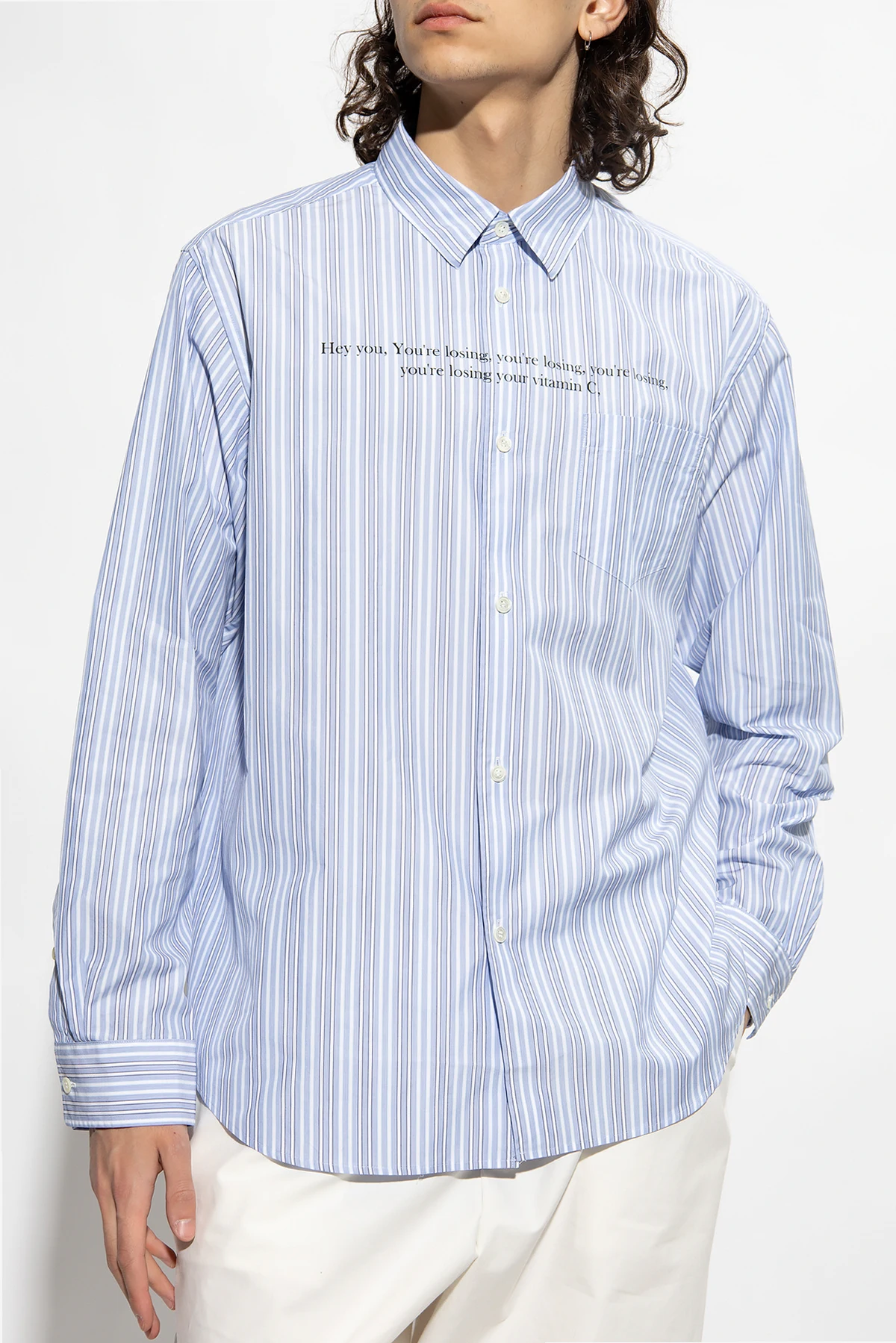White and blue shirt from Undercover. Made of cotton. Fastened with buttons, this garment features a stripe pattern, black print, slip pocket and long sleeves with buttoned cuffs.