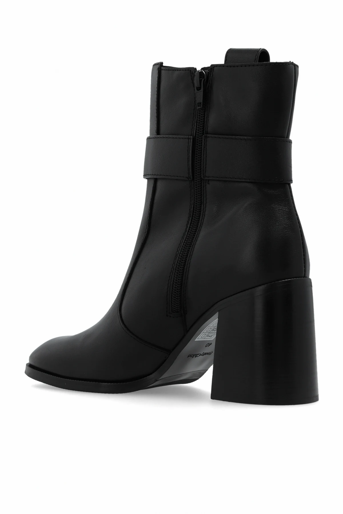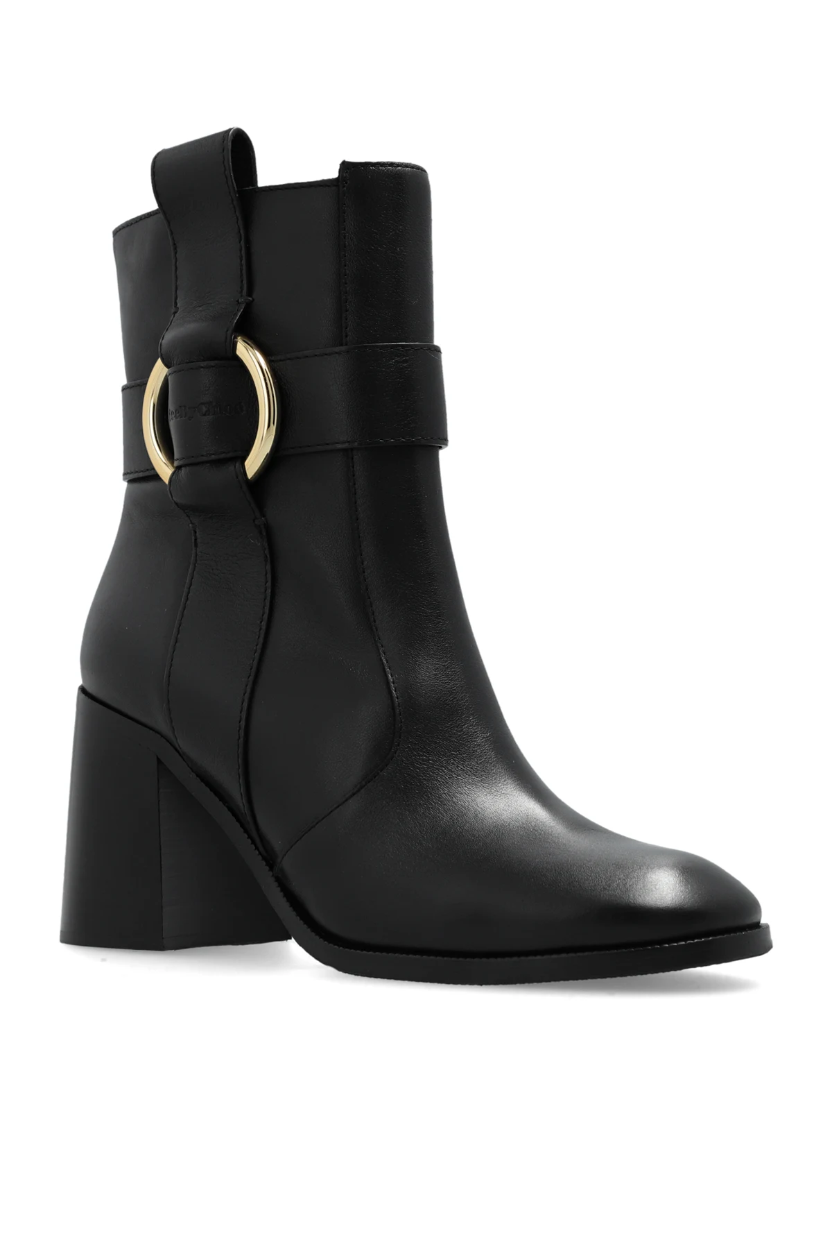 Introducing the `Zelda` Heeled Booties by See By Chloé, a testament to sophisticated style and comfort. Crafted from 100% smooth calfskin leather, these booties exude an air of elegance and understated luxury. The dominant black hue enhances their versatility, making them a quintessential addition to any wardrobe. The design features a high, wide heel that promises stability without compromising on style. The slightly above-ankle shaft offers a modern silhouette, while the strap adorned with a round, gold buckle adds a splash of elegance. A delicately pointed toe front and a smooth rubber sole with a subtle tread pattern ensure these booties are as practical as they are stylish. For ease of wear, a zip fastening at the back completes the sophisticated design. Although unseen, the interior likely boasts a lining of the same high-quality calfskin, ensuring comfort with every step. Presented both individually and on a model, the `Zelda` booties effortlessly complement various outfits, from casual jeans to more formal skirts, underscoring their adaptability and chic appeal. Why Purchase the `Zelda` Heeled Booties? Elegant Design: The combination of a high, wide heel and a gold buckle exudes sophistication. High-Quality Materials: Crafted from 100% calfskin leather with a rubber sole for durability and comfort. Versatile Style: The classic black color and elegant silhouette ensure these booties can elevate any outfit. Attention to Detail: From the pointed toe to the zip fastening at the back, every element has been thoughtfully designed.