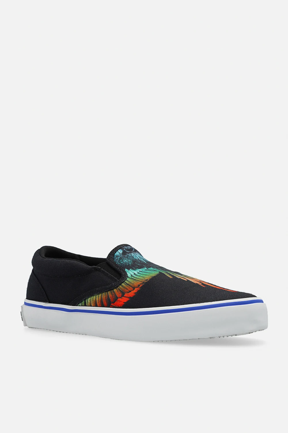 Black ‘Icon Wings’ sneakers from Marcelo Burlon. Made of fabric, this slip-on pair features a multicolored wing pattern, elastic side panels and white rubber sole.