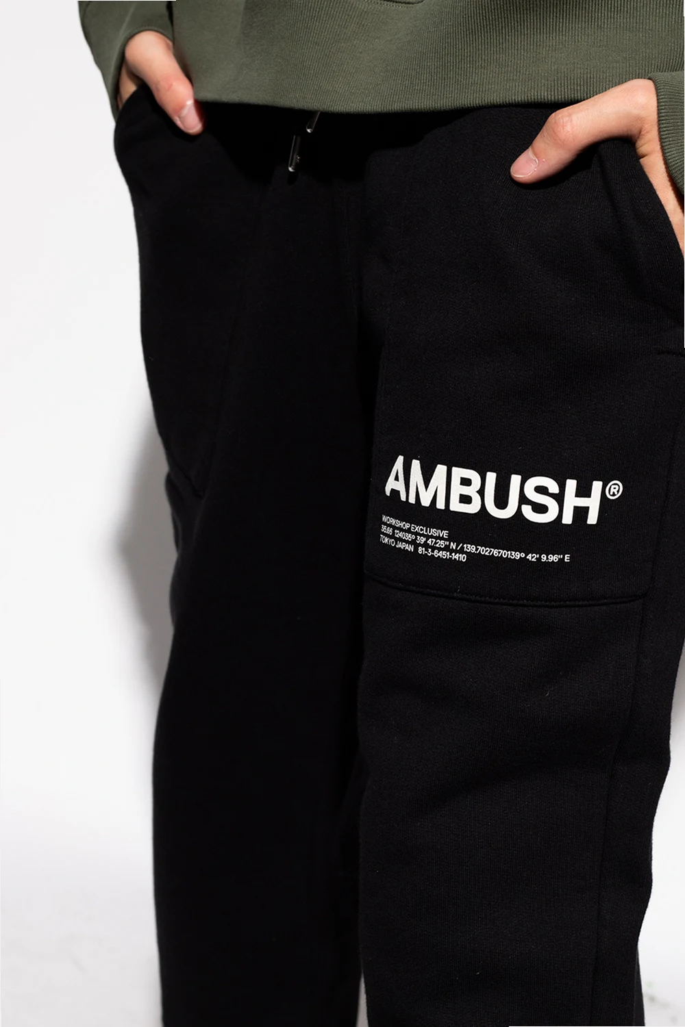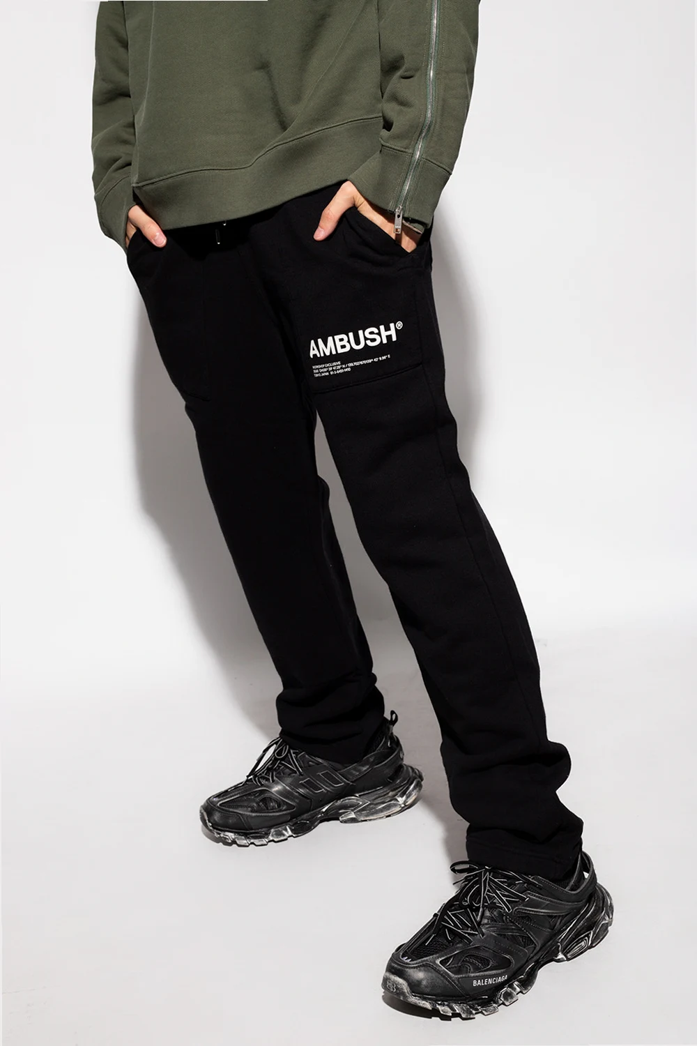 Black sweatpants from Ambush. Made of cotton, this pair falls down with tapered legs and is complete with a cream logo print, two front pockets, two back pockets and a drawstring waist.
