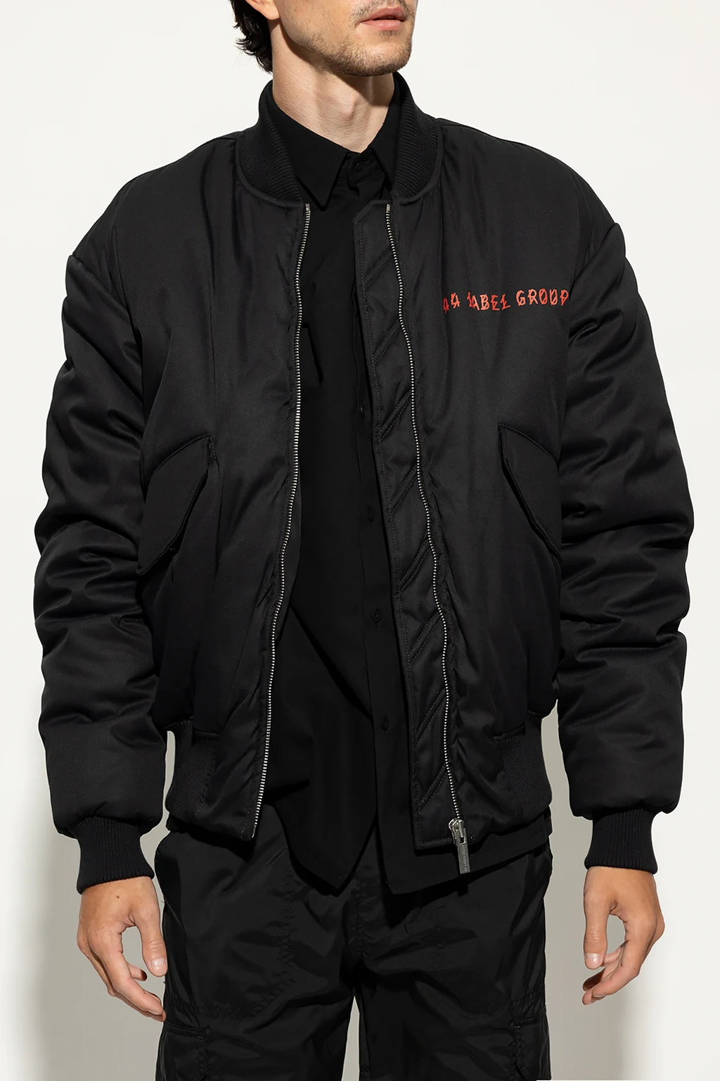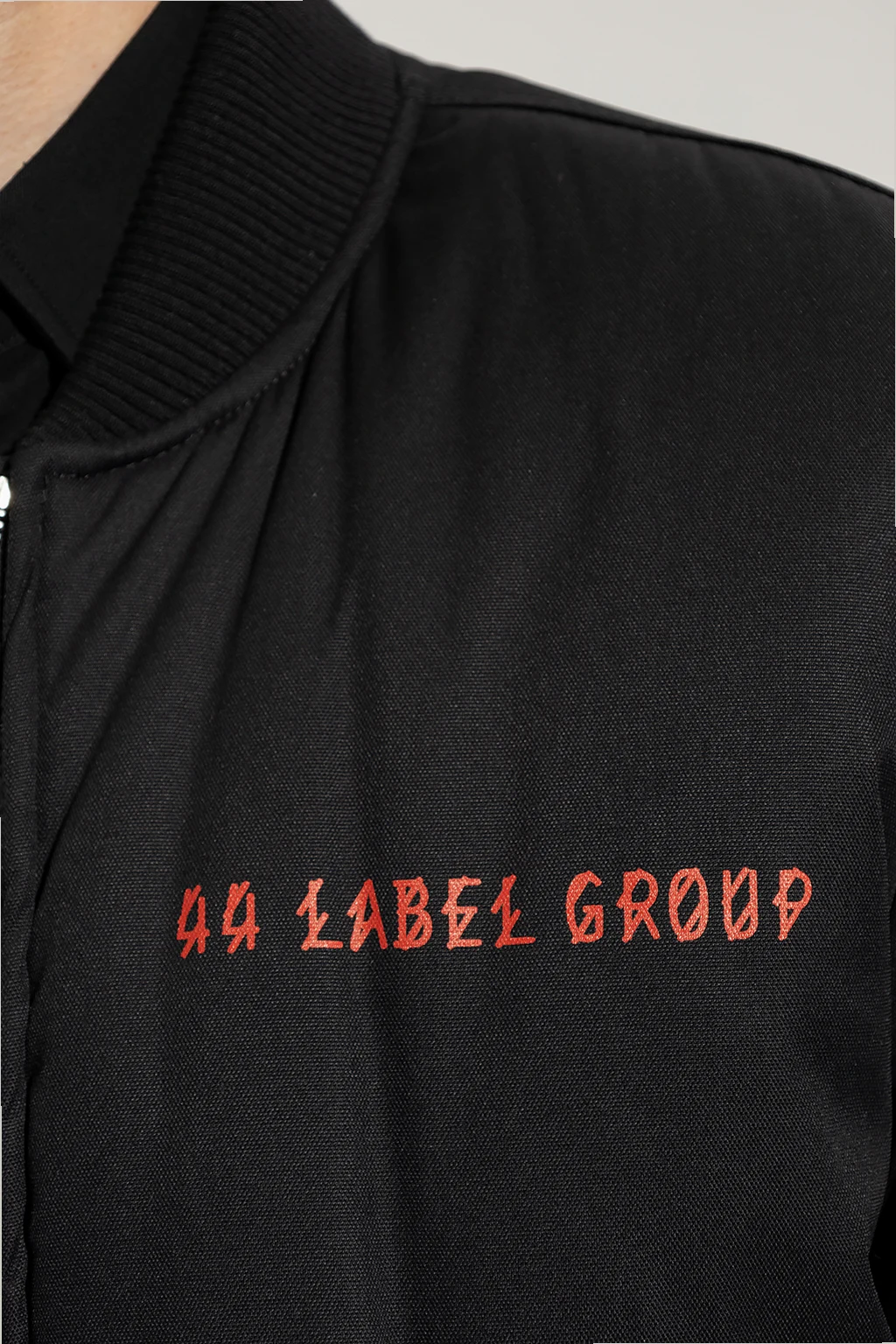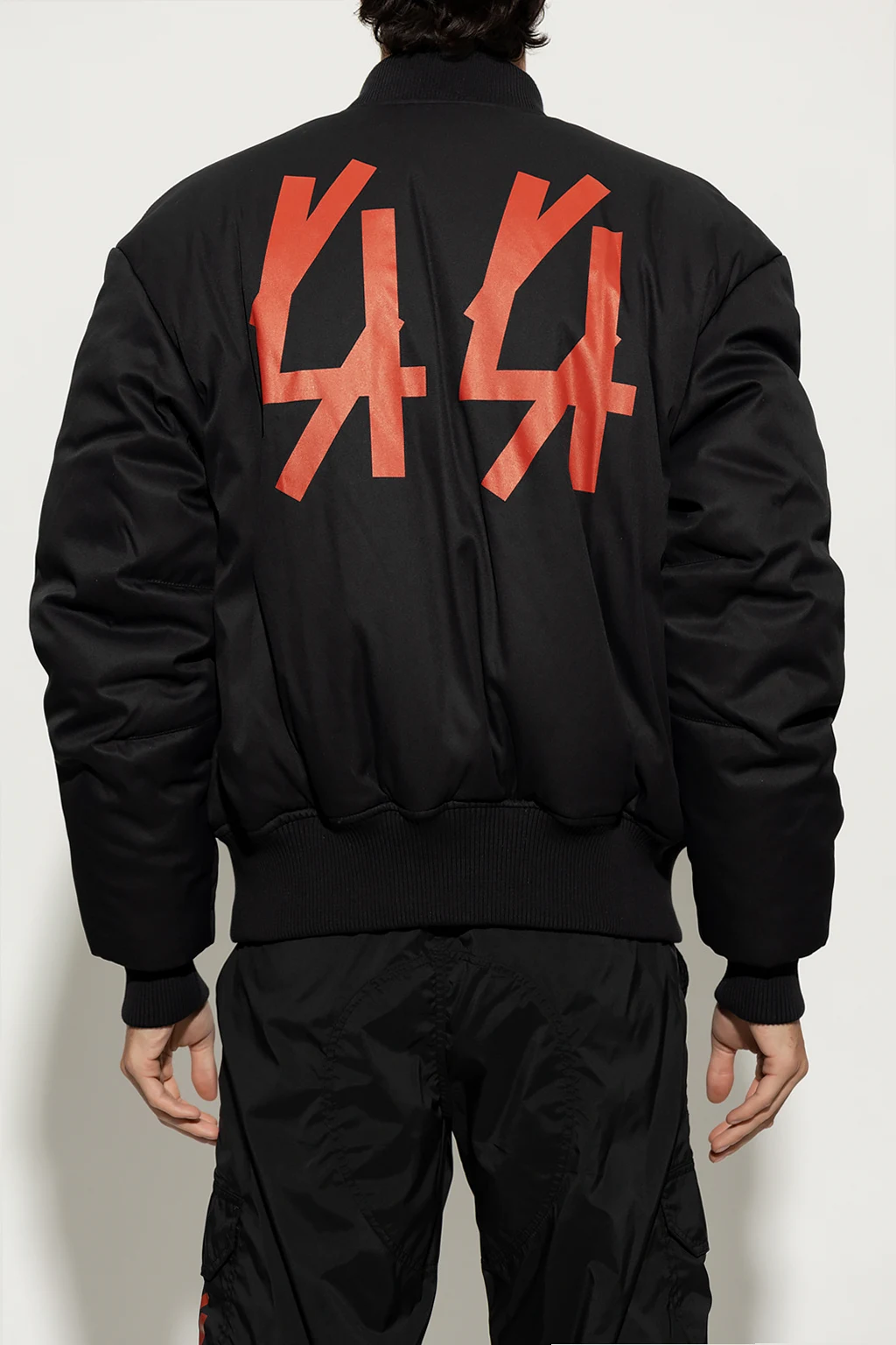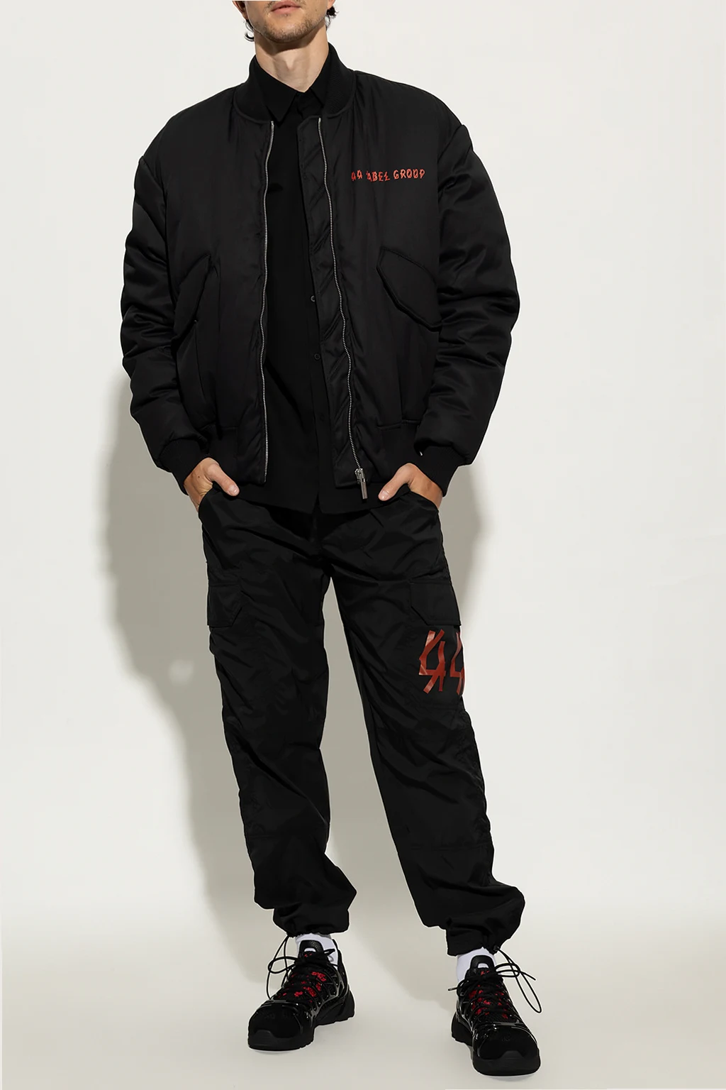 Black bomber jacket from 44 Label Group. Fastened with a zip, this garment features a red logo print, two snap-fastened pockets and ribbed trims at the collar, hem and cuffs.