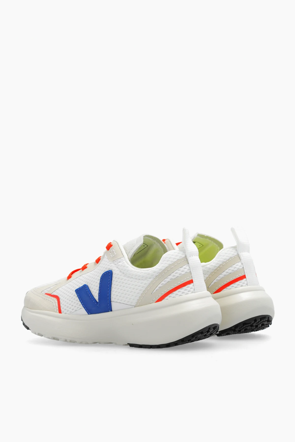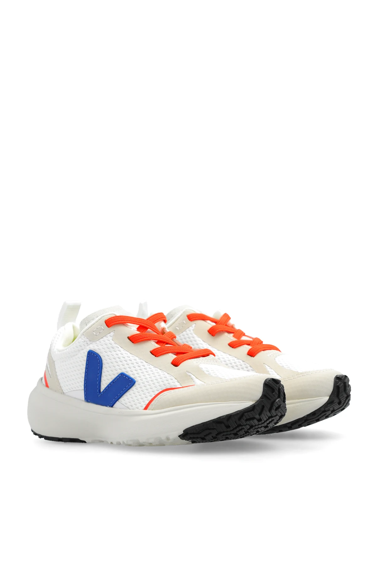 White ‘Canary’ sneakers from Veja Kids. Crafted from recycled Alveomesh material, this lace-up model showcases an embossed logo on the tongue, elastic neon laces made of rubber and recycled material and a signature navy blue V patch made of Amazon rubber on the sides. The insole is made of Amazon rubber and recycled EVA foam. It is set on a cream and black rubber sole made of organic and recycled materials. Produced in Brazil, in a Fair Trade USA-certified factory.