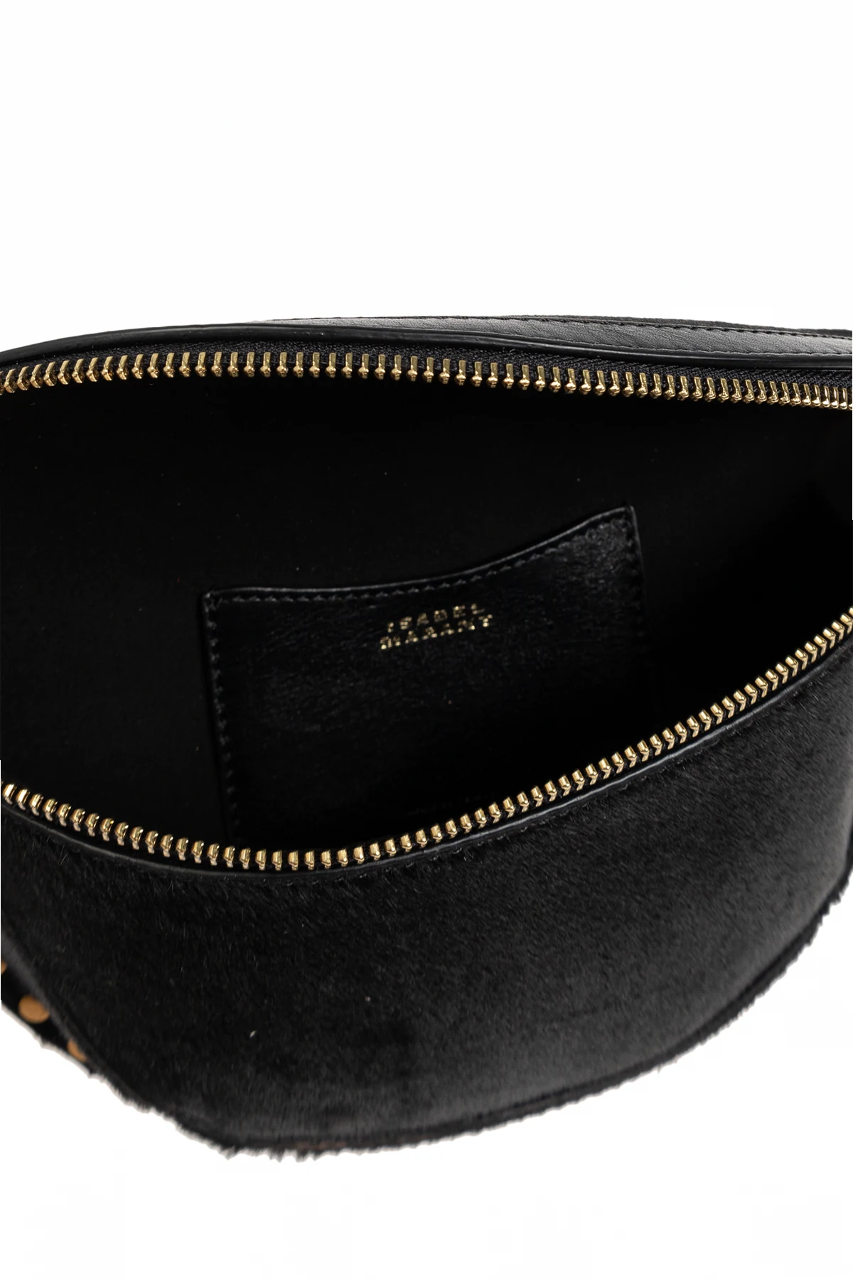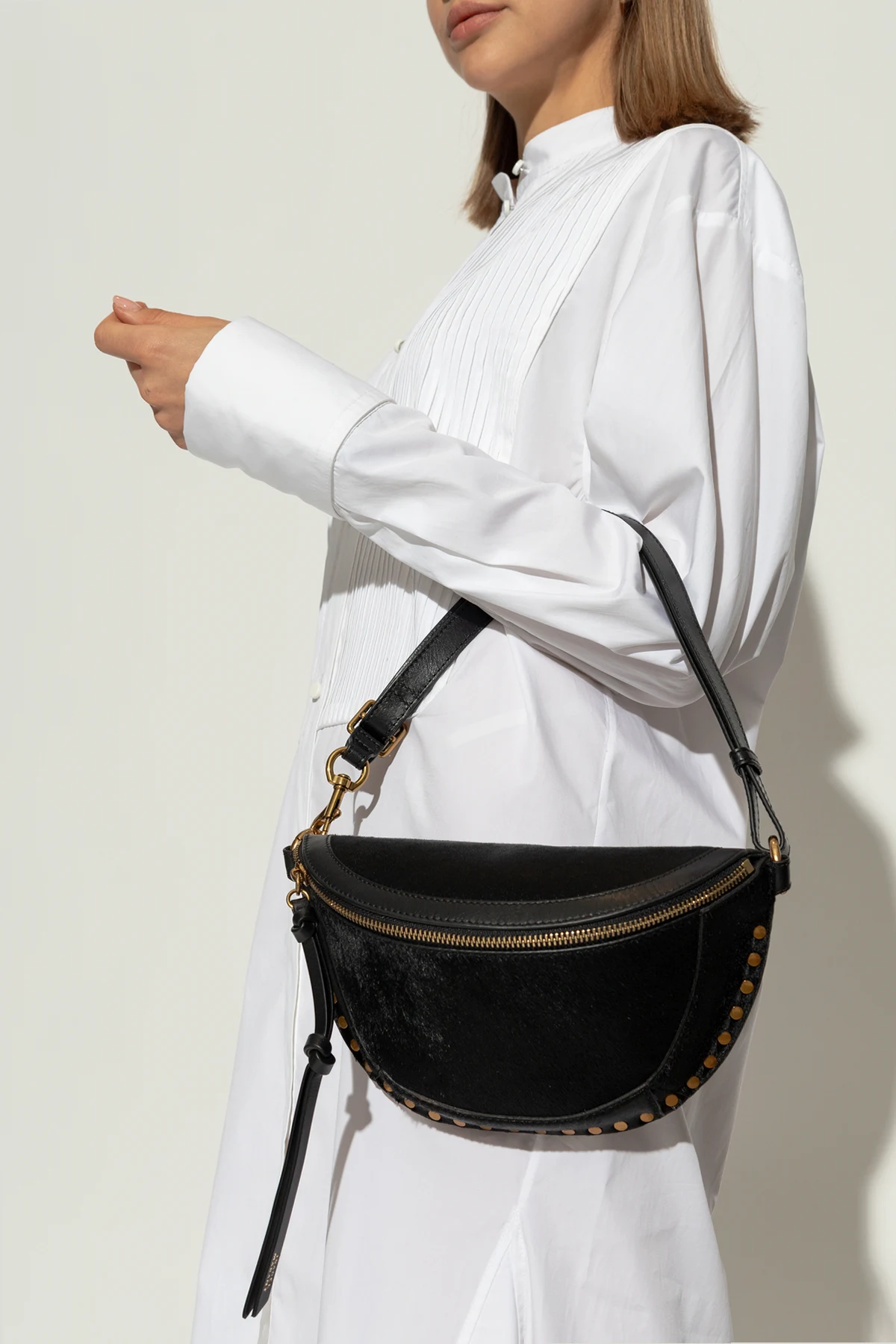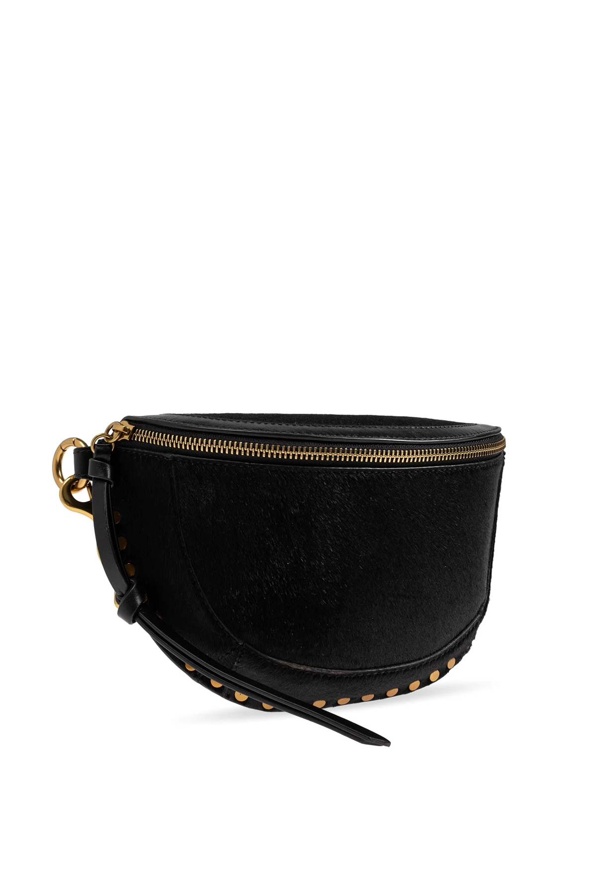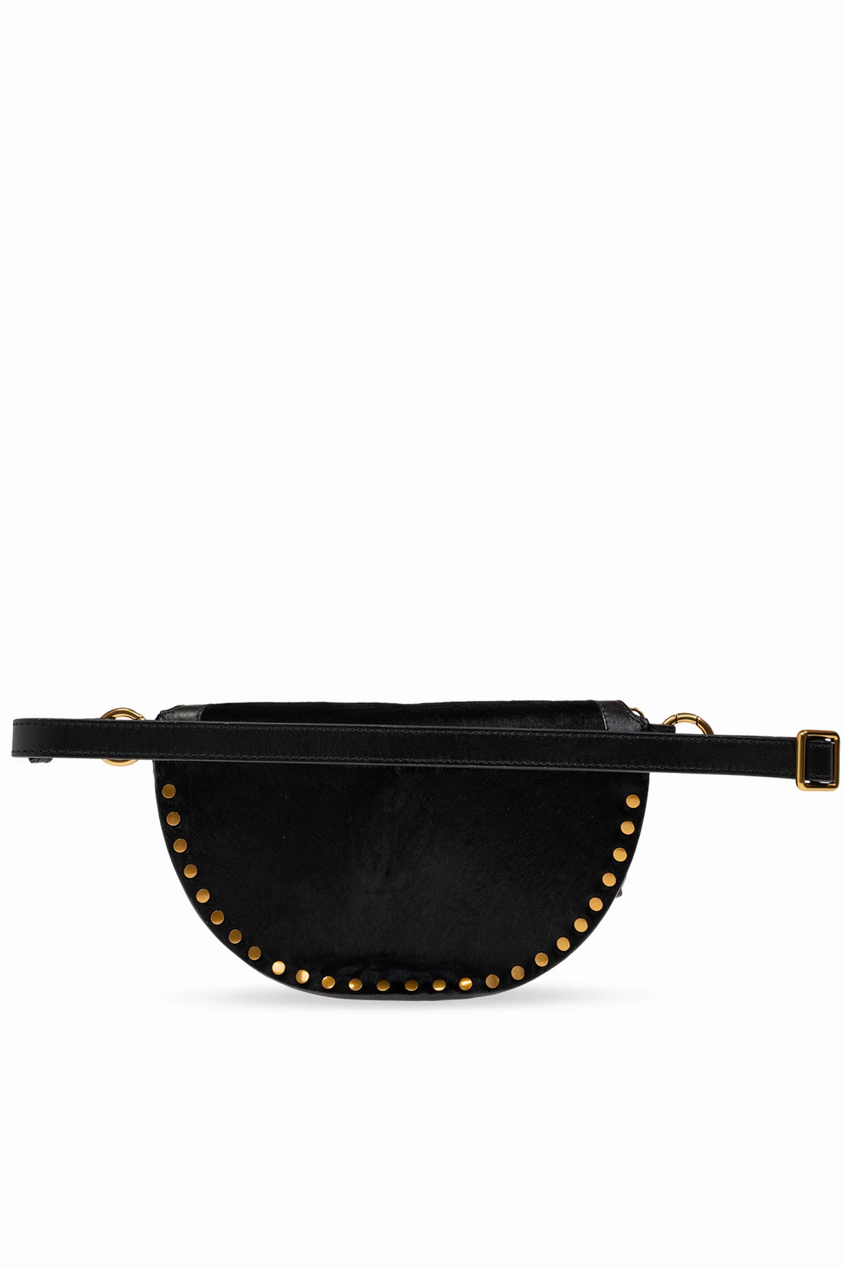 Introducing the exquisite Skano Waist Bag from the exclusive collection of the esteemed fashion brand, Isabel Marant. This elegantly crafted accessory is a testament to refined aesthetics and superior craftsmanship. The bag boasts a sophisticated semi-circular shape enhanced by rows of brass studs on the sides, adding a touch of luxury and style. Made from premium black leather with a subtle texture, it exudes elegance and sophistication. The contrasting gold zipper not only adds functionality but also serves as a striking accent against the black leather. Attention to detail is evident in the sturdy, durable zipper, which features a leather pull tab for easy access. Inside, you\'ll find a small pocket emblazoned with the designer\'s logo, underscoring the authenticity and quality of the product. The adjustable strap allows for personalized comfort, making it a versatile accessory for any wardrobe. Why Choose the Skano Waist Bag? Timeless black color that complements various styles. Luxurious brass studs for added elegance. High-quality black leather with a subtle texture. Sturdy gold zipper with a leather pull tab. Adjustable strap for a customized fit. Interior pocket with designer logo for authenticity.