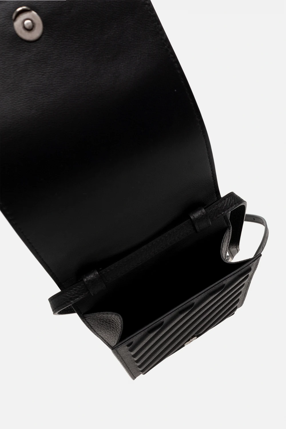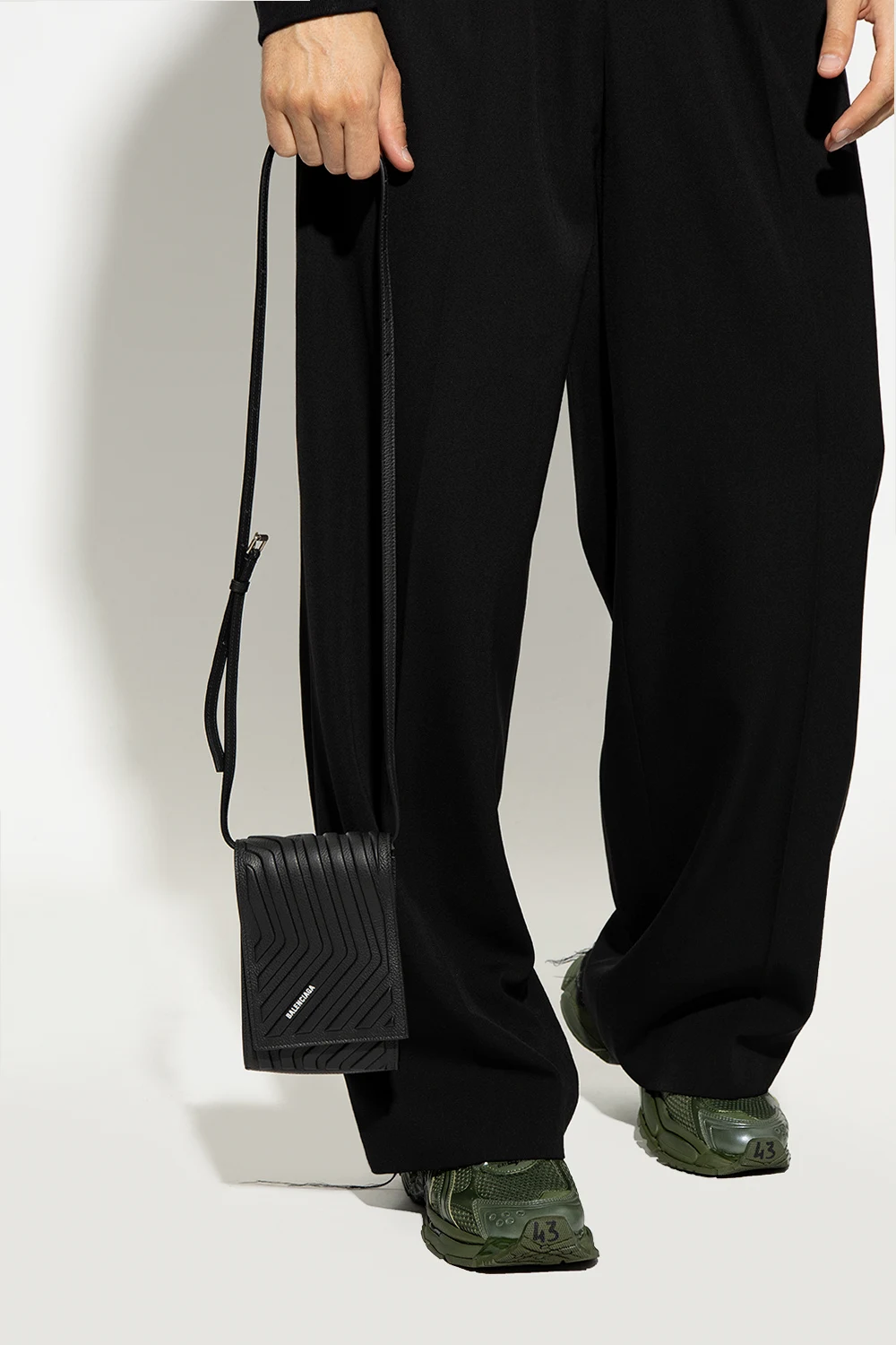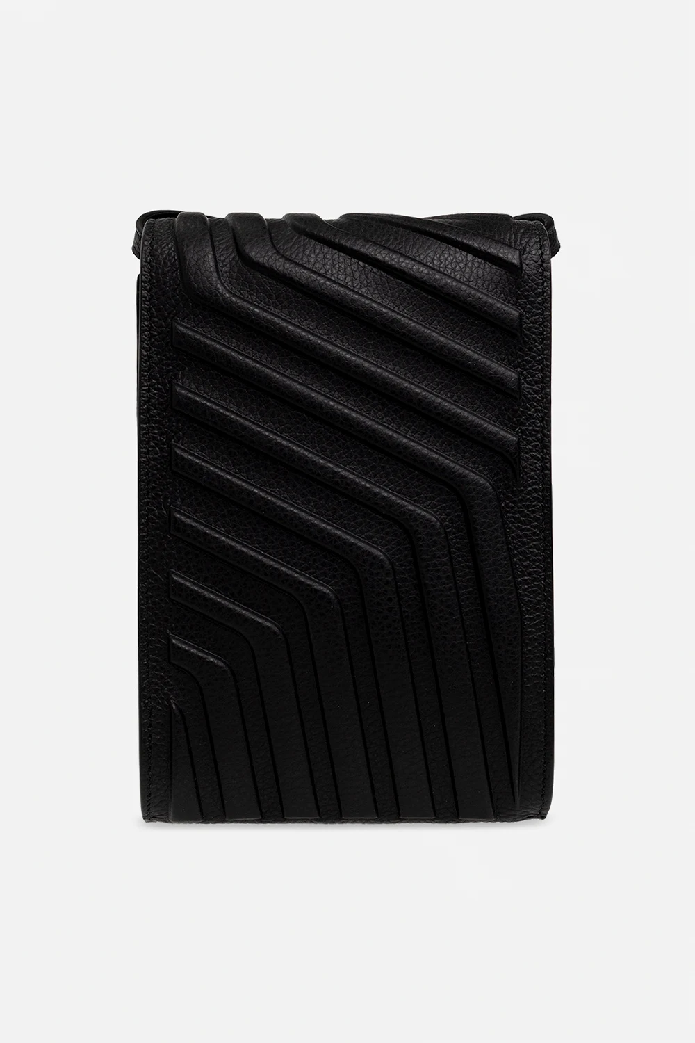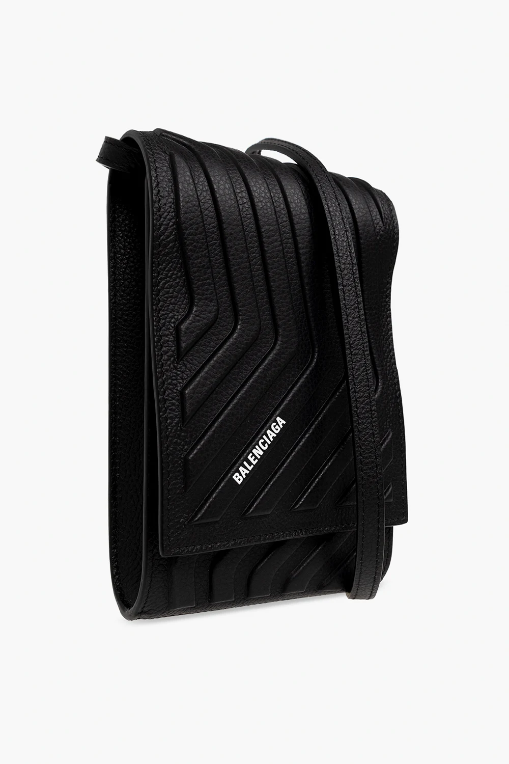 Black ‘Car’ phone pouch from Balenciaga. Made of calf leather, this model features a magnetic snap, raised geometric pattern, white logo print and adjustable, detachable shoulder strap.