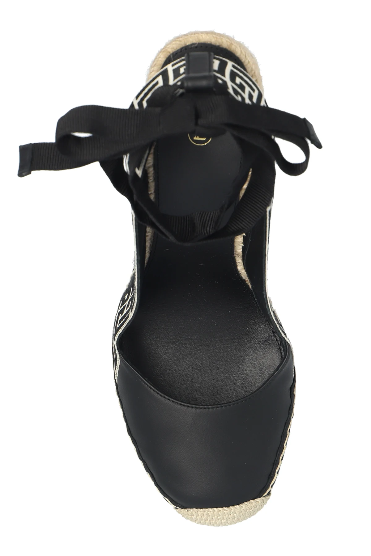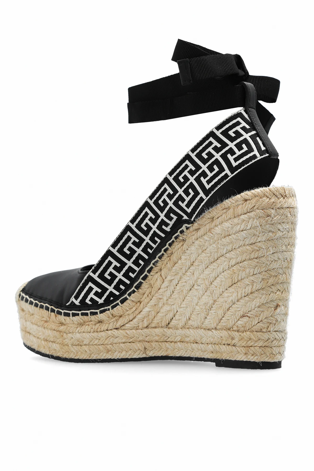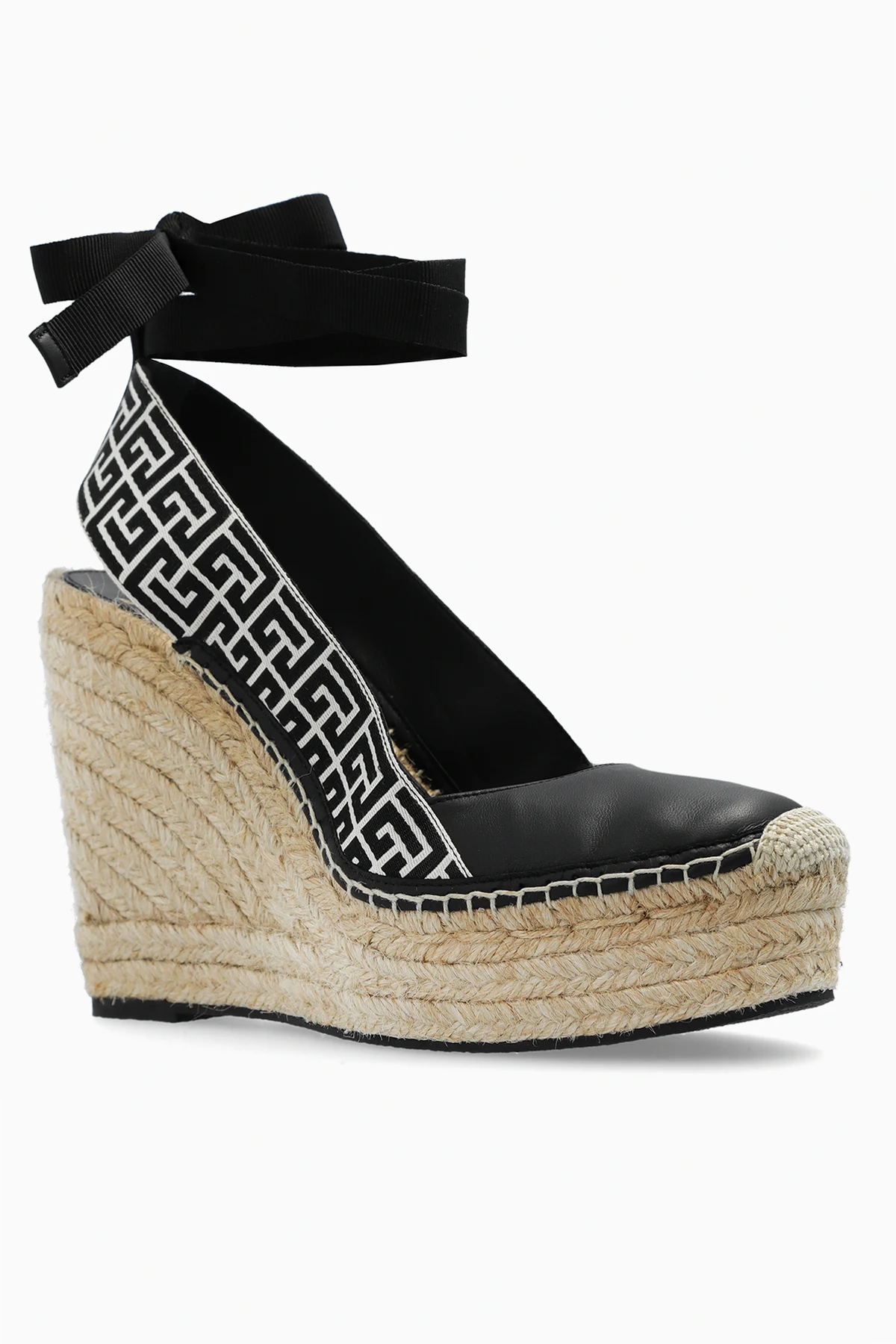 Beige and black ‘Alex Monogram’ wedge espadrilles from Balmain. Made from cotton and leather, this model sits on a braided jute sole with black rubber trim and features a monogram and ankle ties.