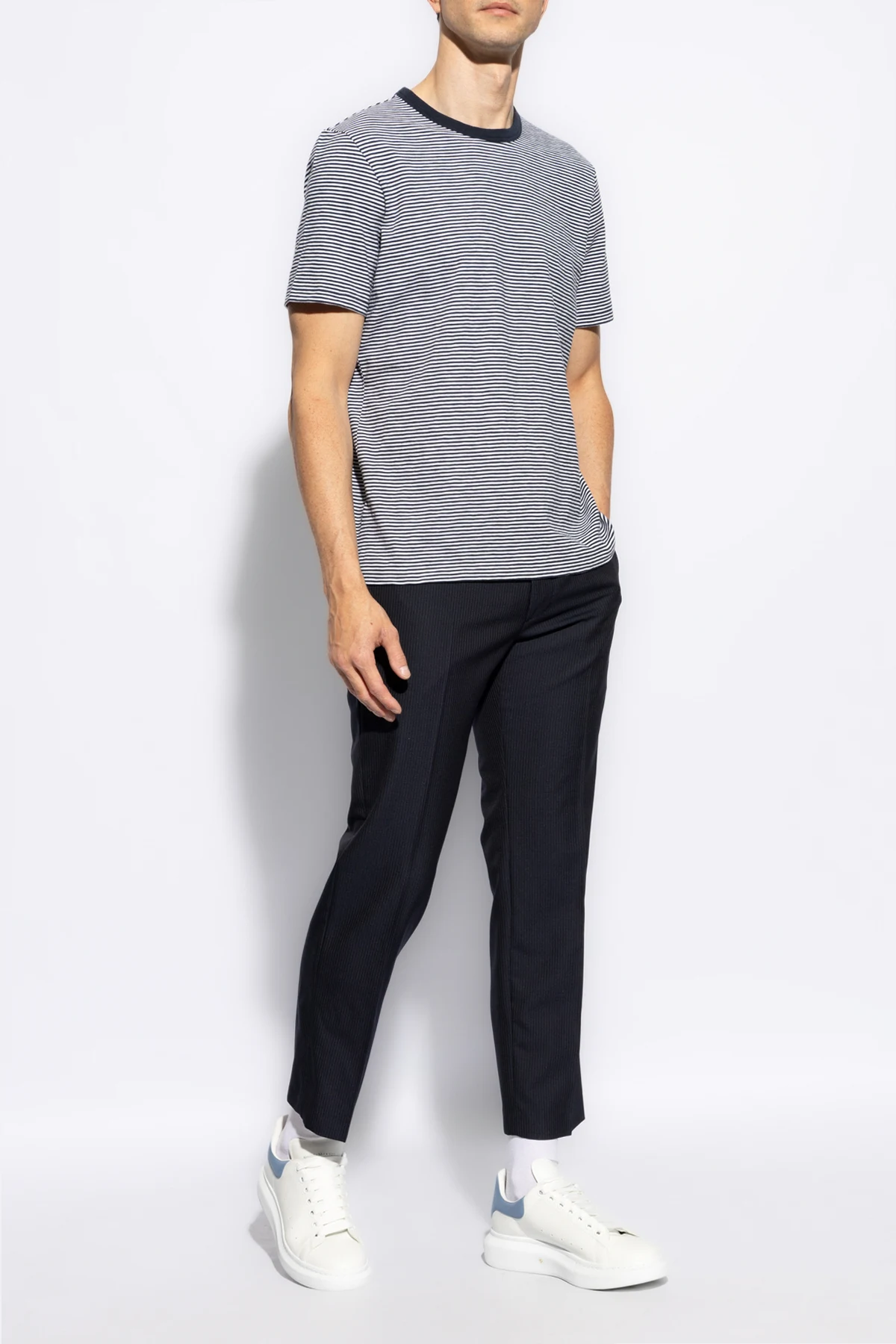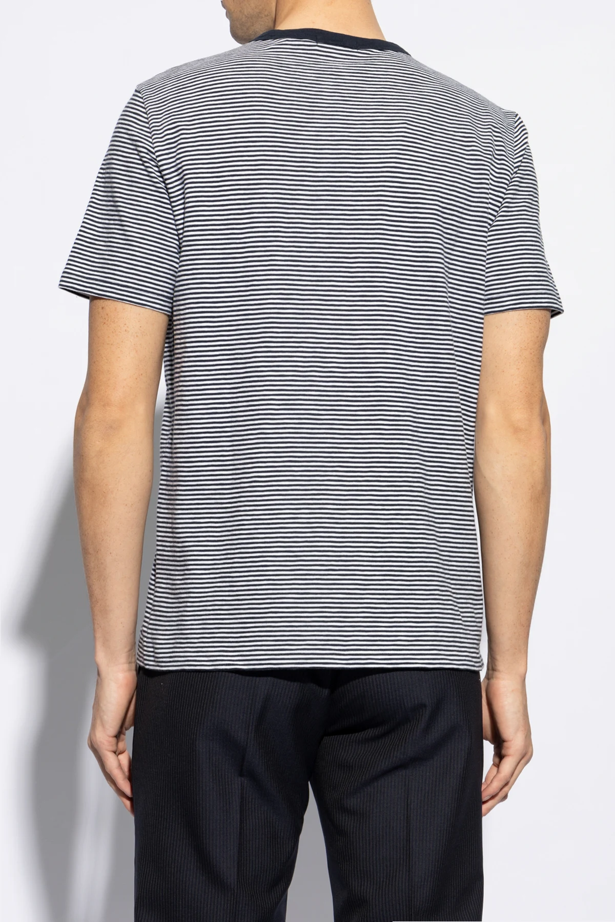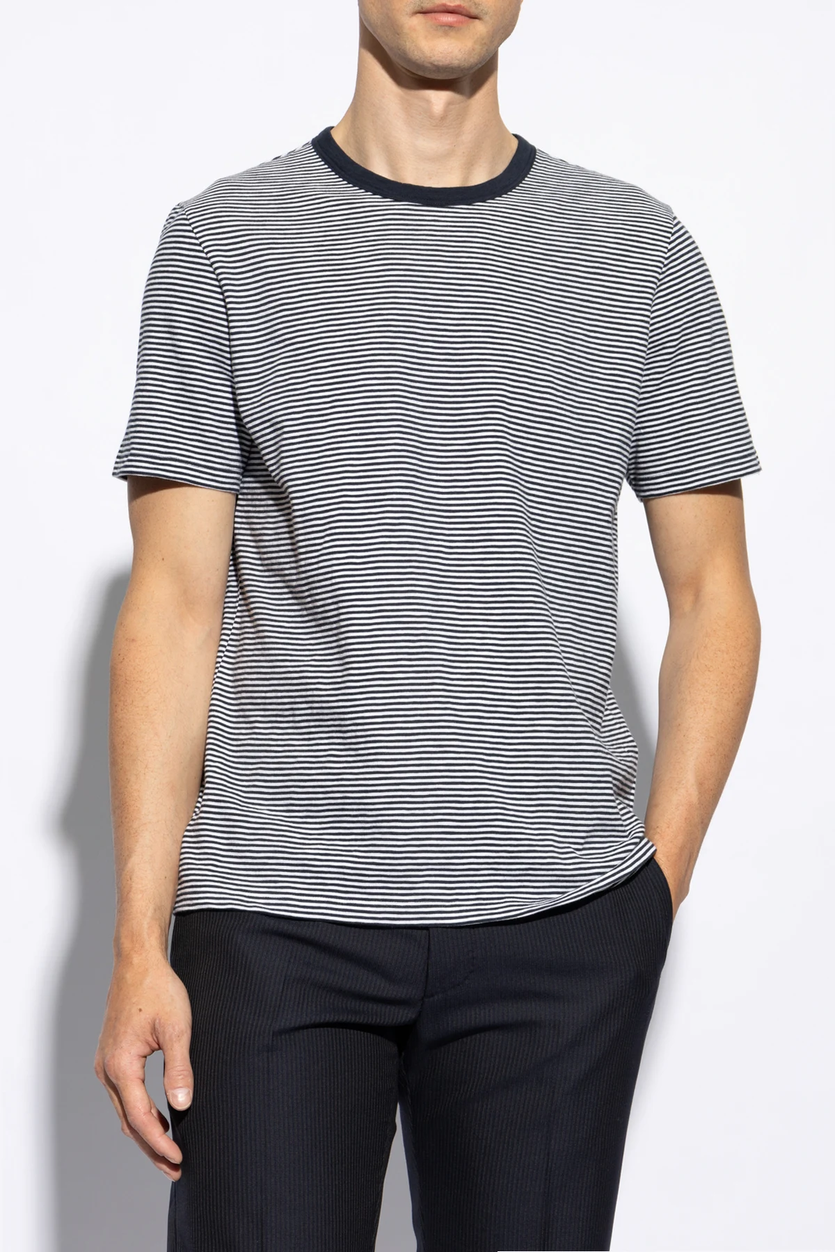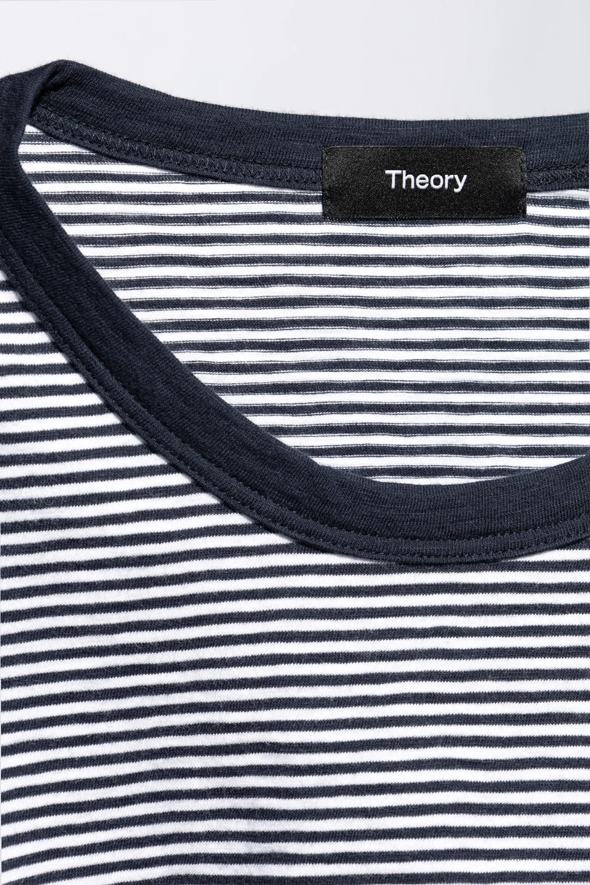 Introducing the \"Striped Pattern T-shirt\" by Theory, a quintessential addition to the modern man\'s wardrobe. This piece, articulated with a keen eye for detail, merges casual comfort with understated elegance. Crafted from a soft, possibly cotton blend, this t-shirt is designed for all-day ease without compromising on style. Its classic cut - featuring short sleeves and a rounded neckline - is accentuated by a distinctive navy hue, complemented by horizontal stripes in a lighter shade, likely white or light grey. This harmonic contrast imbues the garment with a casual, yet stylish demeanor, making it a versatile choice for an array of everyday occasions. The meticulous attention to detail is further evidenced by the presence of an internal brand label at the top back of the shirt, signifying its origin from the renowned designer, Theory. This element not only serves as a mark of authenticity but also hints at the garment\'s affiliation with the higher echelons of the fashion market. Why Purchase This Product? Elevated Casual Style: The regular, even striped pattern offers a stylish twist to the classic t-shirt silhouette. Premium Comfort: Made from a soft, likely cotton blend, it promises all-day comfort. Designer Authenticity: The internal brand label verifies its designer quality and exclusive market segment. Versatile Wear: Its sophisticated casual look makes it suitable for various occasions, seamlessly blending with your wardrobe.