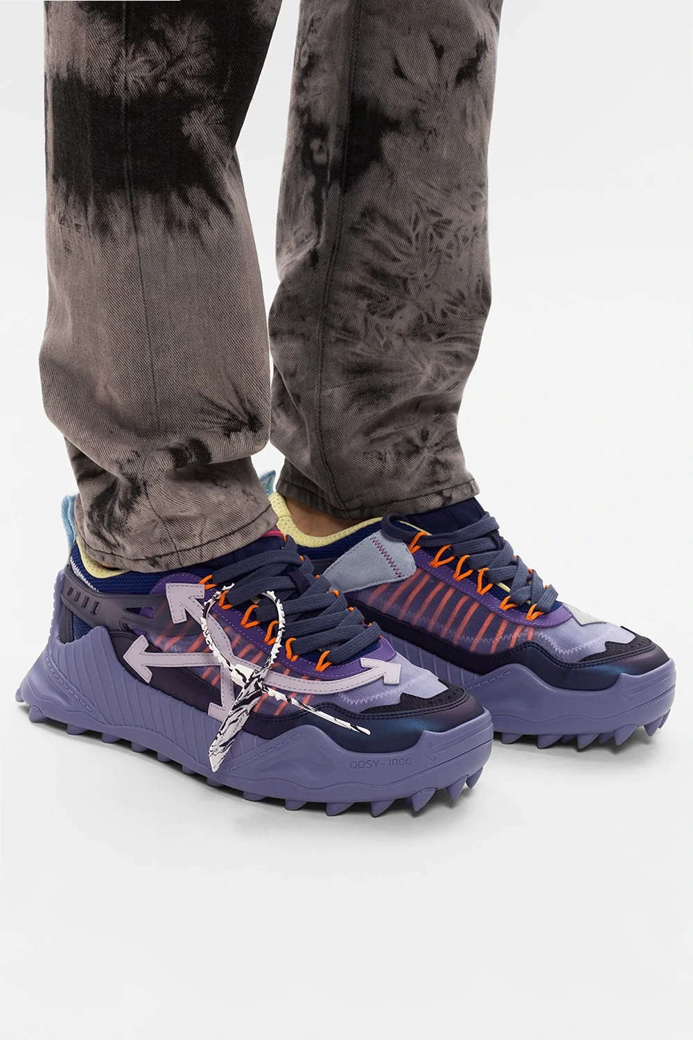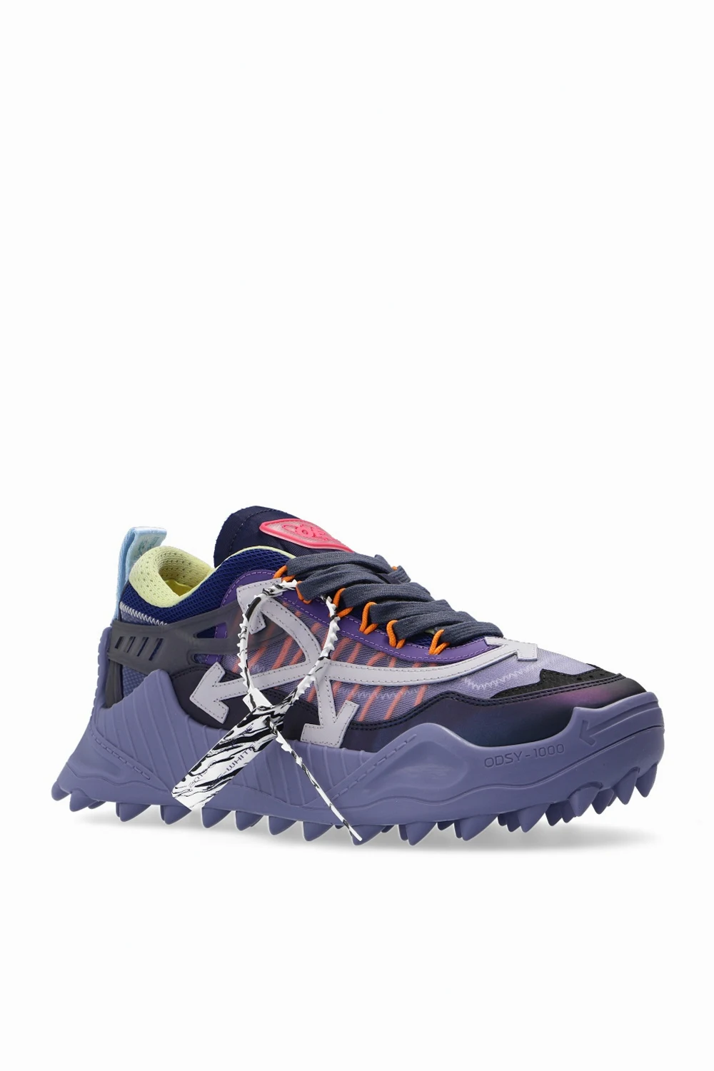 Multicoloured \'Odsy-1000\' sneakers from Off-White. Set on a distinctive, sculpted purple rubber sole, this lace-up model has leather overlays, a light violet logo detail on the side and a distinctive pink appliqué.