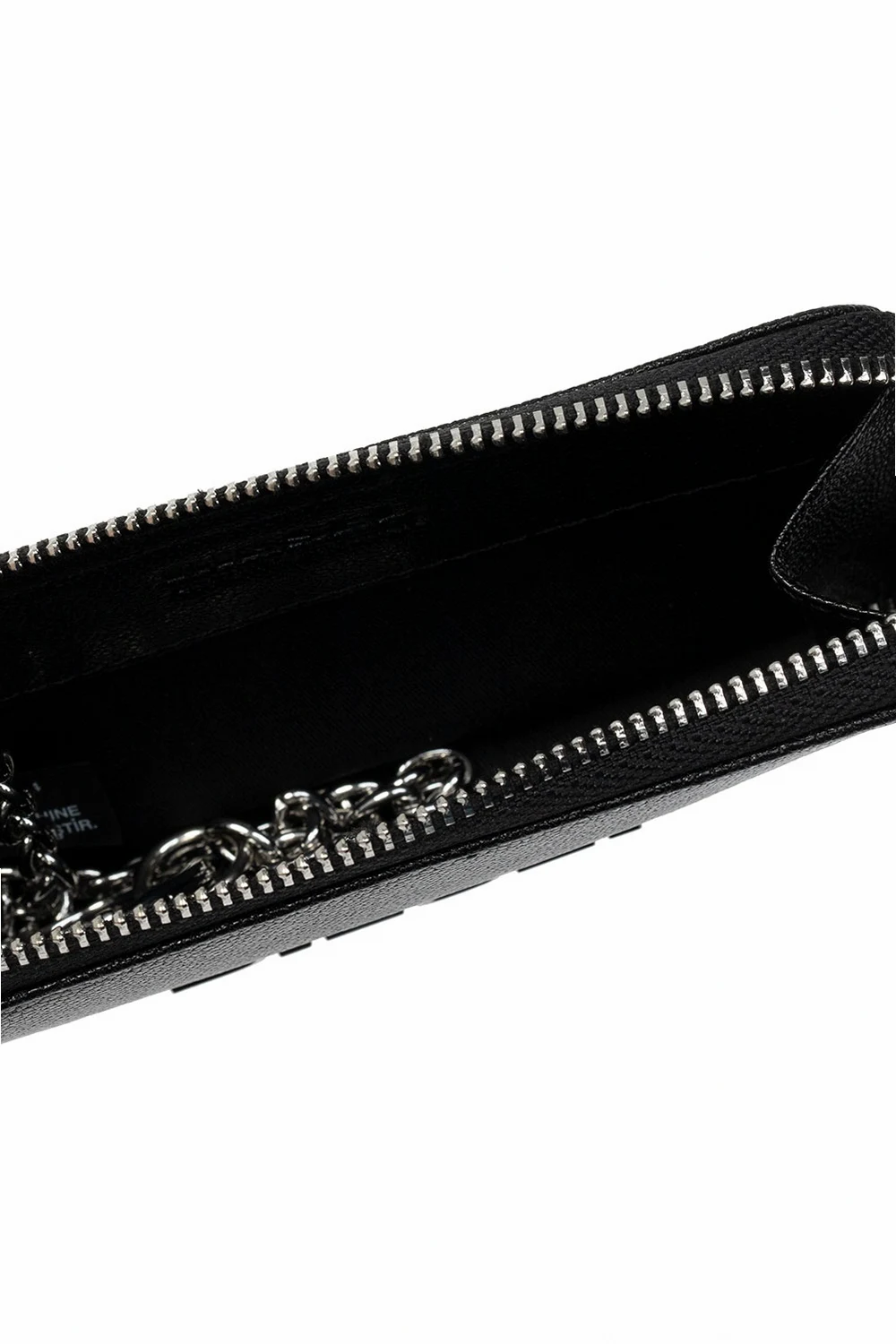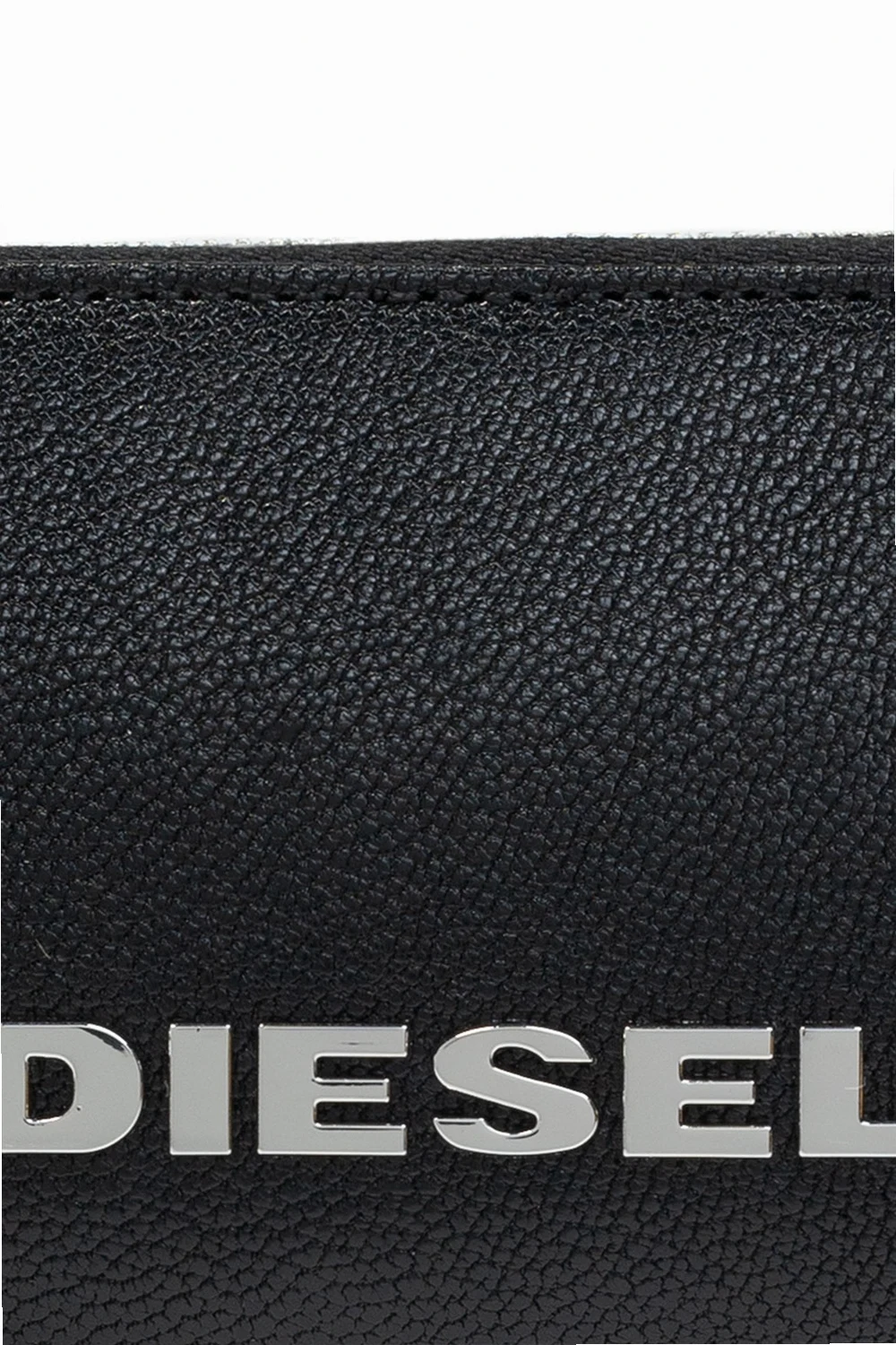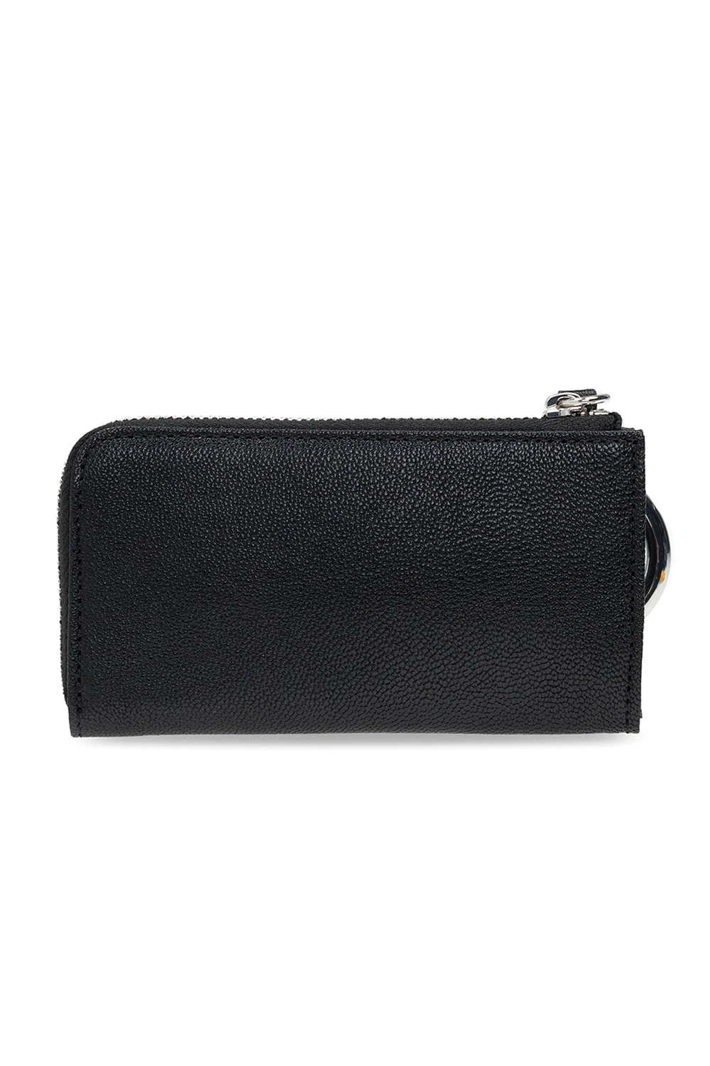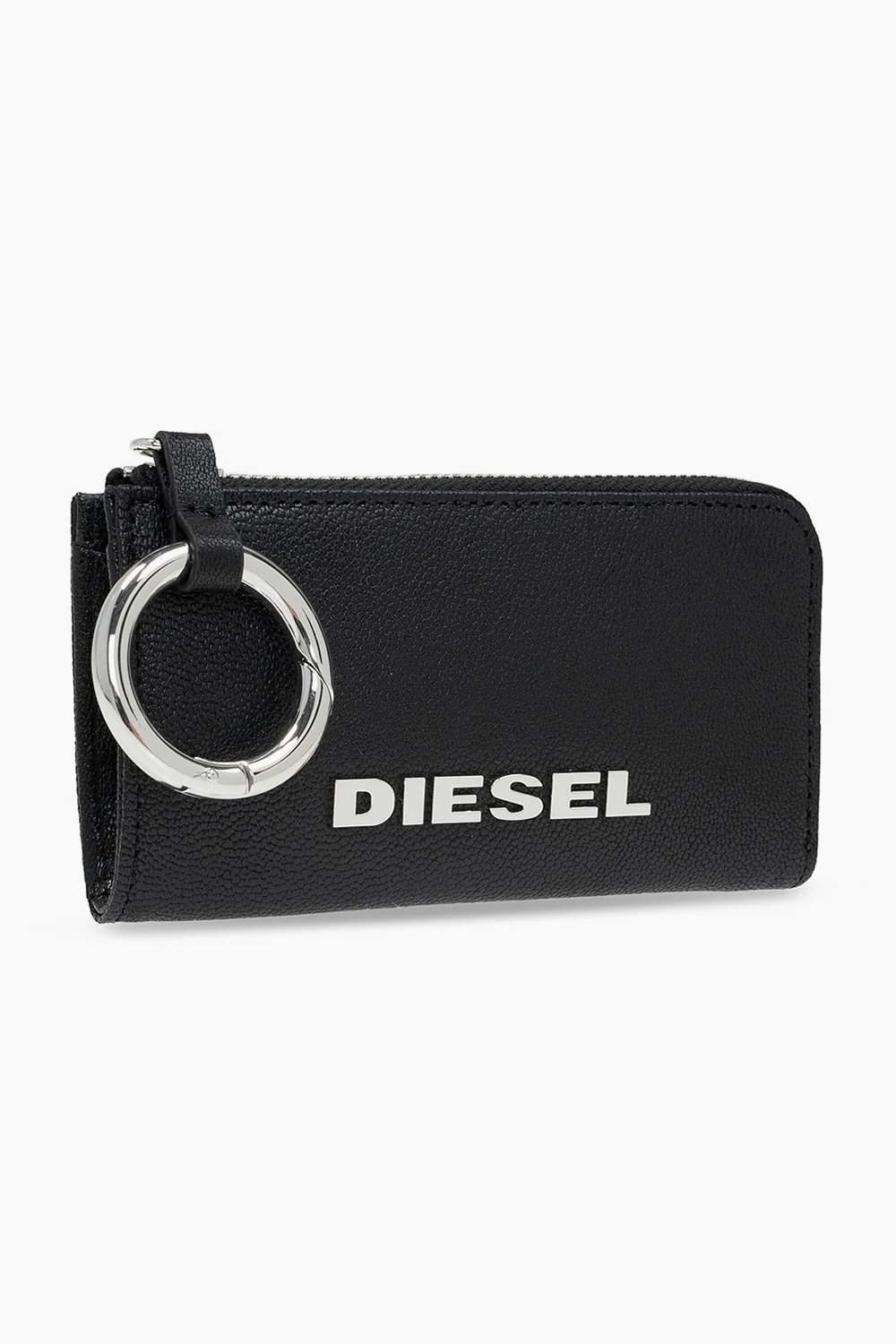 Black key holder from Diesel. Made of leather, this design features a zip fastening, logo appliqué, detachable keyring, silver-tone metal hardware and one internal compartment with a keyring on a chain.