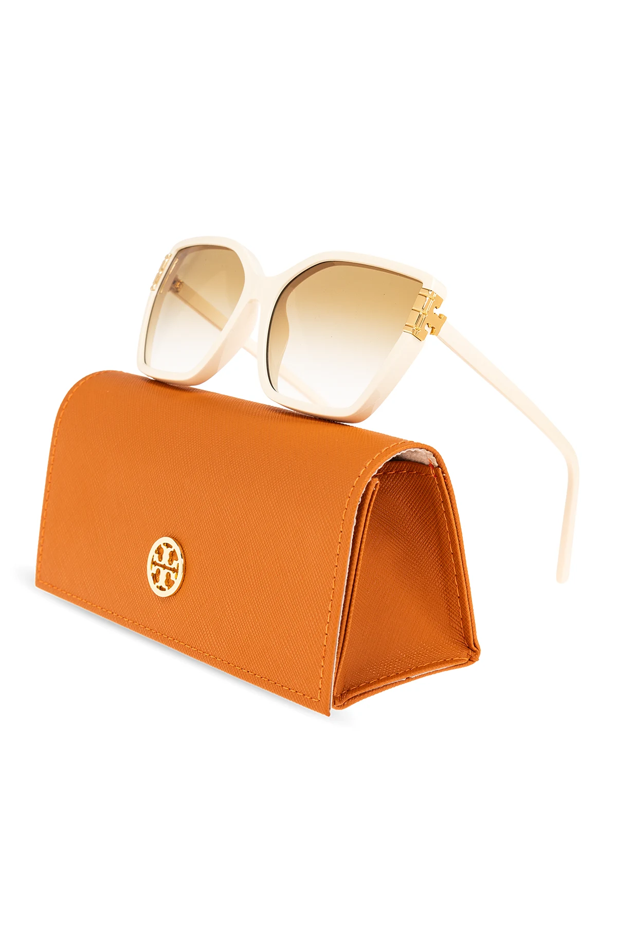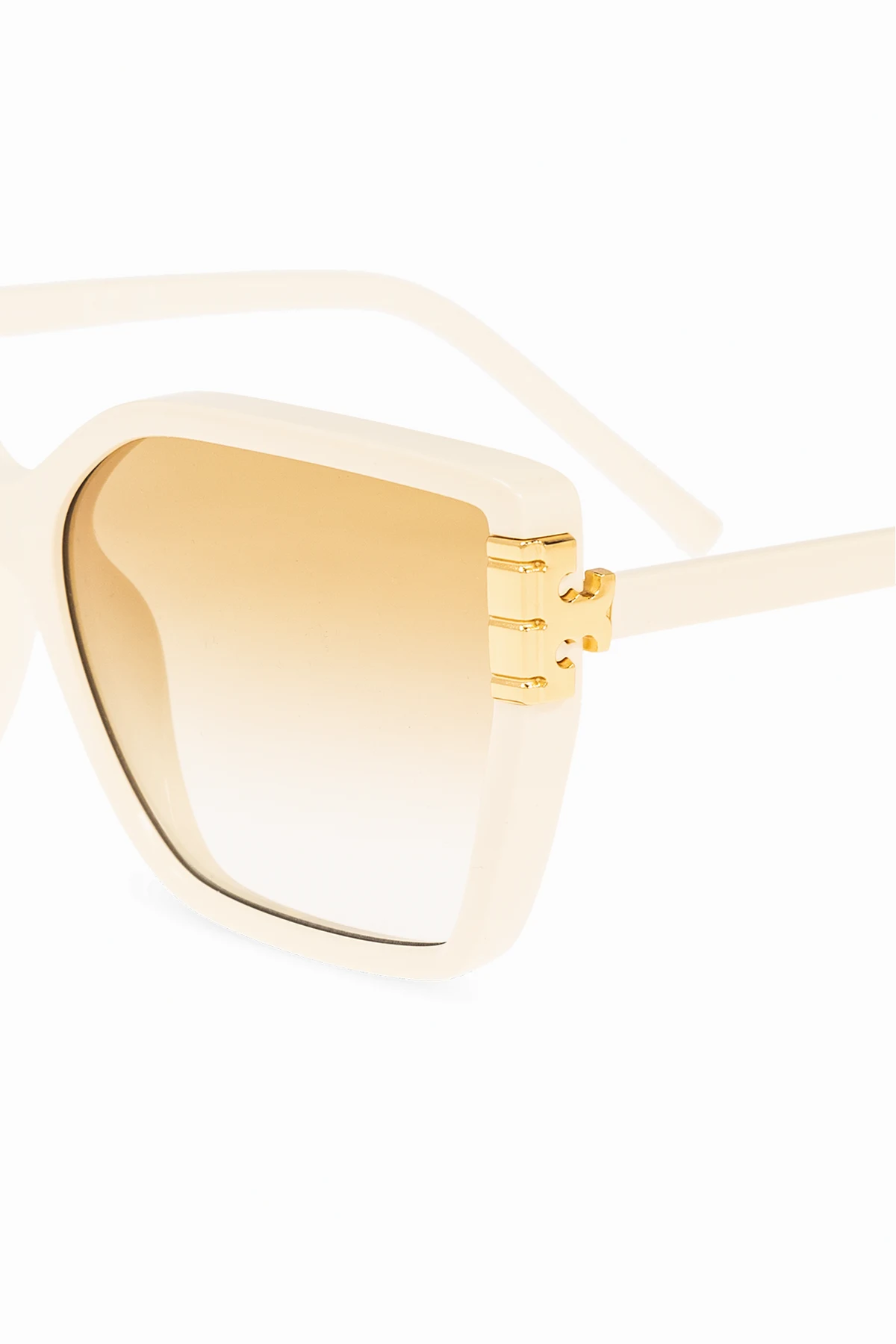Cream ‘Eleanor’ tortoiseshell sunglasses from Tory Burch. This model features a big square framework with a single bridge, integrated nose pads, gold-tone logo applications on the temples and yellow gradient lenses with UV protection. Comes with an orange snap-fastened case.