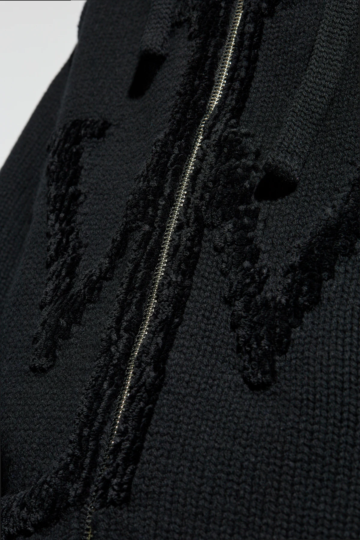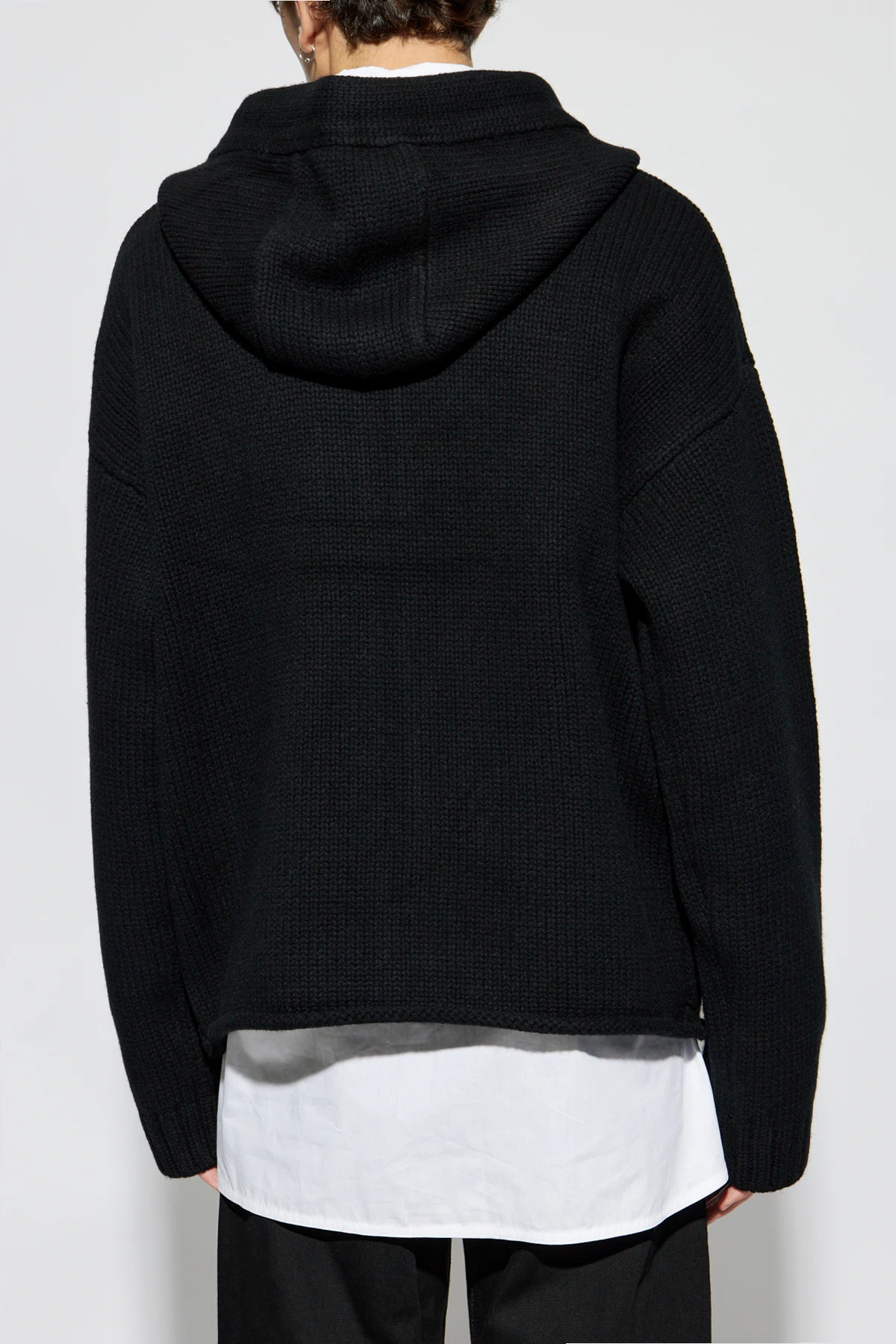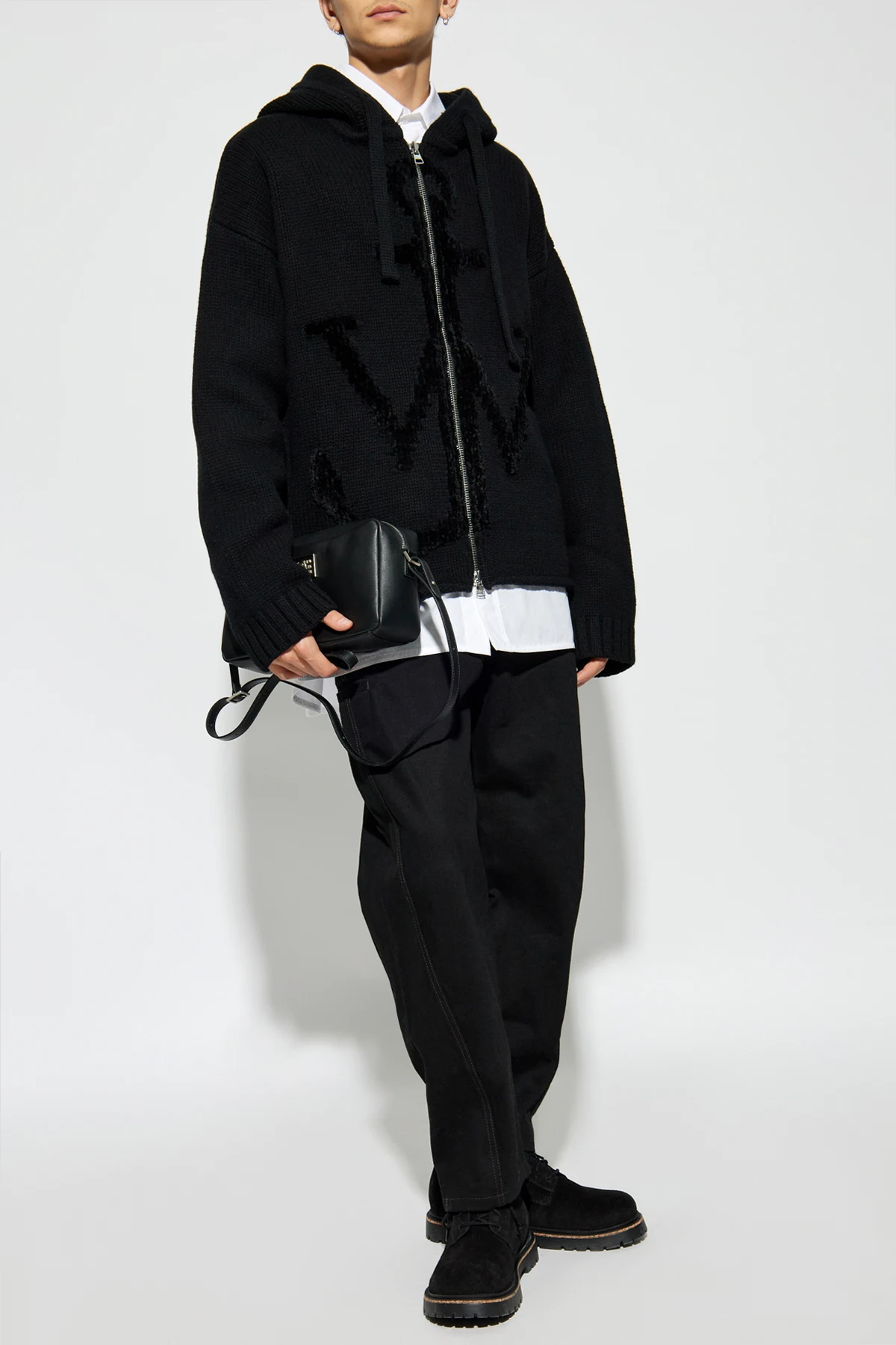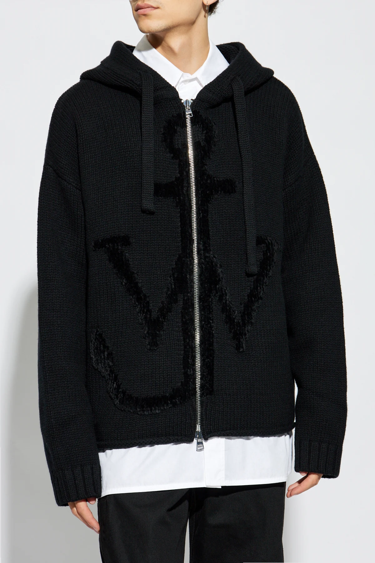 Introducing the Hooded Cardigan from the renowned designer JW Anderson, a paragon of modern elegance and sophisticated craftsmanship. This luxurious garment embodies contemporary style with a loose, oversized fit, complemented by long sleeves and an adjustable hood. Crafted from sumptuous, high-quality wool, the cardigan features a distinctive textured pattern on the front, showcasing the iconic \"JW\" logo intertwined with an anchor. The intricate design is rendered in a contrasting texture, creating a three-dimensional effect that exudes refinement. The front of the cardigan is adorned with a full-length zipper, while ribbed cuffs and hem ensure a snug, comfortable fit. The interior of the hood proudly displays the designer\'s label, affirming the garment\'s authenticity and exclusivity. Presented in a timeless black hue, this cardigan is the epitome of versatility, effortlessly elevating any ensemble. It is styled here with a crisp white shirt and black trousers, allowing the cardigan to remain the centerpiece of a sophisticated outfit. Why choose this product? Exquisite design by JW Anderson High-quality, heavyweight wool construction Unique textured \"JW\" and anchor pattern Full-length zipper for ease of wear Adjustable hood with designer label Ribbed cuffs and hem for added comfort