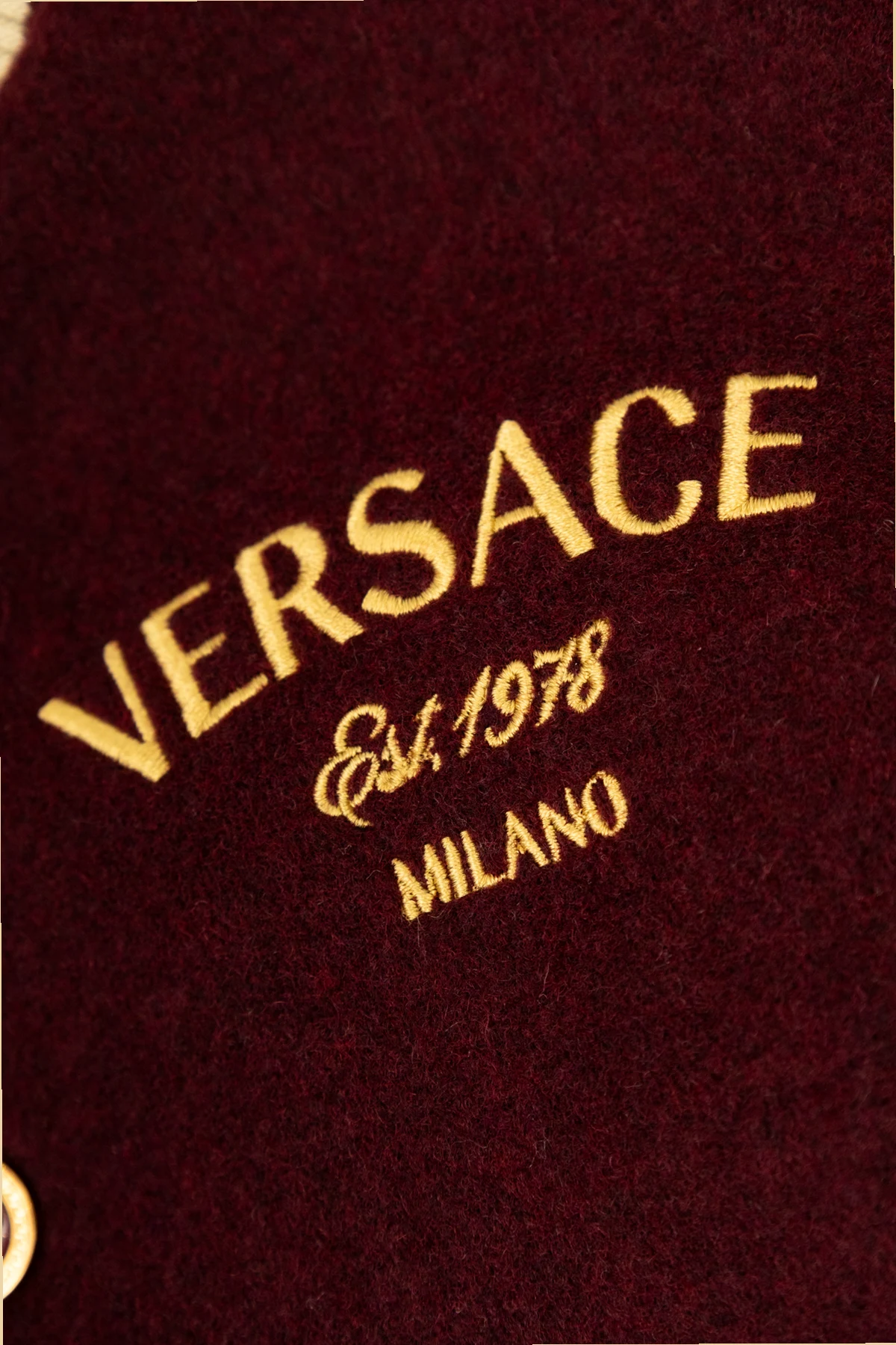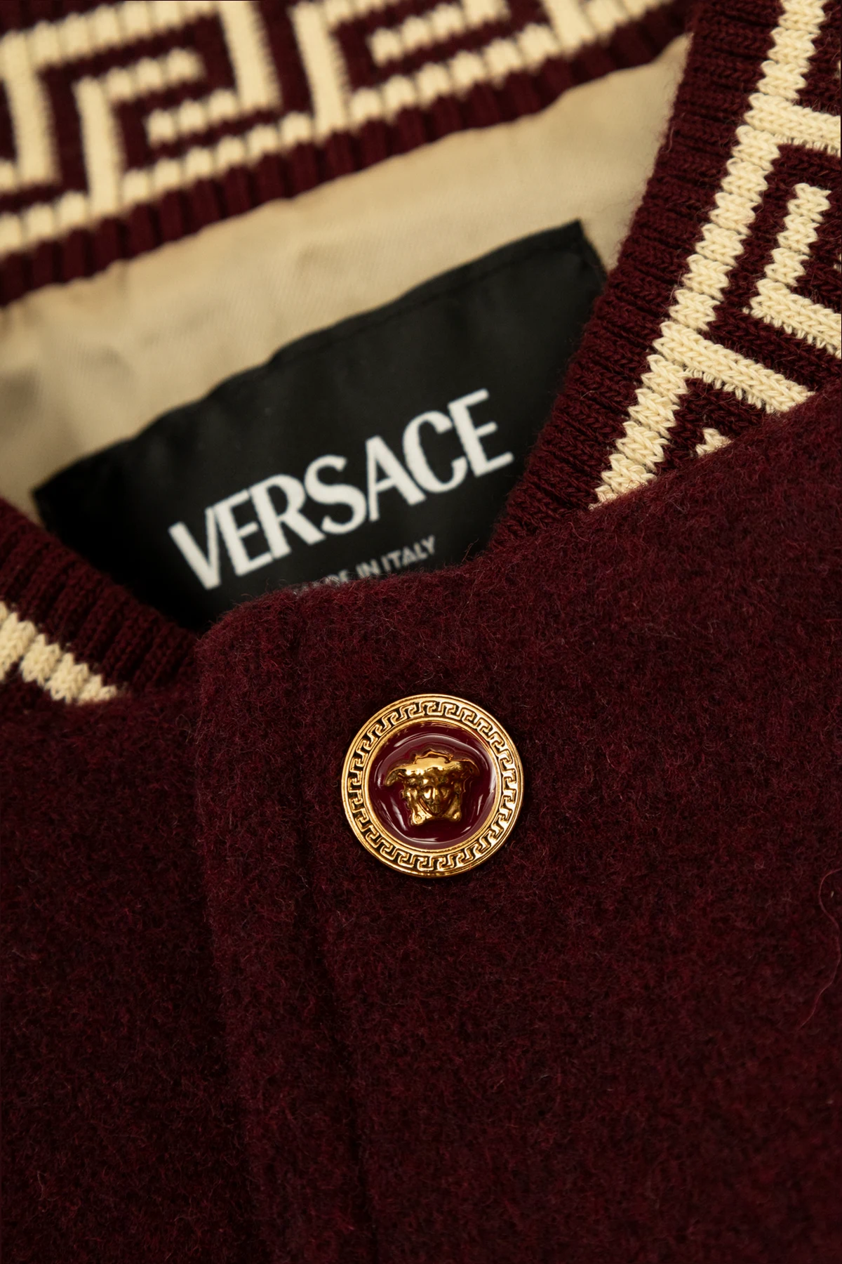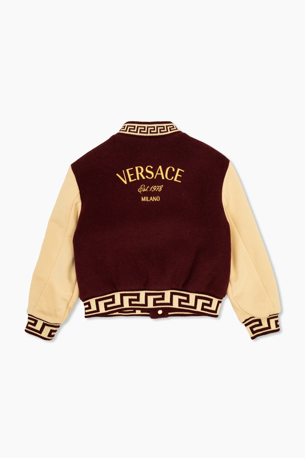 Introducing the epitome of sporty elegance and luxurious detailing, the Versace Kids Logo Jacket. Crafted with an exquisite blend of 70% wool and 20% nylon, this jacket marries comfort with high-end fashion. The dominant burgundy hue paired with contrasting cream sleeves sets a vibrant stage for this iconic piece, while the golden embroidery featuring the brand\'s name and establishment year \"Est. 1978 Milano\" adds a touch of opulence that is unmistakably Versace. The jacket\'s design takes inspiration from classic baseball jackets, updated with a distinctly luxurious twist. Elastic cuffs, collar, and hem are adorned with the signature Greek meander pattern, a hallmark of the brand, creating a striking contrast against the jacket\'s primary colors. The gold buttons, embossed with the Versace logo, further accentuate its luxurious appeal, ensuring that this piece is recognized as a product of high fashion lineage. Functionality meets elegance with two slip pockets, perfect for keeping essentials at hand, and a snap-button closure that ensures ease of wear while maintaining a sleek silhouette. The interior label proudly displays the Versace name, a testament to the authenticity and high-quality craftsmanship that goes into every piece. Why Purchase This Product? Exquisite Craftsmanship: Meticulously crafted with a premium wool blend, offering both warmth and durability. Luxurious Details: Golden embroidery and buttons, along with the iconic Greek meander pattern, elevate this jacket to a work of art. Iconic Design: A sporty silhouette with sophisticated touches reflects Versace\'s renowned design ethos. Versatile Elegance: Effortlessly transitions from casual to more formal settings, encapsulating true versatility.