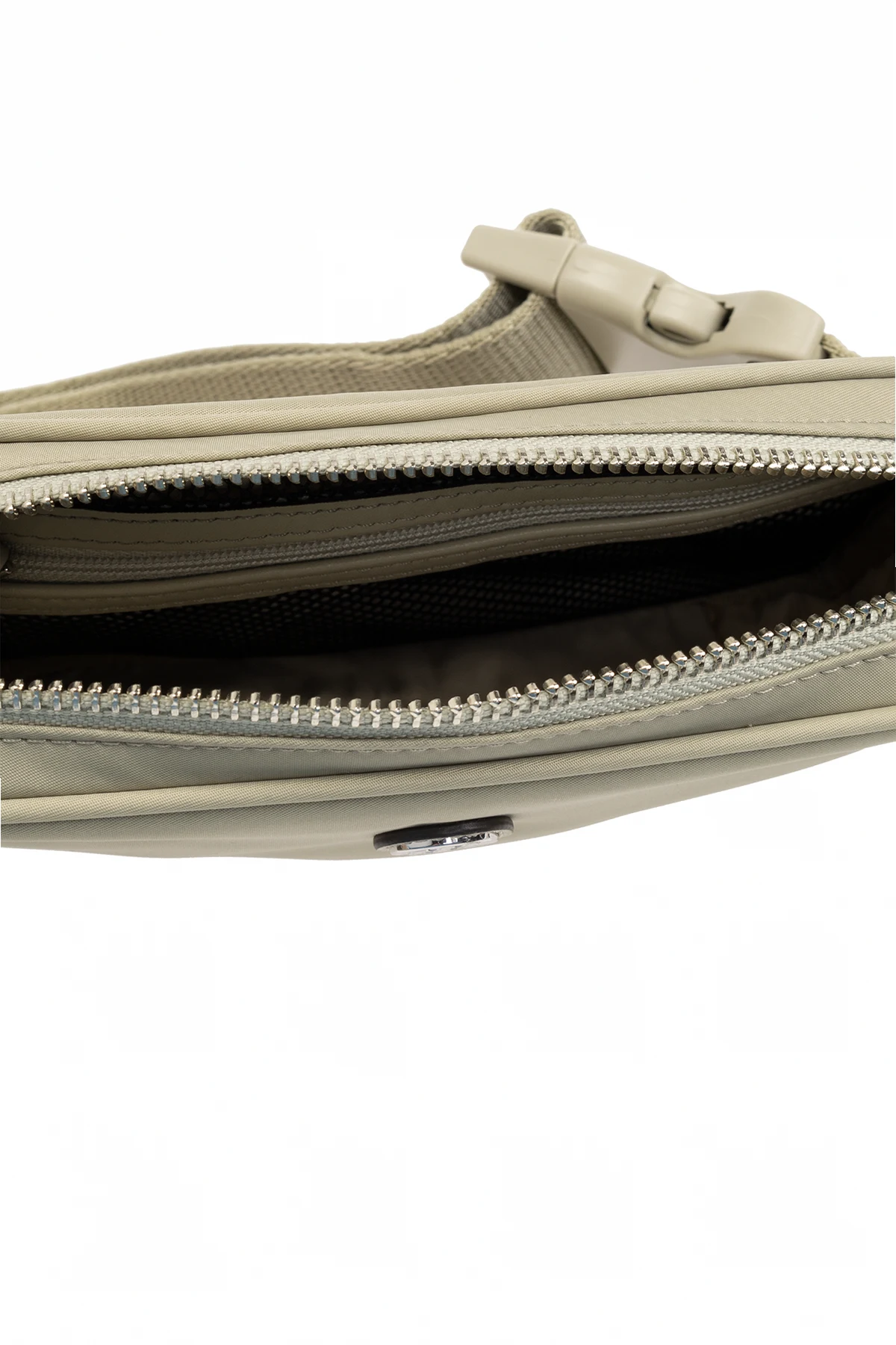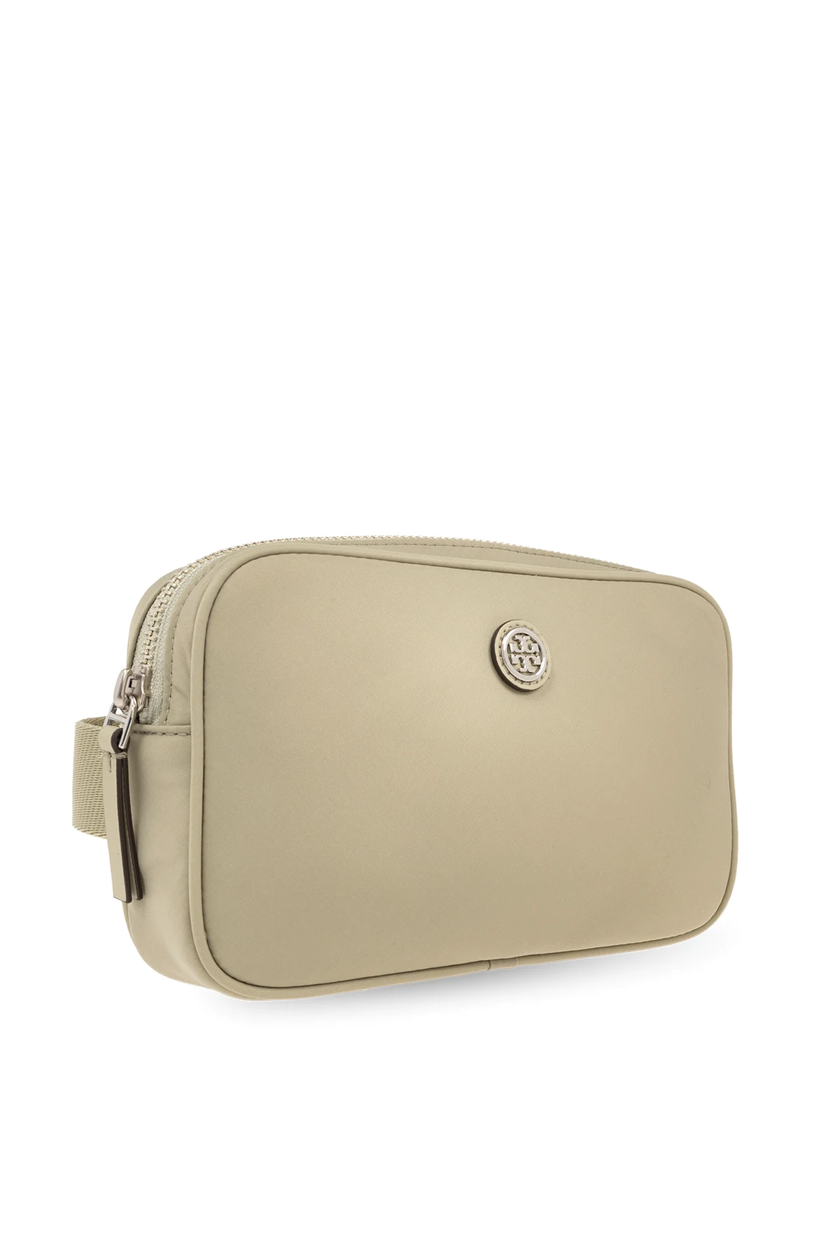 Greenish grey ‘Virginia’ belt bag from Tory Burch. Made of technical fabric, this model features a zip fastening, patch with a metal logo detail, back pocket with a magnetic snap, adjustable buckle strap, silver-tone metal hardware and one internal compartment with one zip pocket.
