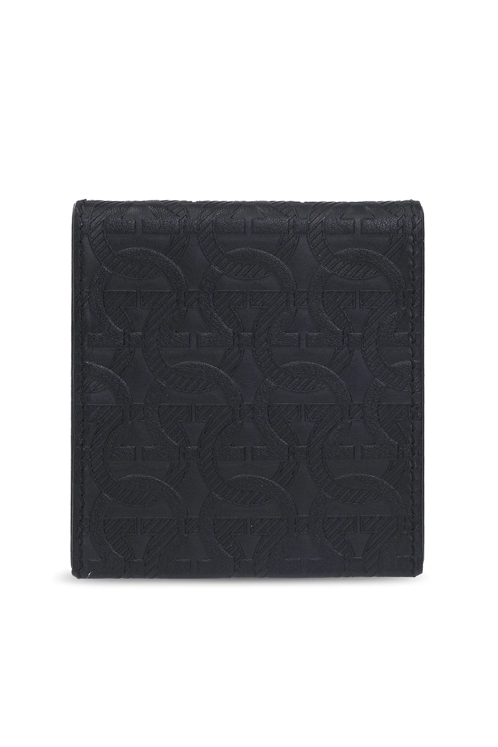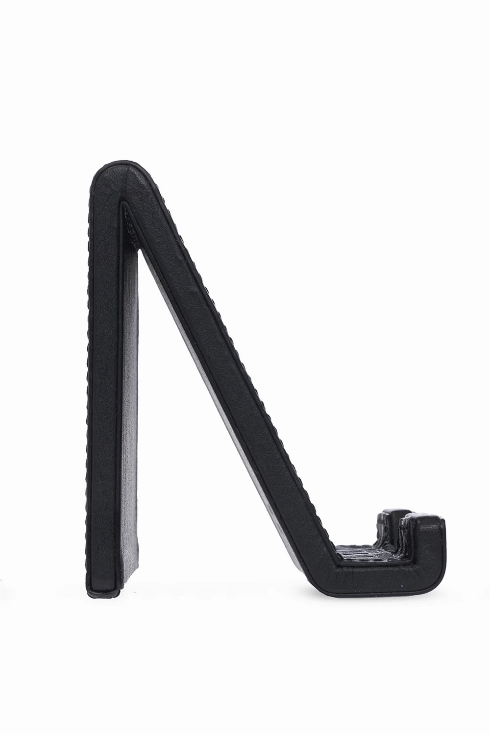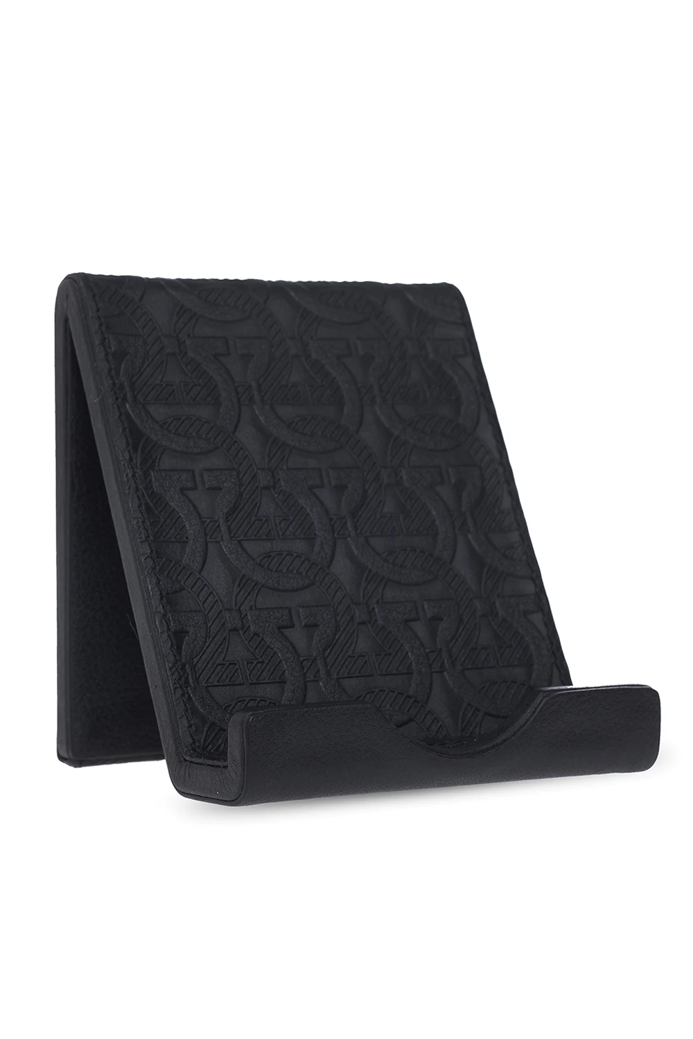 Black desktop smartphone holder from Salvatore Ferragamo. This item is covered in calf leather with an embossed iconic Gancini pattern.