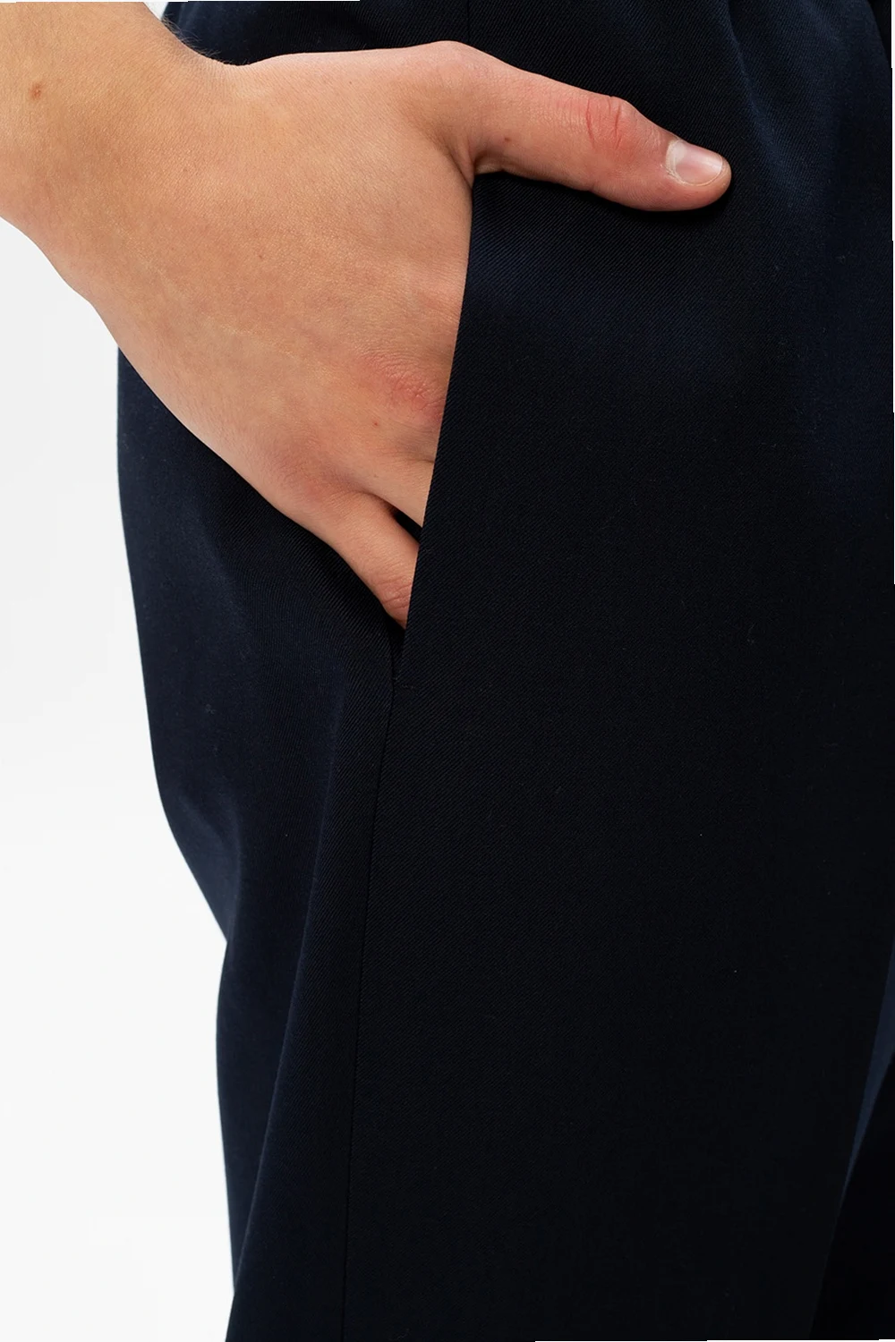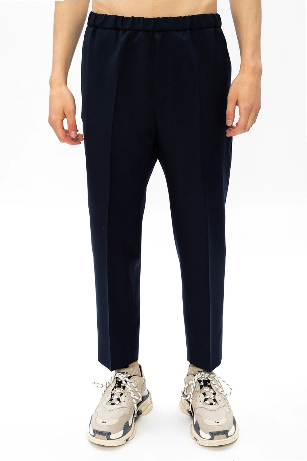 Navy pleat-front trousers from Jil Sander. Made of wool, this straight leg design features an elasticated waistband, zip fastening and four slip pockets.