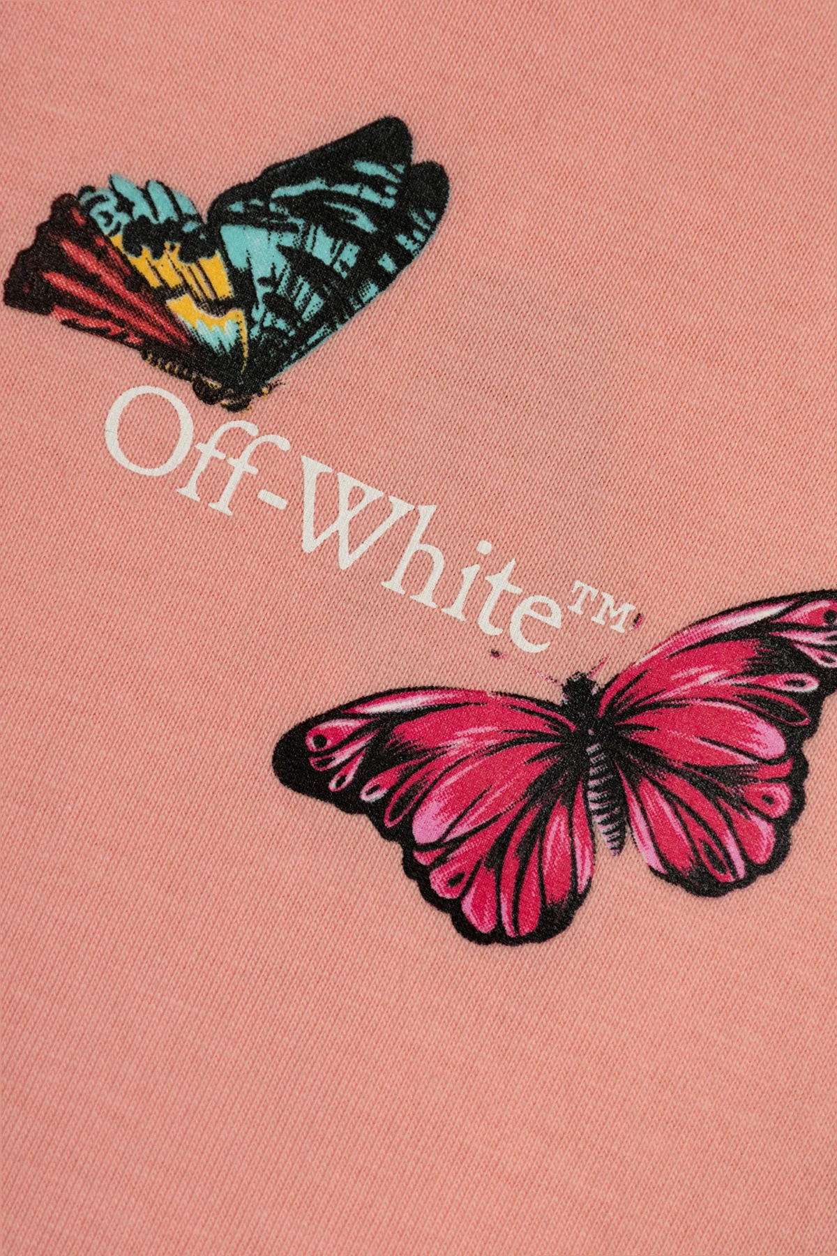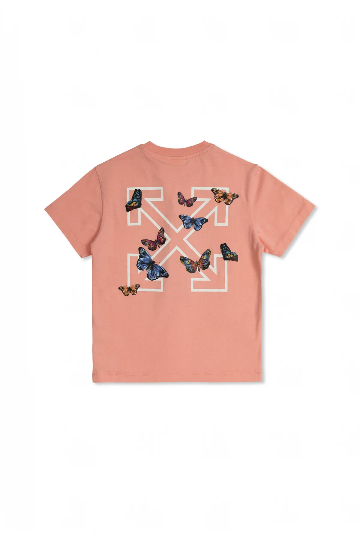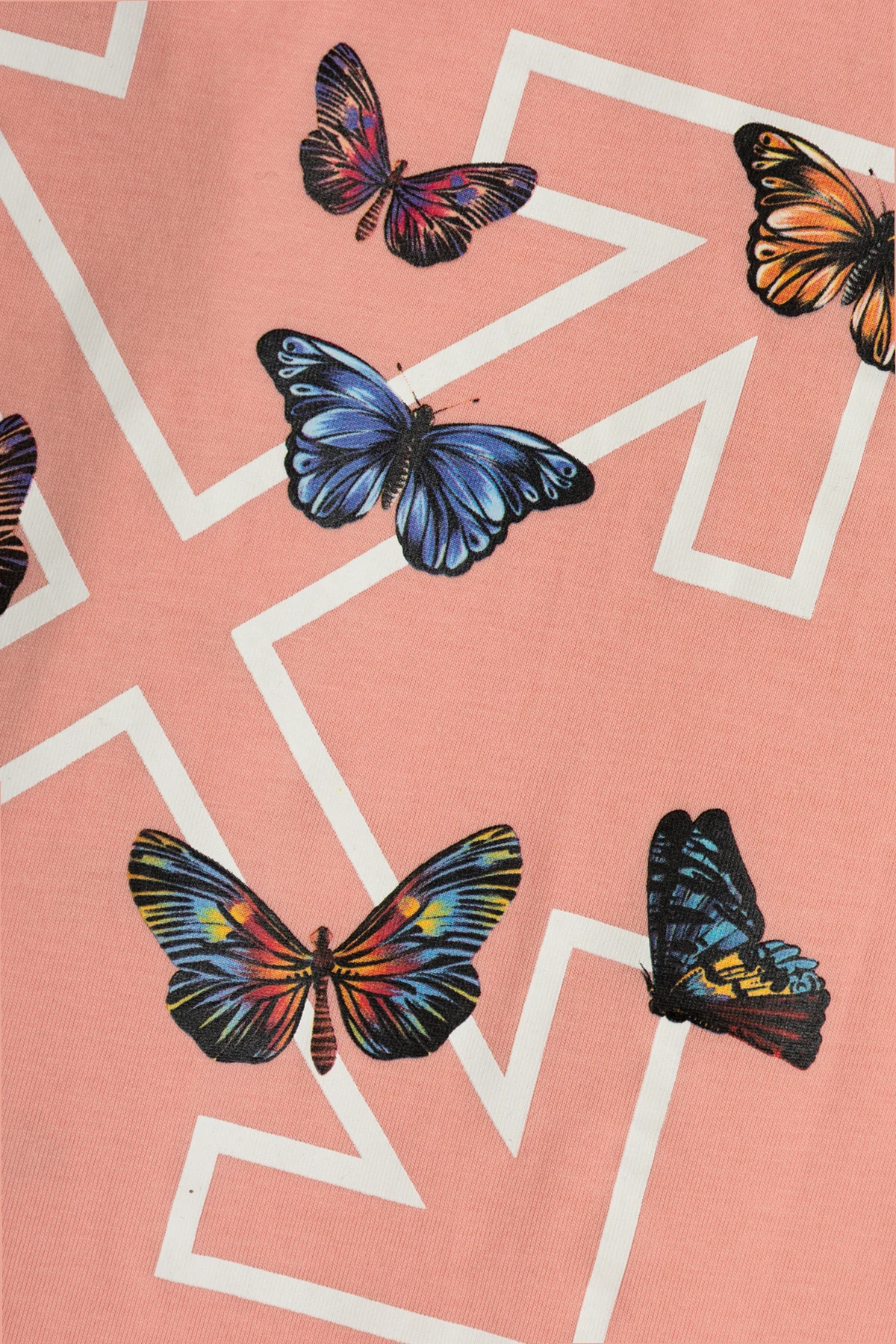 Introducing the Pink Graphic T-shirt from the exclusive Off-White Kids collection, a masterpiece of minimalist elegance and youthful vibrancy. This charming T-shirt features a simple silhouette with short sleeves, offering comfort and ease of movement for children aged 4-14. Adorned with a colorful print of two butterflies on the front, accompanied by the iconic \"Off-White™\" logo, this piece exudes a playful yet sophisticated charm. The back showcases an exquisite design of multiple butterflies set against the brand\'s signature arrow pattern, embodying a fusion of art and fashion. Crafted from 100% cotton, this T-shirt promises ultimate comfort and breathability, making it a perfect choice for both casual and stylish occasions. Why Choose This Product? Exquisite design with vibrant butterfly motifs Iconic Off-White™ branding Superior comfort with 100% cotton fabric Perfect blend of style and practicality