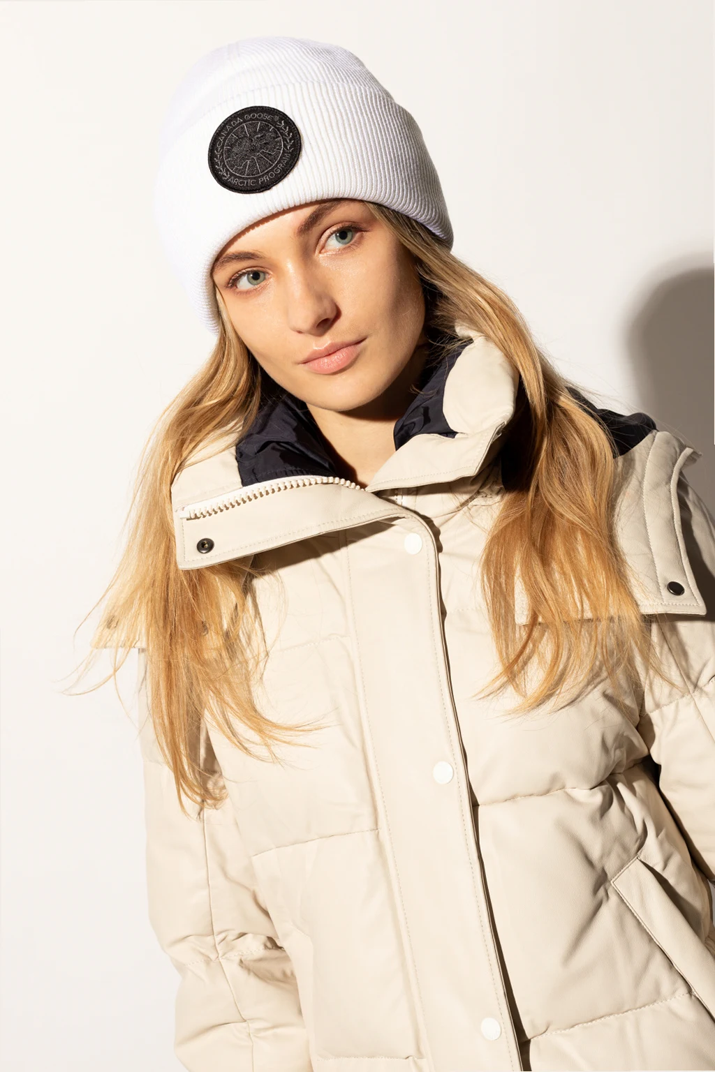 Cream hat from Canada Goose. Crafted from wool, this item showcases a black and grey logo patch on the front.