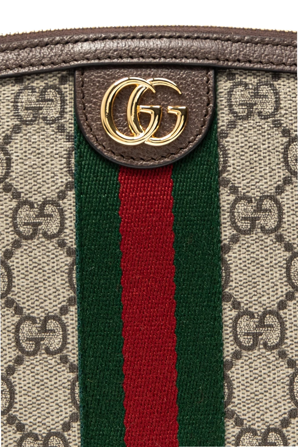 Beige and grey wash bag from Gucci. Crafted from GG Supreme canvas, this item fastens with a zip and is complete with a green-red-green Web stripe and one internal compartment.