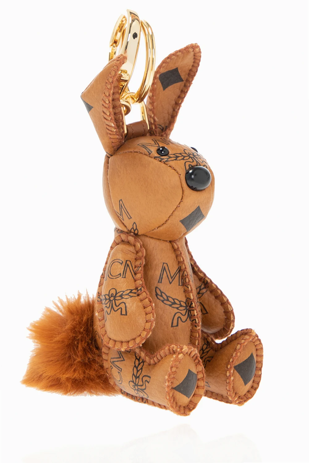 Brown and black keyring with an animal motif from MCM. Crafted from leather and Visetos canvas with fabric trims, this item features a logo pattern, stitching details and gold-tone metal hardware, including a keyring and snap hook.