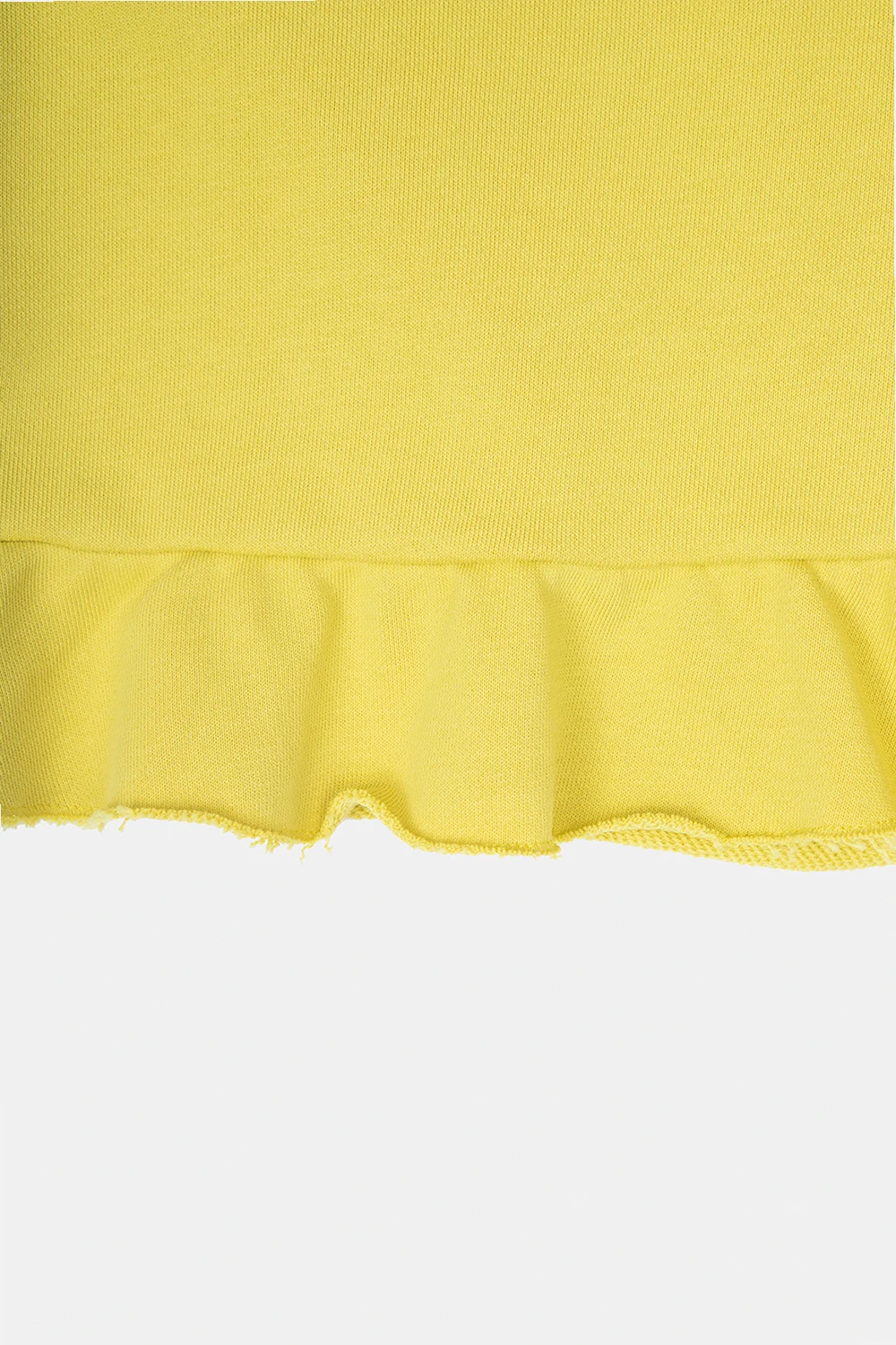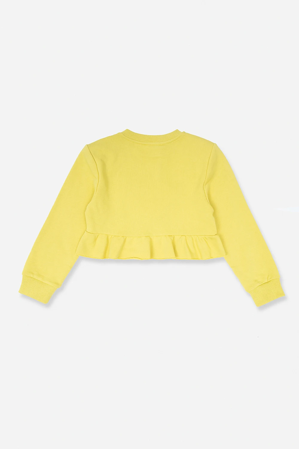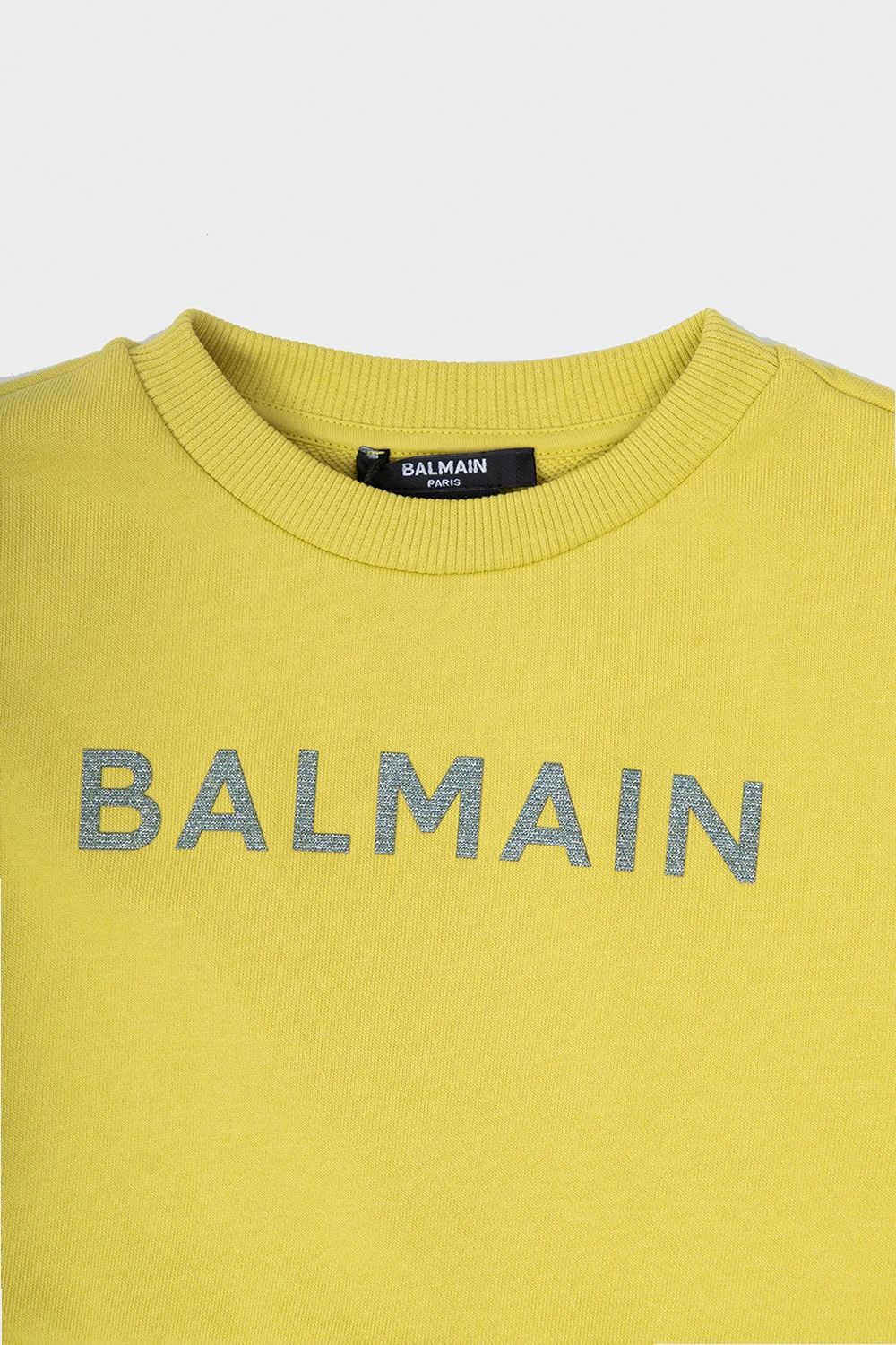 Greenish yellow crewneck sweatshirt from Balmain Kids. Made of cotton, this design features a silver-tone logo print with a metallic finish, padded shoulders, raw-trimmed ruffle at the hem and long sleeves with ribbed cuffs.