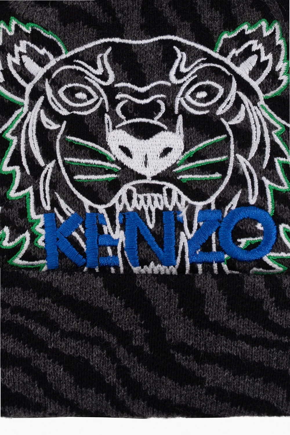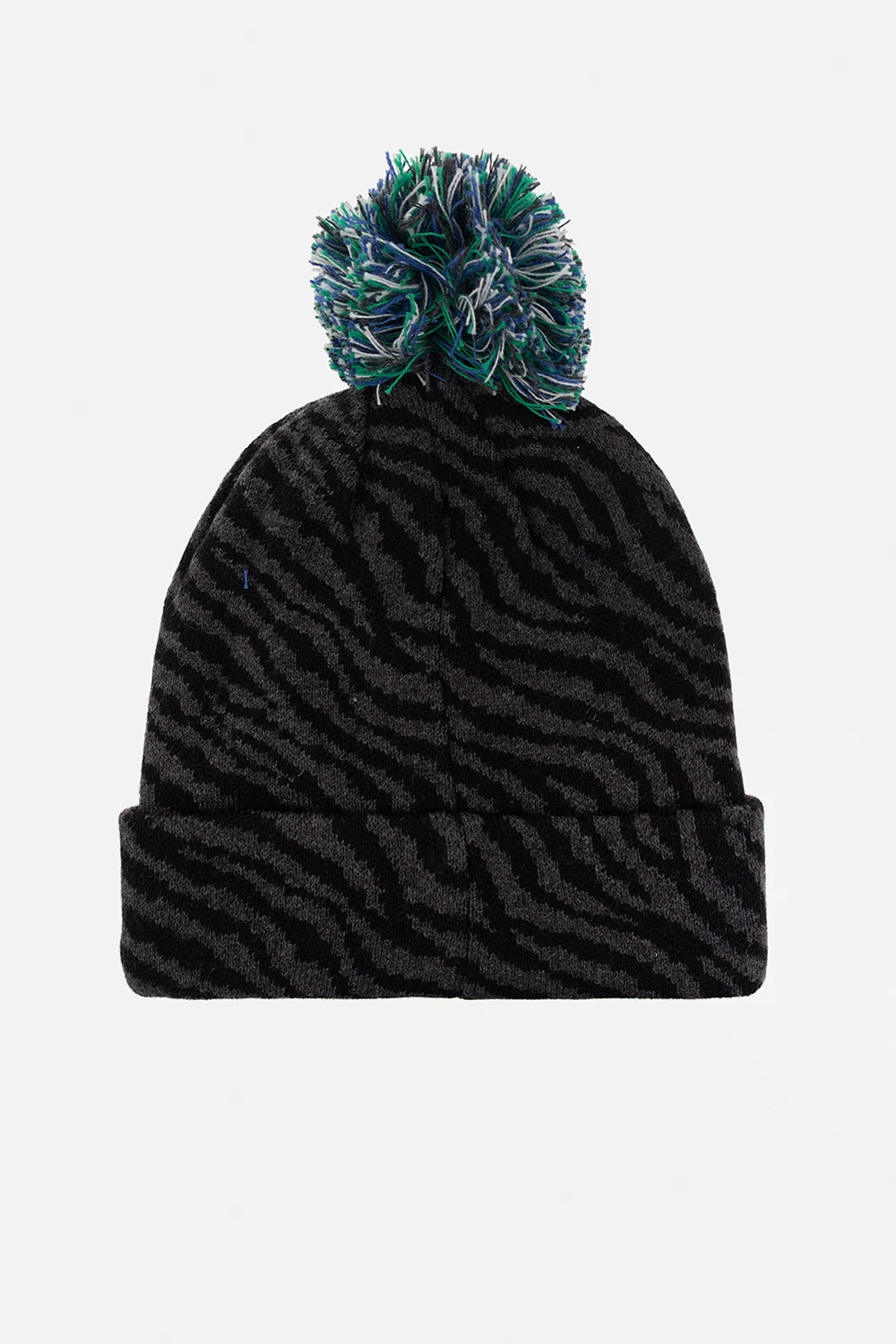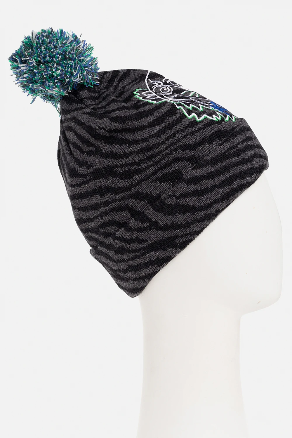Black and grey beanie with a multicolored pom-pom and folded brim from Kenzo Kids. Decorated with an animal pattern, multicolored logo embroidery and the brand’s signature tiger motif.
