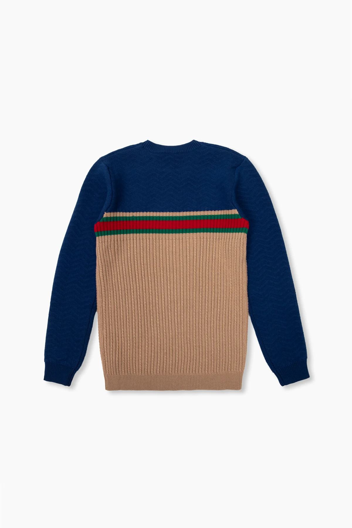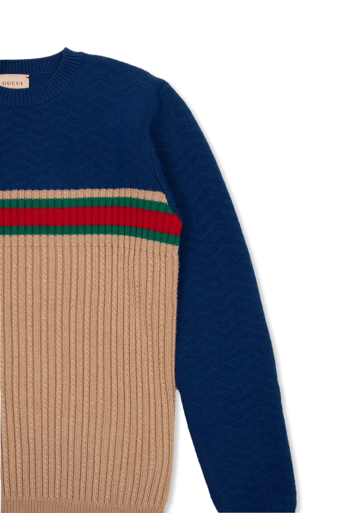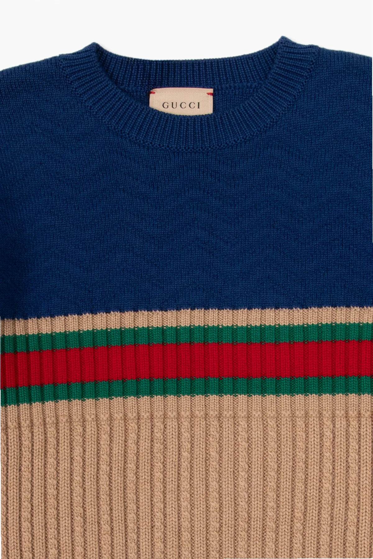 Beige and dark blue sweater from Gucci Kids. Made of wool, this garment is enriched by a green and red Web stripe and ribbed trims at the crew neck, hem and cuffs.