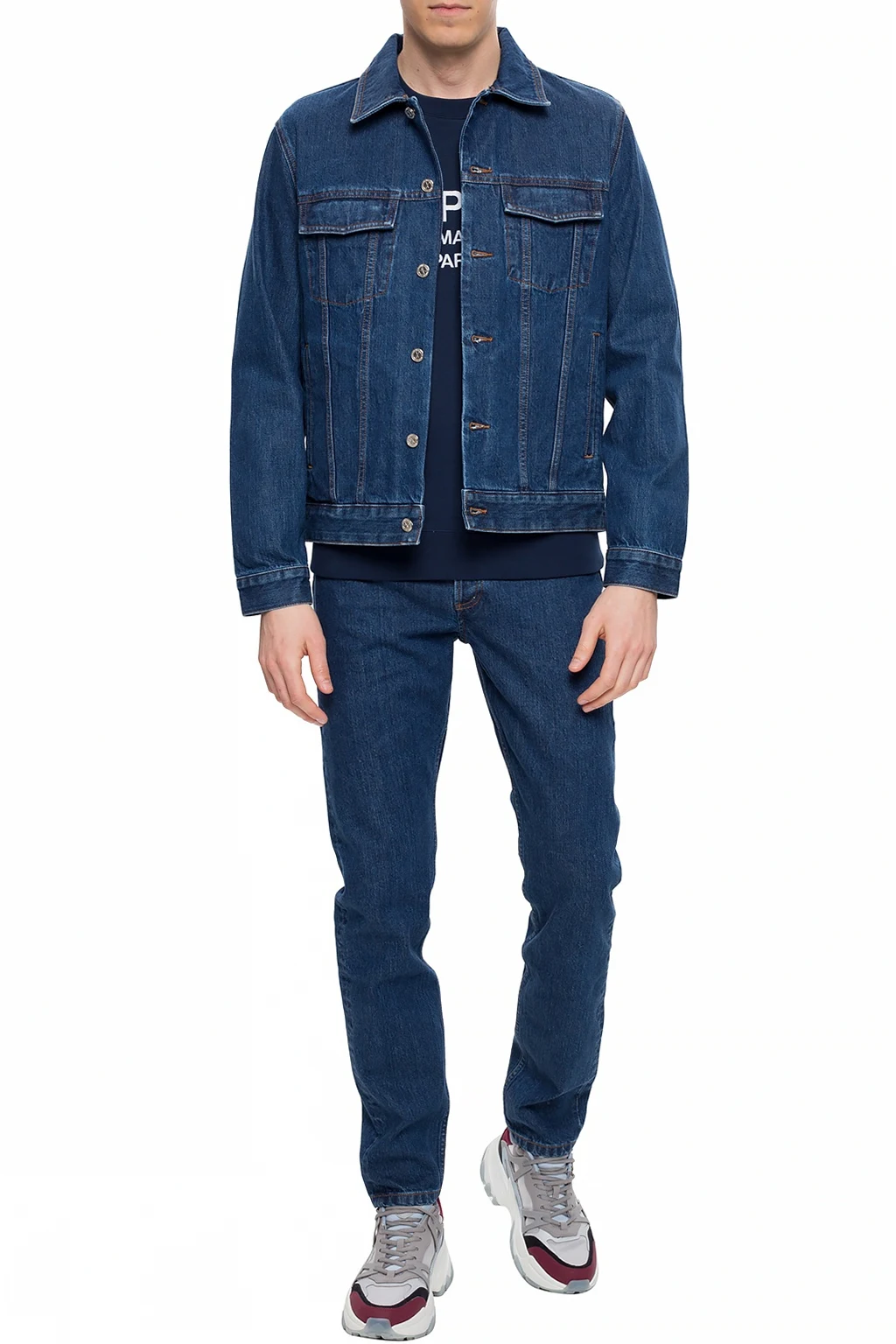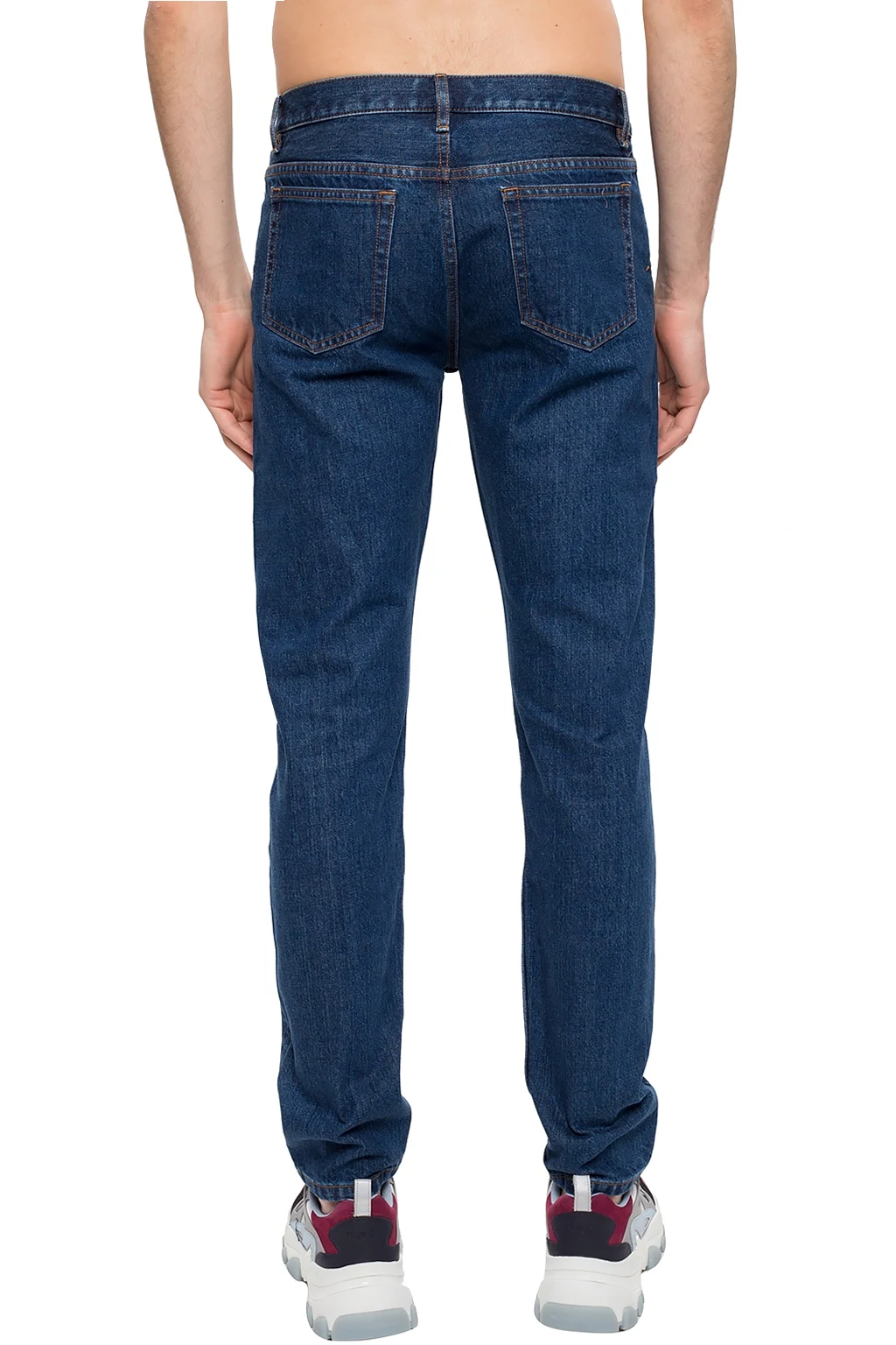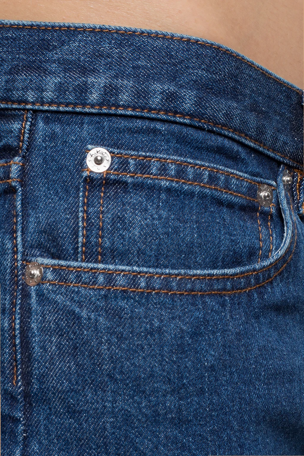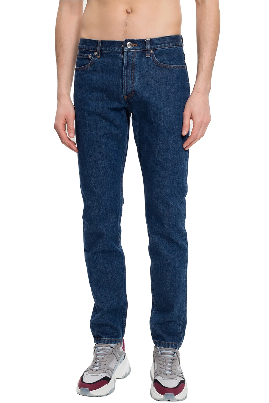 Navy jeans from A.P.C. Fastened with buttons. Decorated with stitching details in orange. 3 slip pockets on the front, 2 at the back. Tapered legs.