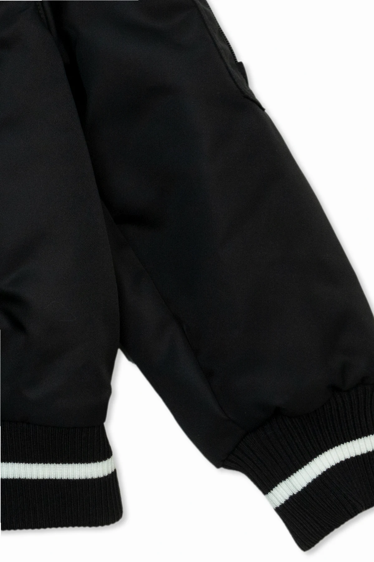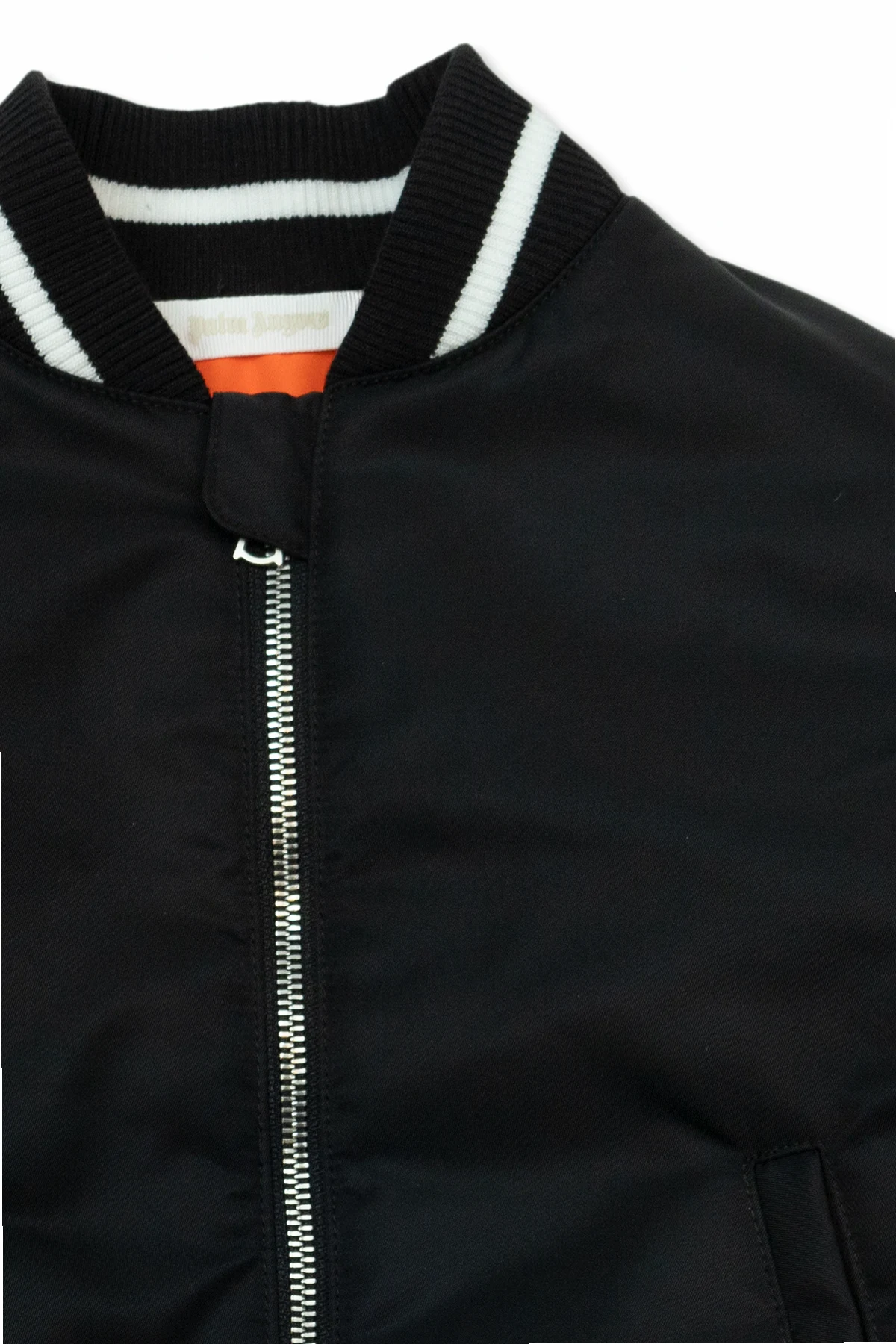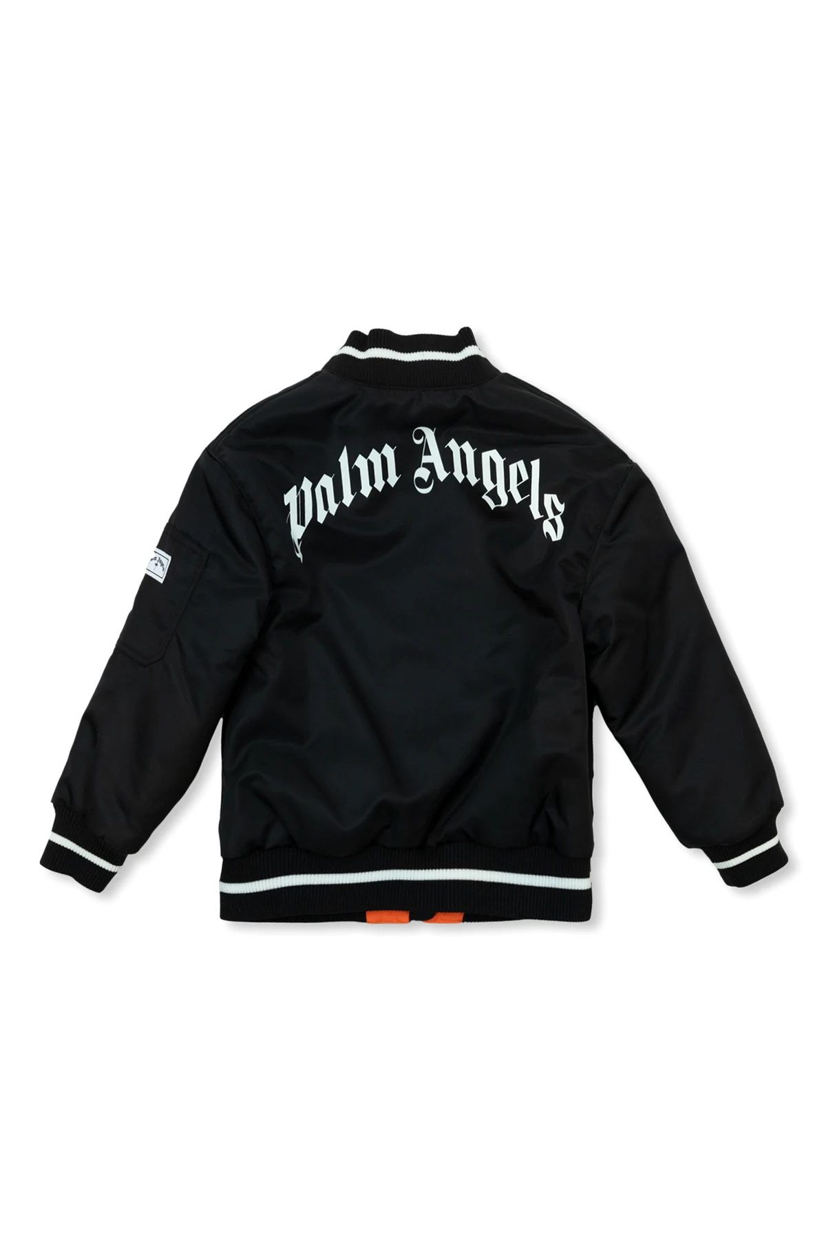 Black padded bomber jacket from Palm Angels Kids. Printed at back with a white logo, this style fastens via a zip and features a branded sleeve patch, two slip pockets, one zip pocket and white and black ribbing on the collar, bottom hem and cuffs.