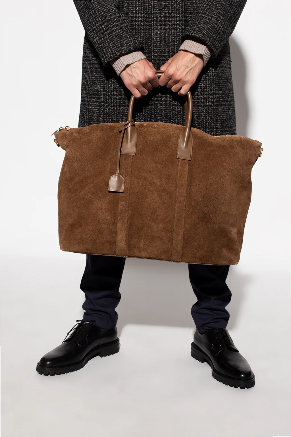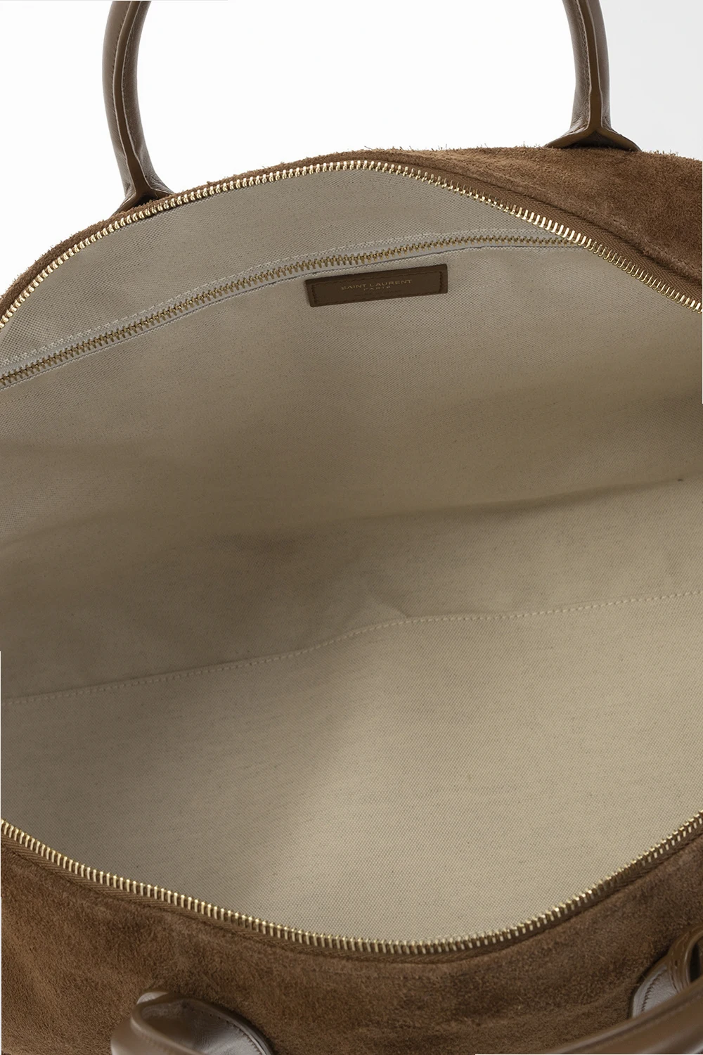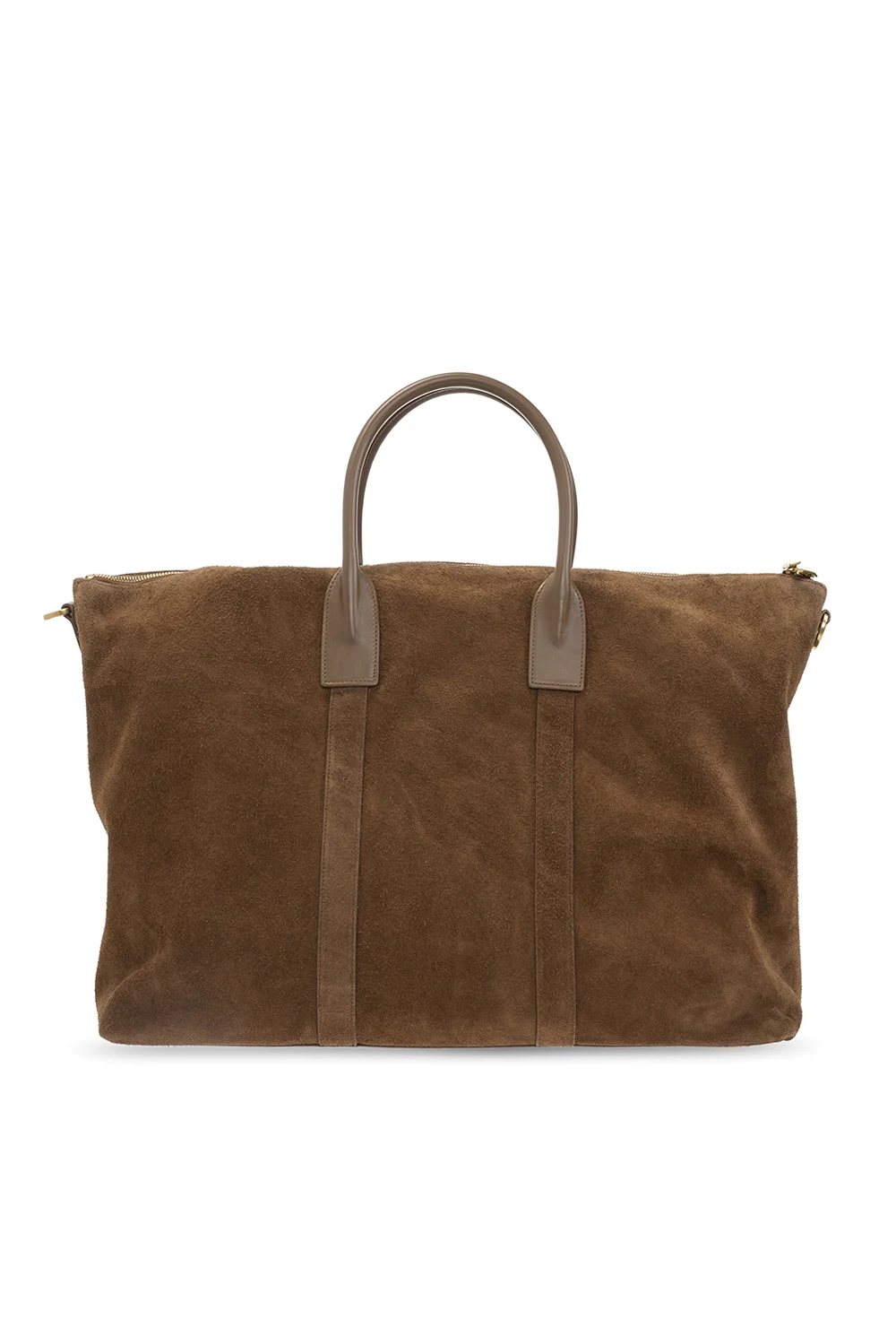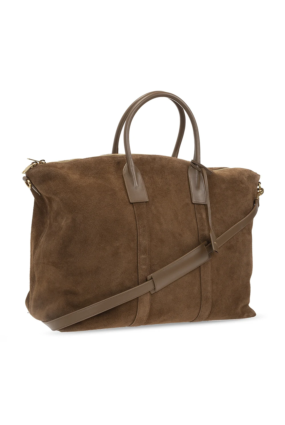 Brown ‘Giant’ holdall bag from Saint Laurent. Crafted from suede, this model fastens with a zip and is complete with two half-round handles with a charm, detachable and adjustable straps with a chain, gold-tone metal hardware and one internal compartment with one zip pocket.