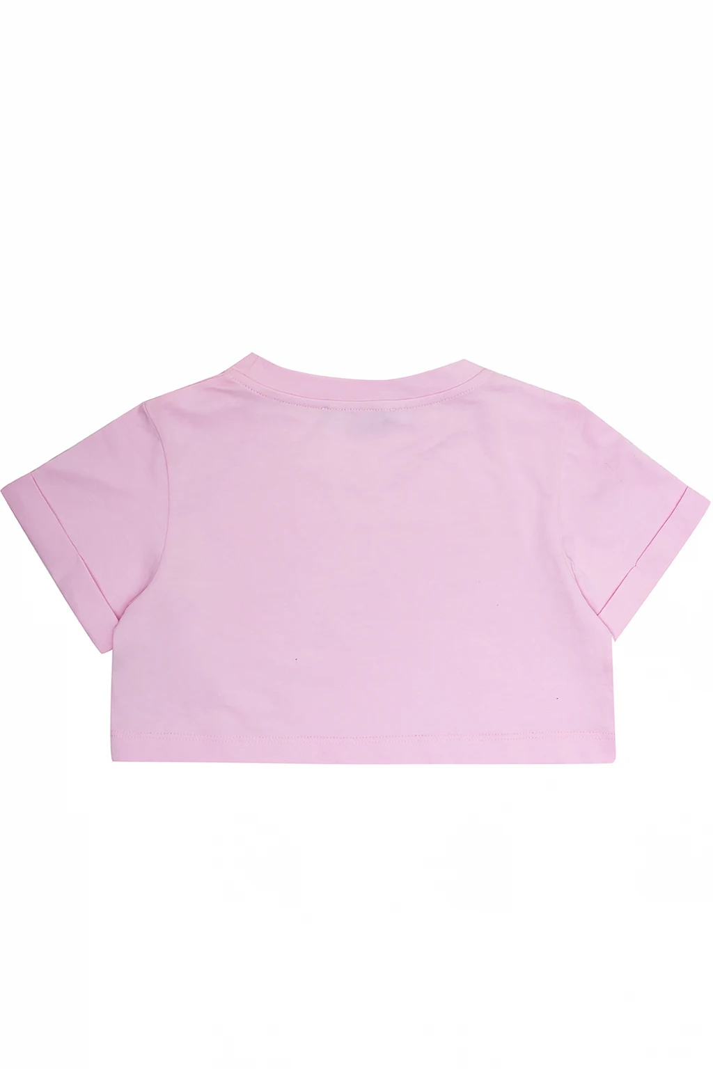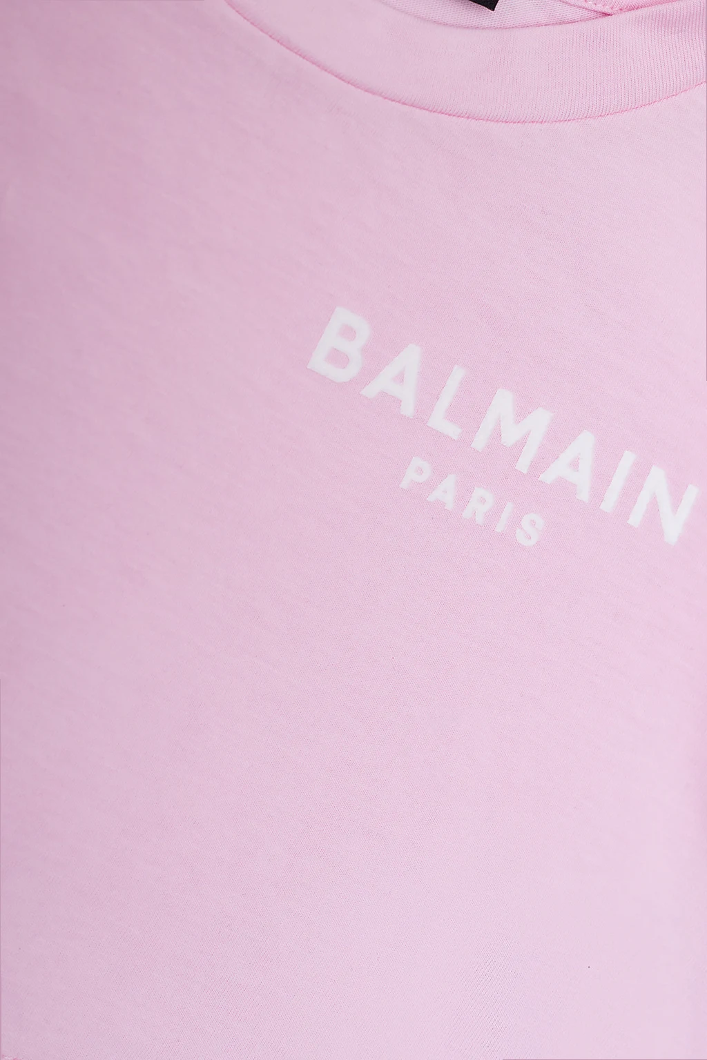 Light pink crewneck T-shirt from Balmain Kids. Made of cotton with a cropped fit, this style features a white velvet-flocked logo on the front and short sleeves with rolled-up cuffs.
