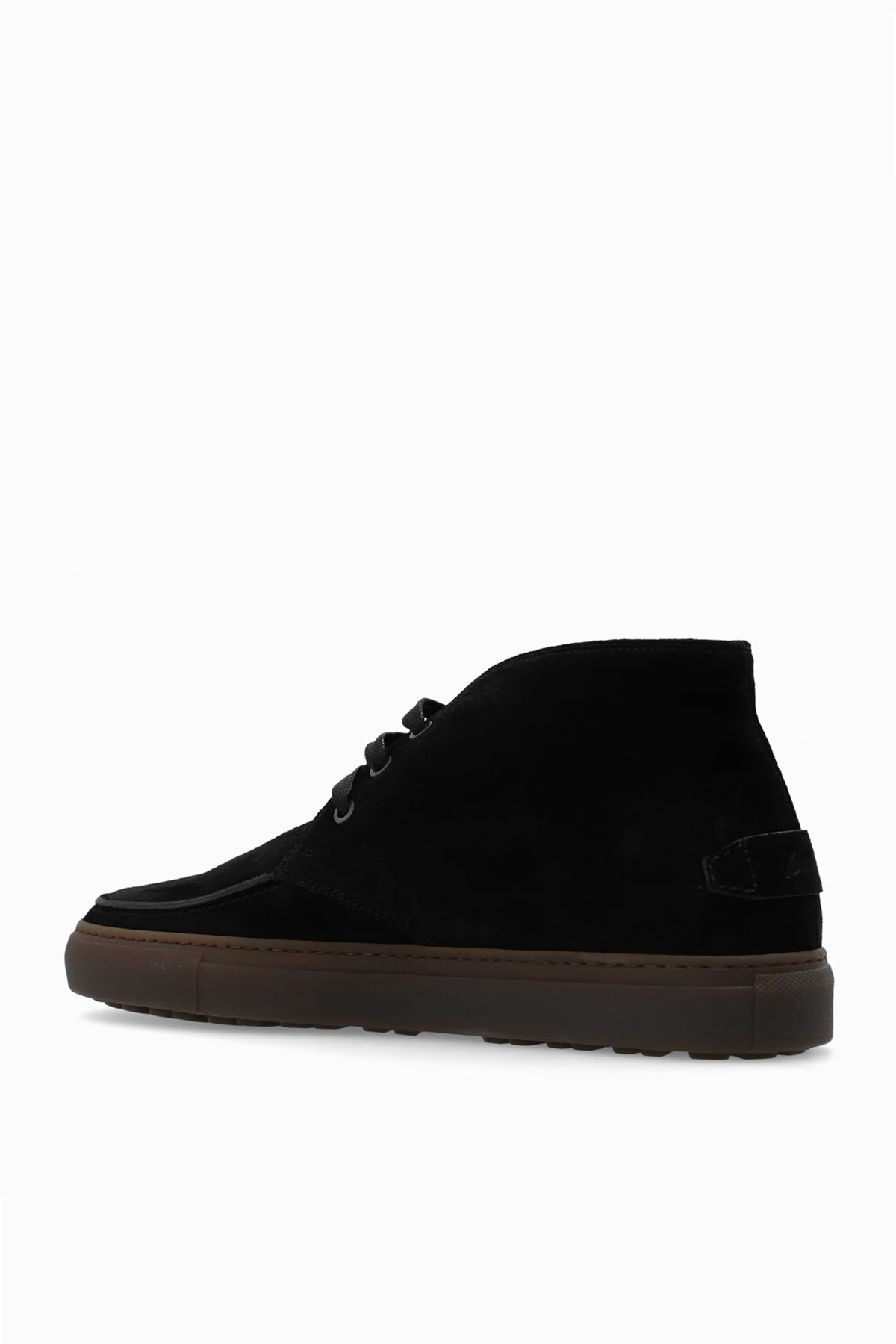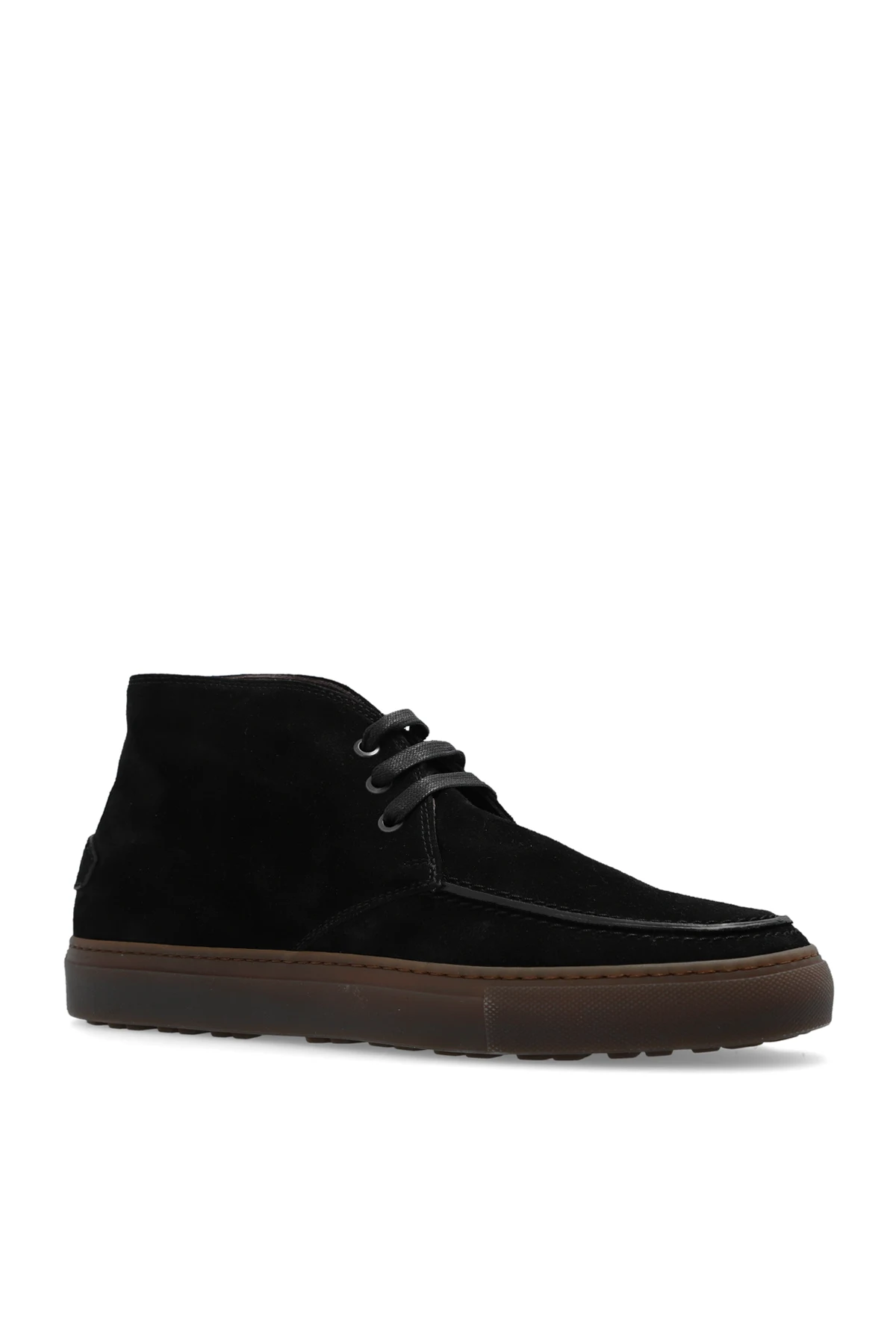 Brown lace-up ankle boots from Brioni. Made of suede, this pair features an embossed logo at the back and a brown rubber sole.